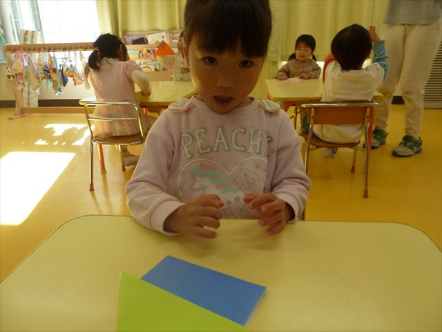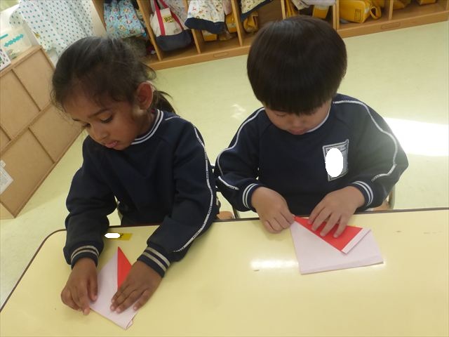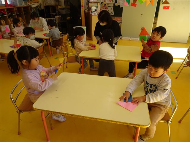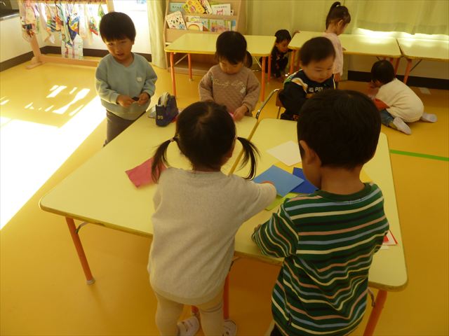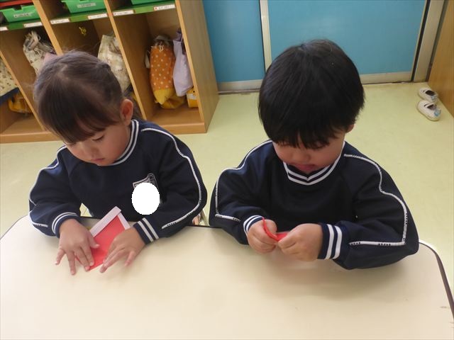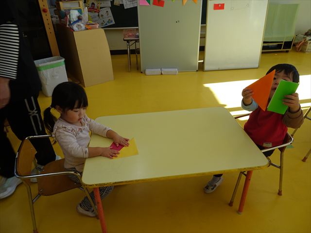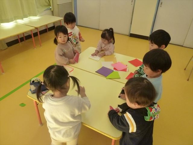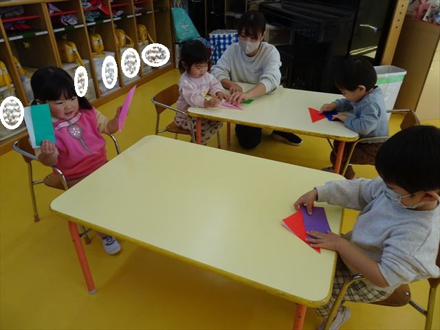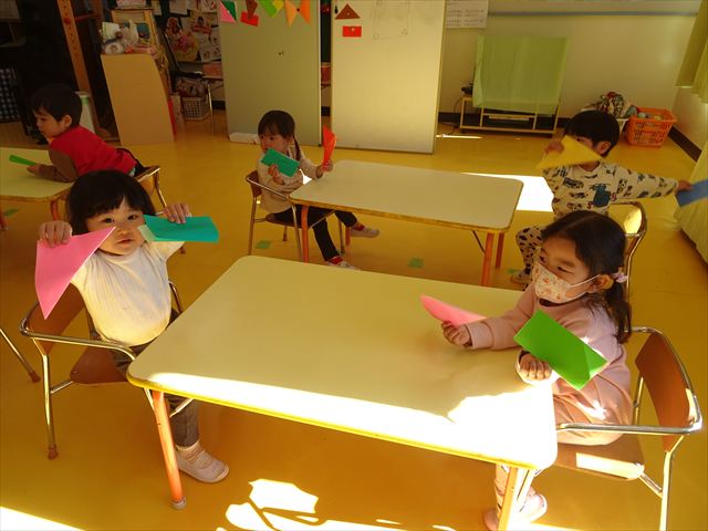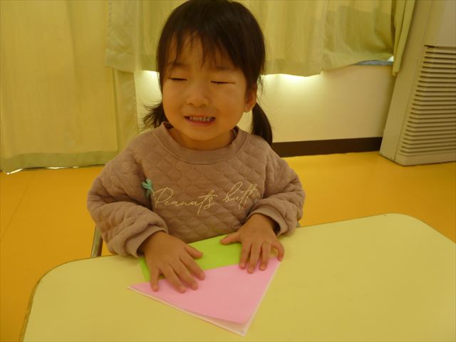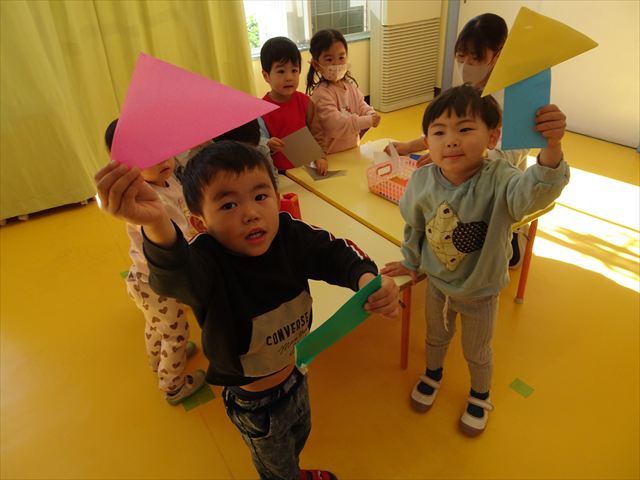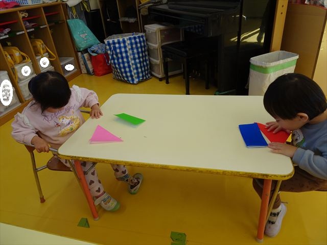 その後、主体性の時間でも折り紙遊びをしました。三角と四角を組み合わせるとちょうちょやハートが出来ることを伝えると、「つくりたーい!」とやる気満々のたんぽぽさん。好きな色を使って、たくさん作ってみました!中にはハートが折れる子もいて、お友だちに教えてあげながら一緒に作っていました☆作ったものは今日持ち帰りましたので、何を作ったのかお子さんに聞いてみてください(