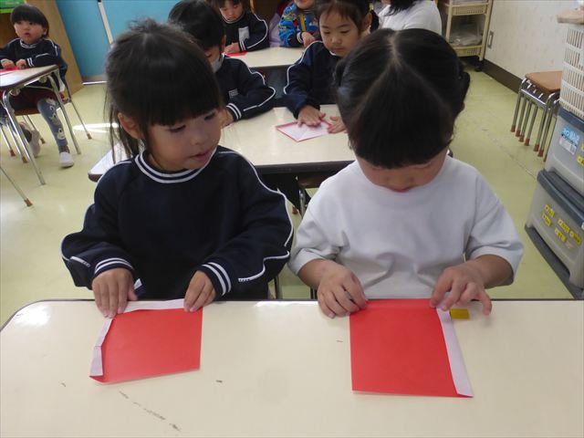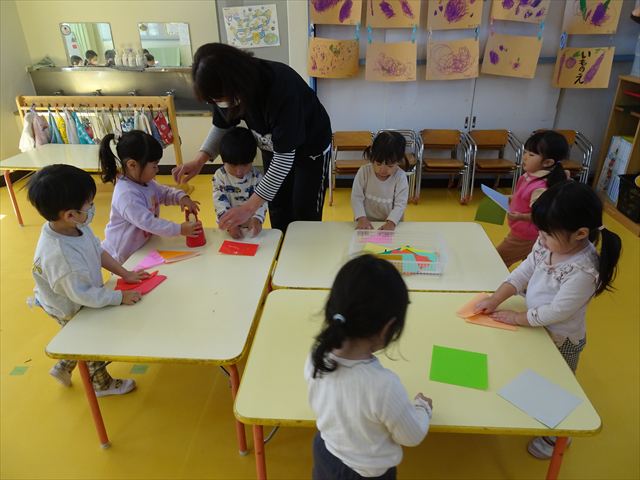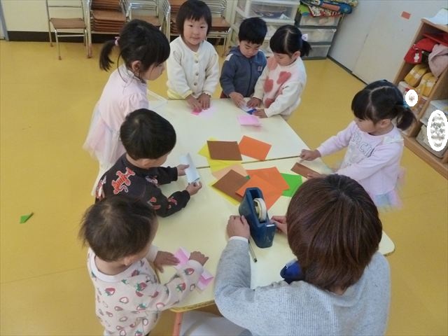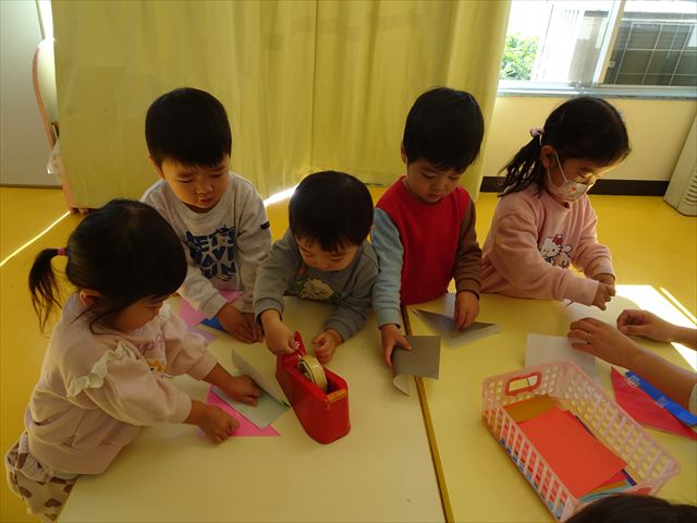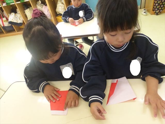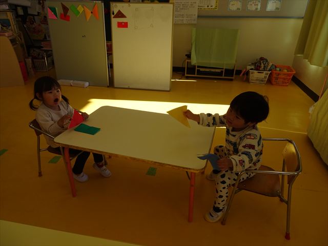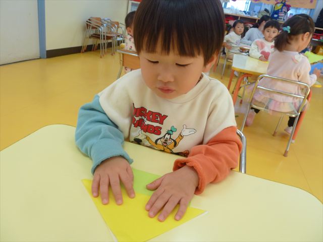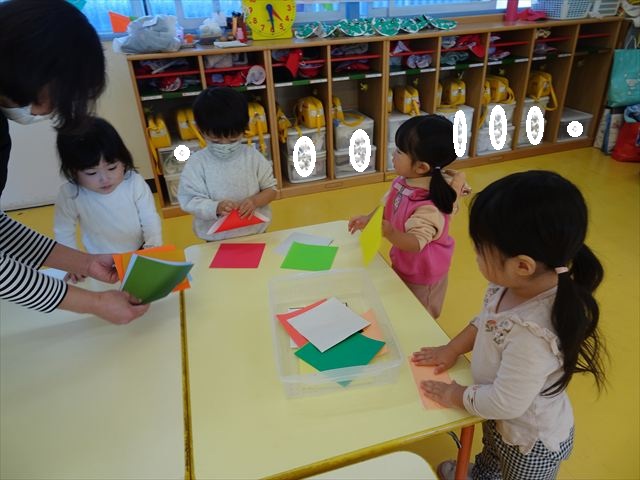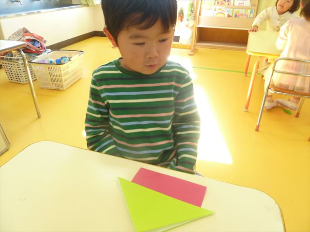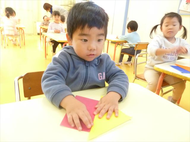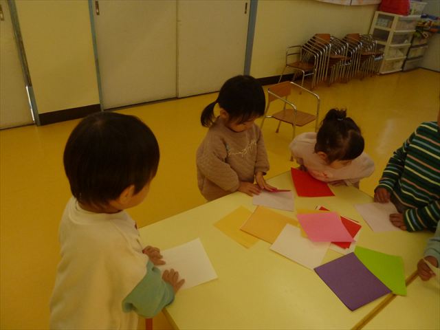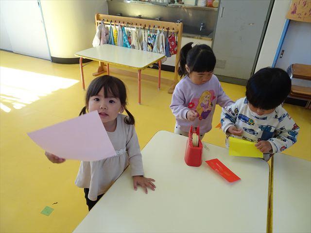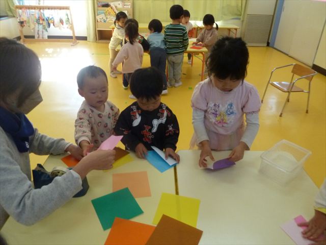 その後、主体性の時間でも折り紙遊びをしました。三角と四角を組み合わせるとちょうちょやハートが出来ることを伝えると、「つくりたーい!」とやる気満々のたんぽぽさん。好きな色を使って、たくさん作ってみました!中にはハートが折れる子もいて、お友だちに教えてあげながら一緒に作っていました☆作ったものは今日持ち帰りましたので、何を作ったのかお子さんに聞いてみてください(