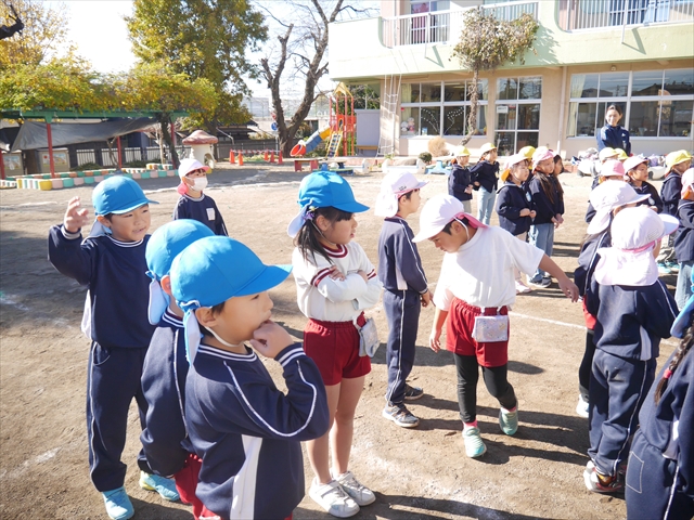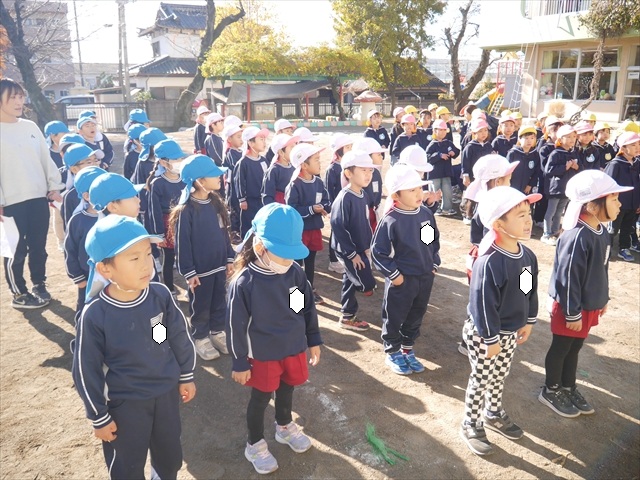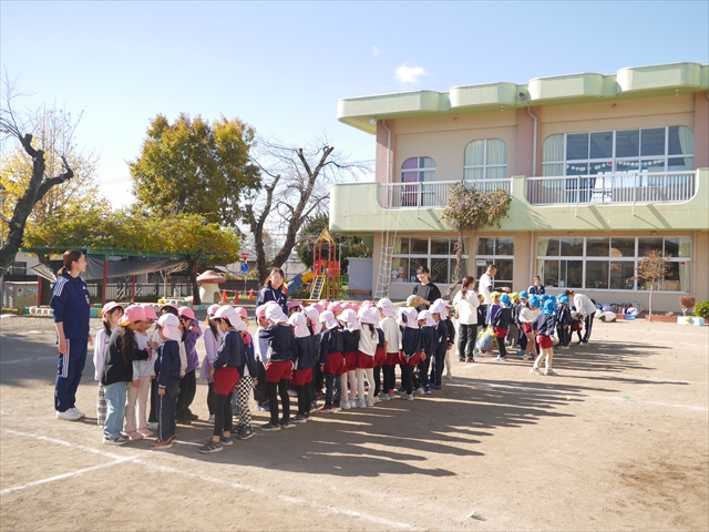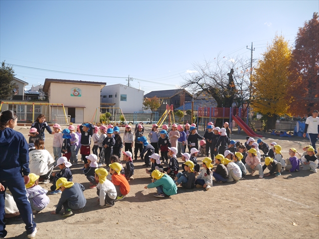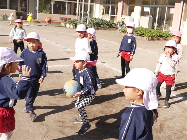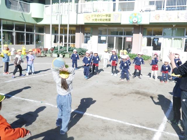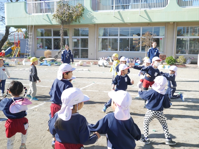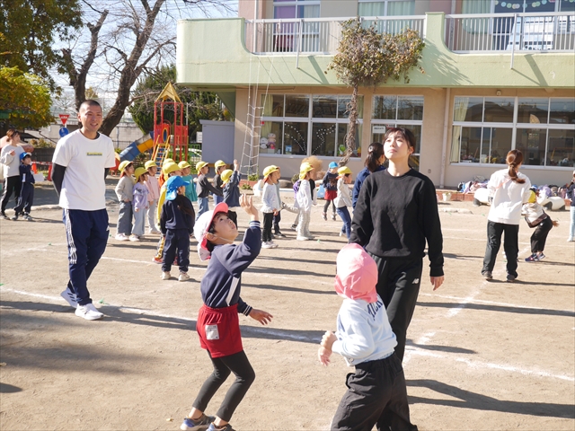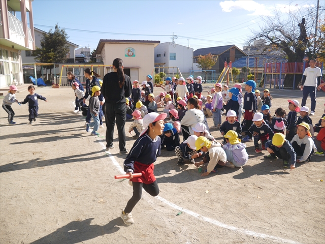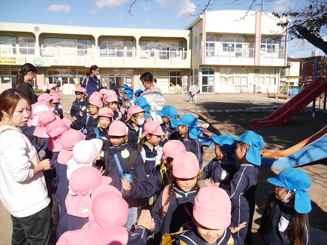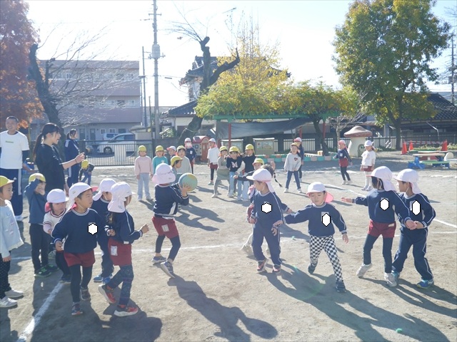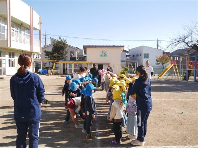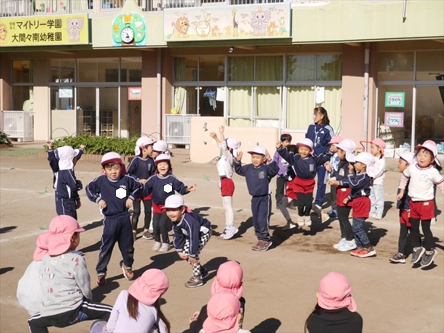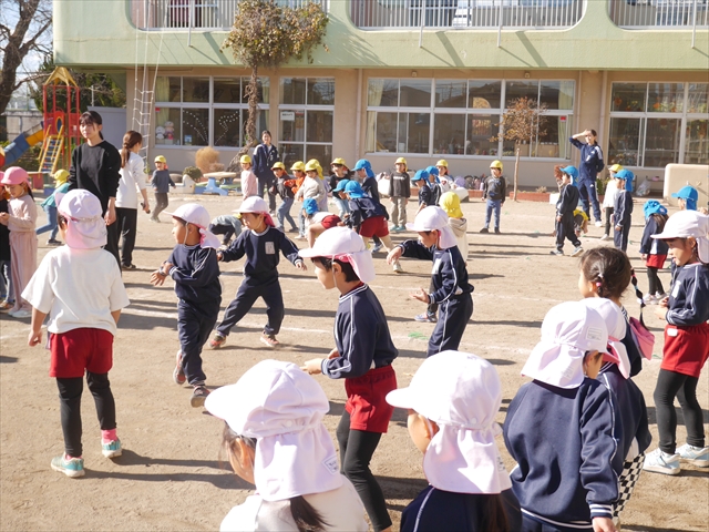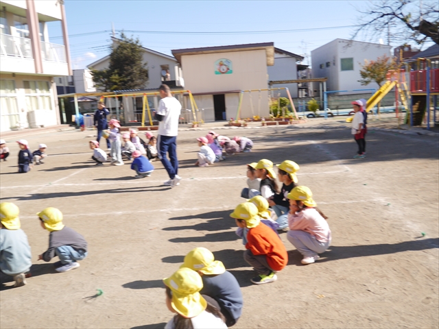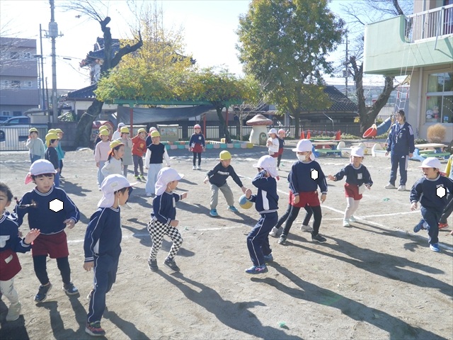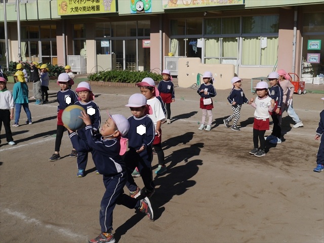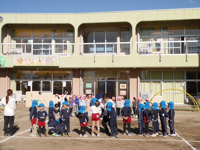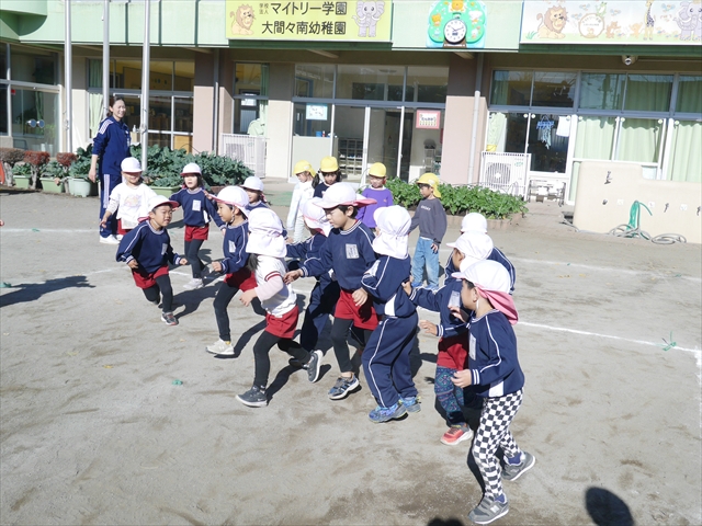 今日は風がちょっとありましたが、陽だまりは暖かく遊ぶには絶好の天気でした。そうした中、年長さんたちは、「他園交流」行事として今年度も「阿左美幼稚園との交流会」を行いました。阿左美幼稚園は、数週間前はインフルエンザが猛威を振るい30名以上も欠席者が出てしまったそうですが、今はインフルエンザも収束し今日は全園児が来園してくれました。阿左美幼稚園の年長さん(45名)は、わざわざ東武鉄道の電車に乗って歩いて遊びに来てくれました!天気がいいので、園庭でマイトリーの子どもたちと思い切り遊ぶこどができました。交流会では、阿左美幼稚園の子どもたちと「ドッジボール大会」をしたり、両幼稚園混合の2チームに分かれてリレーをしたり、一緒におやつを食べたり、2園の子どもたちが楽しい交流を深めました!(^_^)/ \(^_^)/