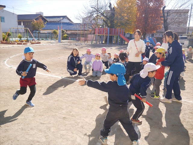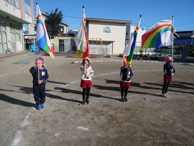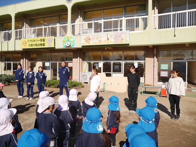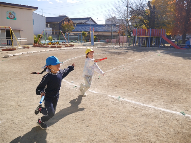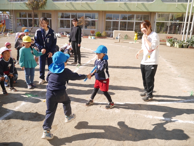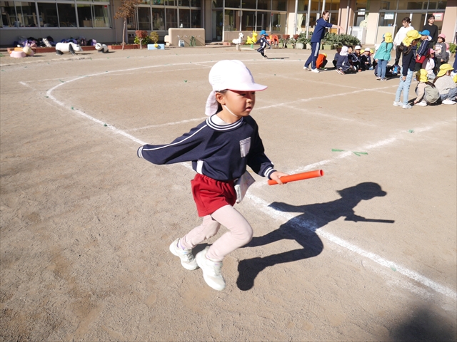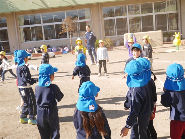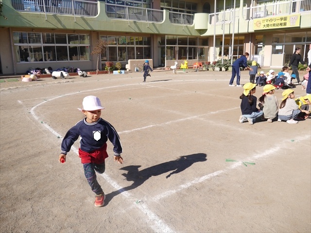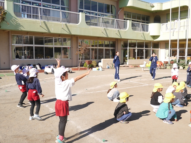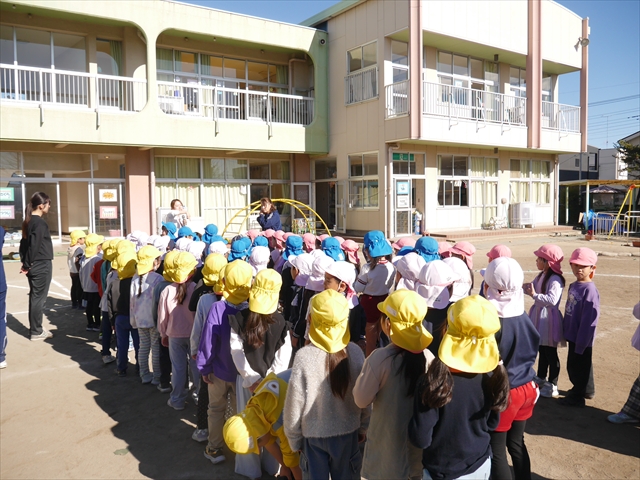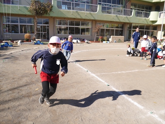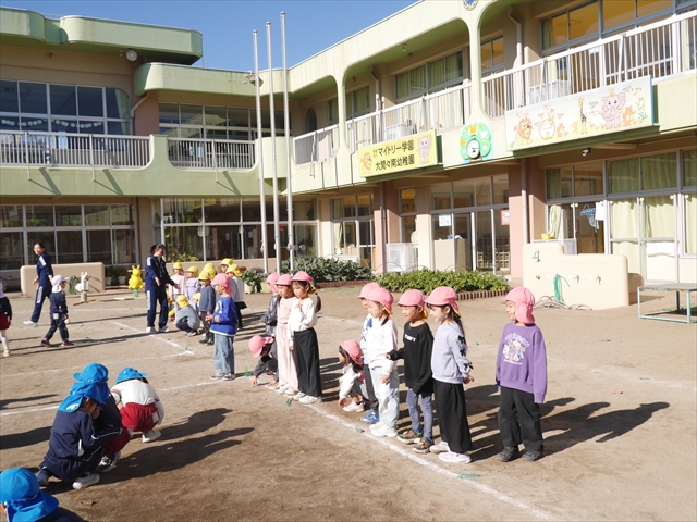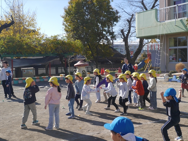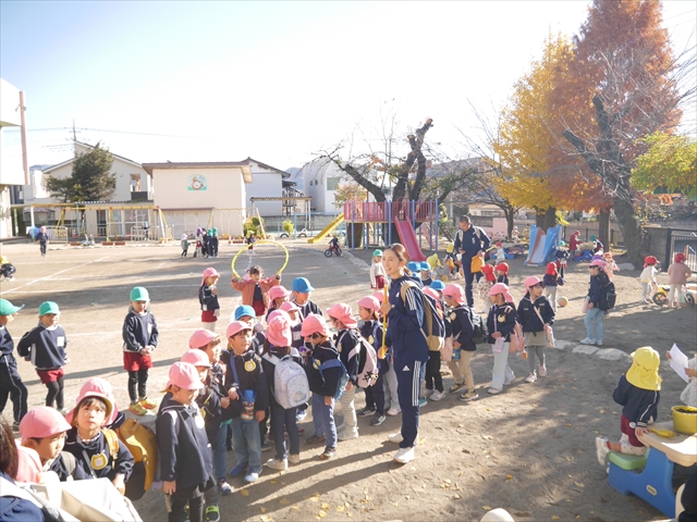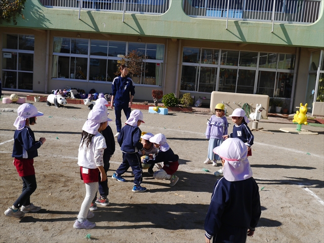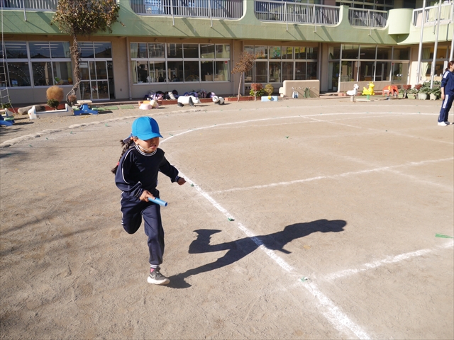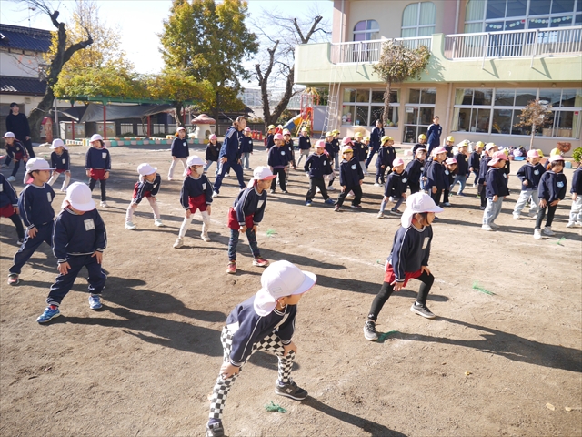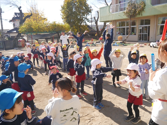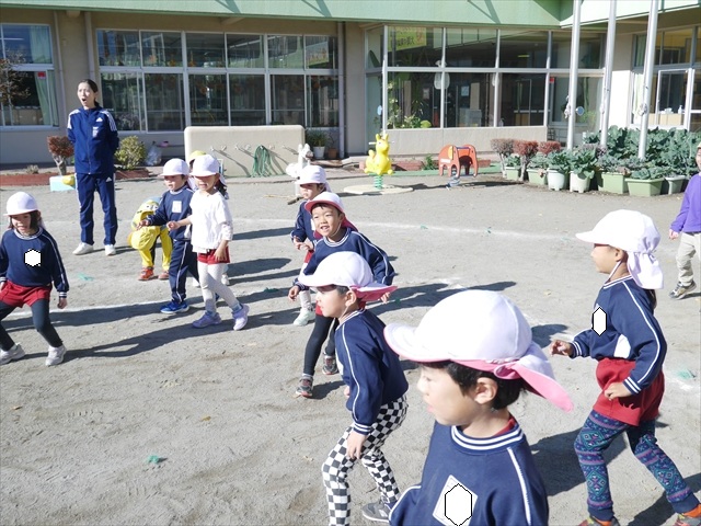 今日は風がちょっとありましたが、陽だまりは暖かく遊ぶには絶好の天気でした。そうした中、年長さんたちは、「他園交流」行事として今年度も「阿左美幼稚園との交流会」を行いました。阿左美幼稚園は、数週間前はインフルエンザが猛威を振るい30名以上も欠席者が出てしまったそうですが、今はインフルエンザも収束し今日は全園児が来園してくれました。阿左美幼稚園の年長さん(45名)は、わざわざ東武鉄道の電車に乗って歩いて遊びに来てくれました!天気がいいので、園庭でマイトリーの子どもたちと思い切り遊ぶこどができました。交流会では、阿左美幼稚園の子どもたちと「ドッジボール大会」をしたり、両幼稚園混合の2チームに分かれてリレーをしたり、一緒におやつを食べたり、2園の子どもたちが楽しい交流を深めました!(^_^)/ \(^_^)/