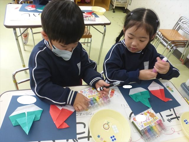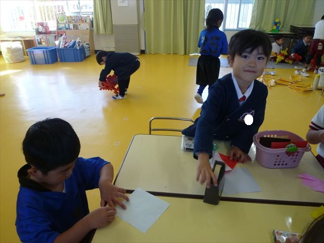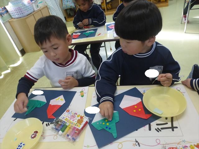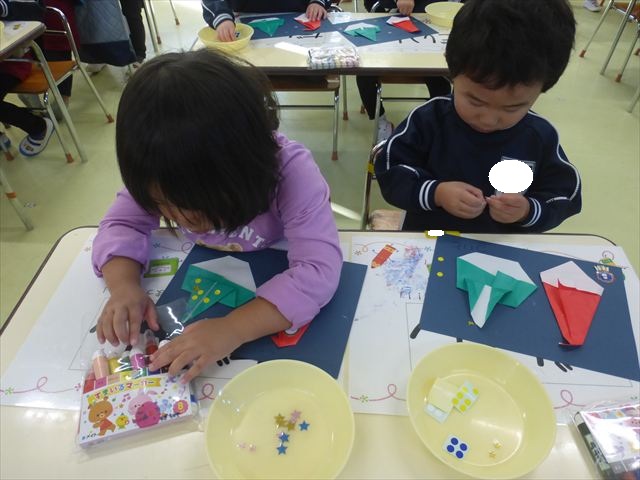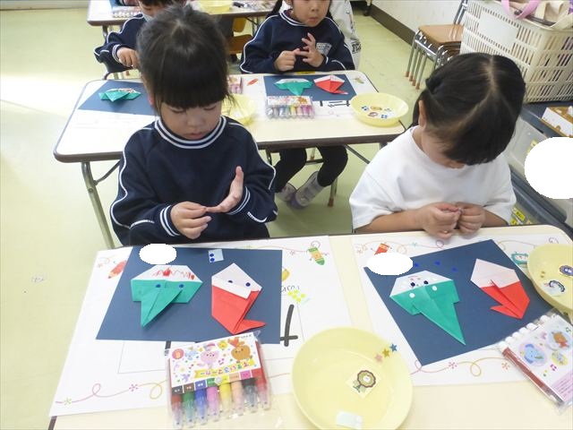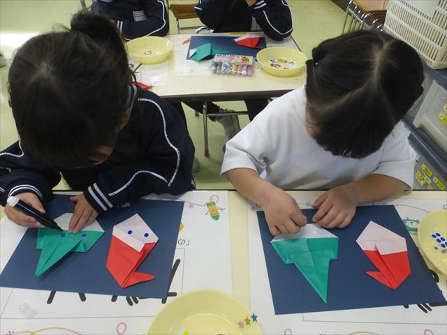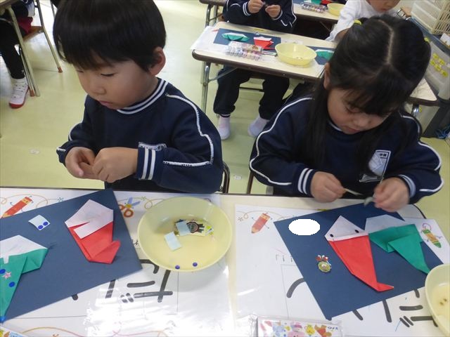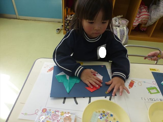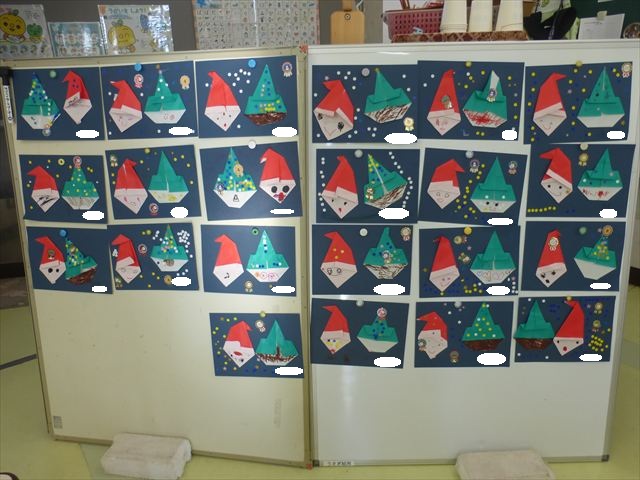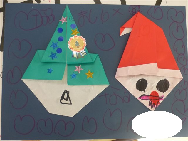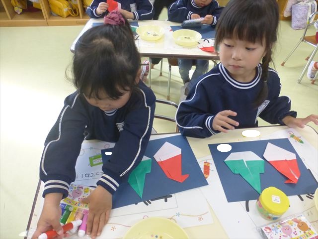 今日の年少組の「主体性の時間」の活動は「折り紙製作≪クリスマス≫をしました。まずはみんなと一緒にサンタクロースとツリーの折り紙をしました。ここからが本題と言うことで、そのあと、サンタクロースとツリーを色画用紙に貼って、シールを使ったり、マジックで描いたりして、「クリスマス」を完成させました(^^)マジックで模様を描く子、ツリーにきれいに飾りつけをする子、それぞれ考え、工夫が見られすてきな作品が完成しました(^^)