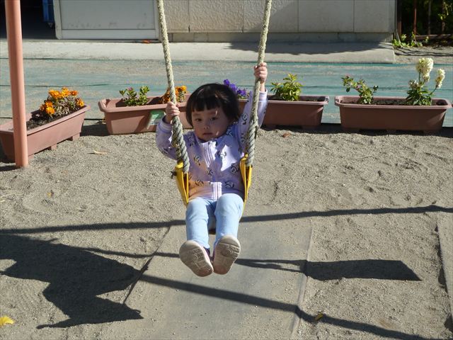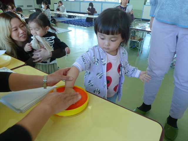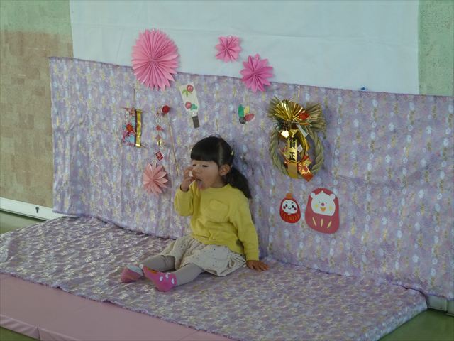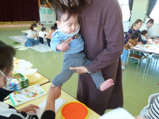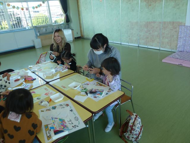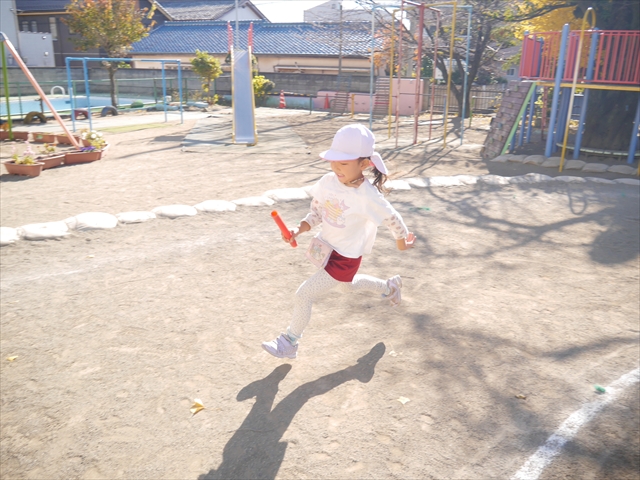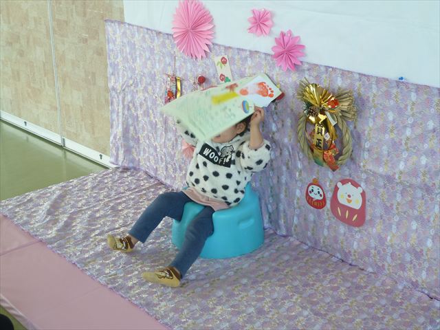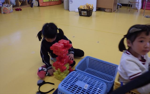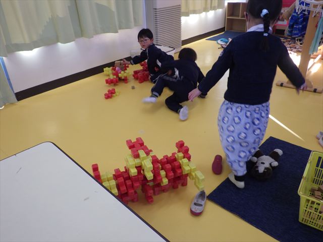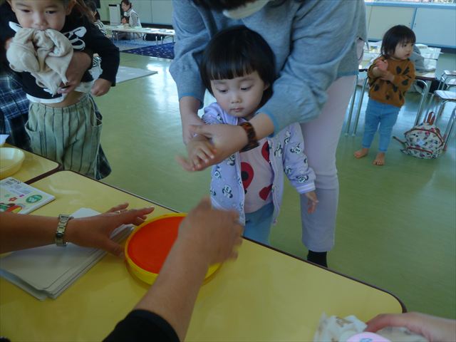 午後は、自由保育の時間をしました。今回は、運動会のときのカードを使って、カード遊びをしました。まず、小さいカードでかるたをしました。「先生が言った(出した)札と同じカードを取るのがかるただよ」と説明をして、実際にやってみました。初めはカードを取るのに少し躊躇する様子も見られましたが、慣れてくるとバシバシ取っていけるようになりました。たまにお手付きの札を出すと「ちがうでしょ~!」とよく分かっているたんぽぽさんでした(