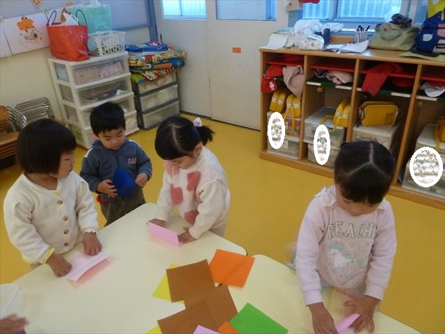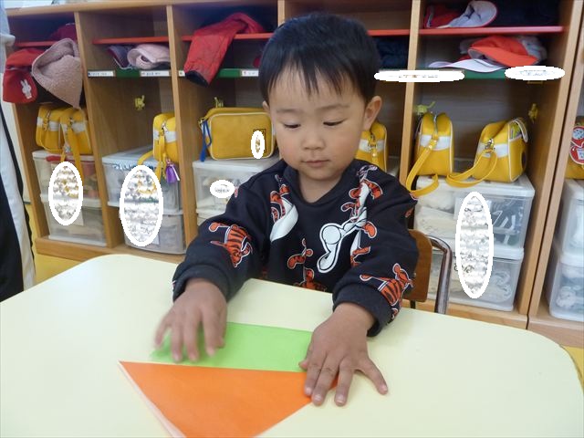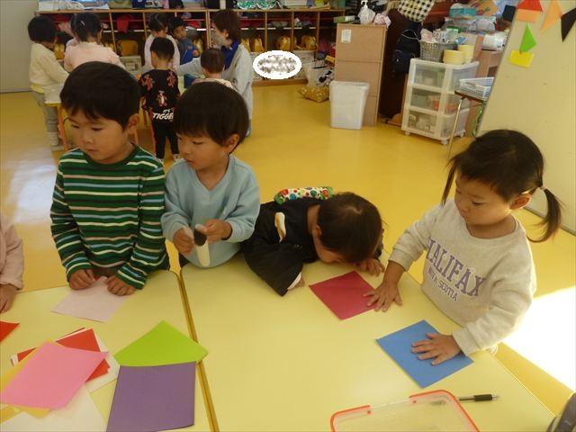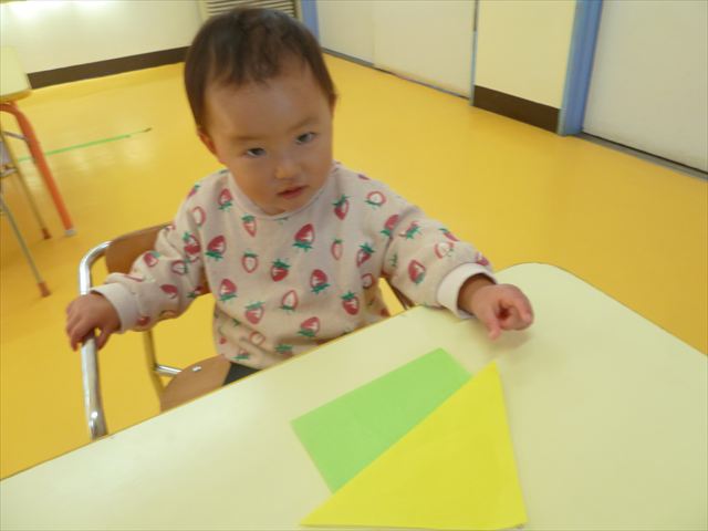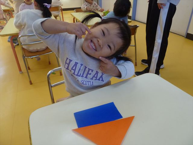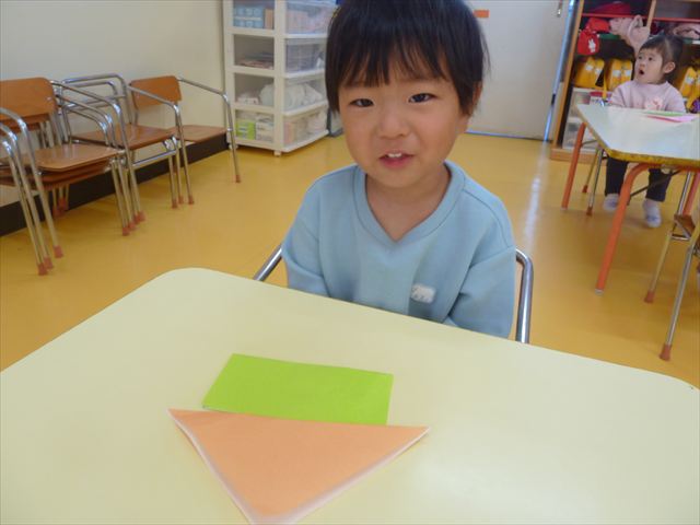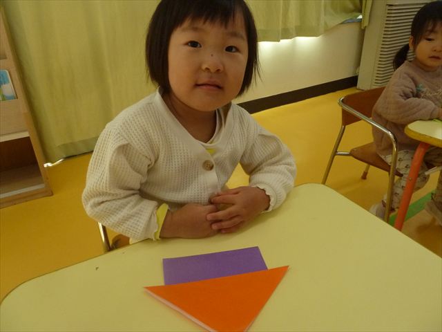 今日は、造形活動の時間で折り紙遊びをしました!今までは折り紙をちぎって遊んでいたので、本来の使い方の通り折って遊びました。折り紙の裏に〇や△の印をつけて、〇と〇がくっついたら三角に変身、〇と〇・△と△がくっついたら四角に変身をしてみました。そして、三角と四角を合わせて家が完成☆「おうちできたよ~!」と嬉しそうでした!(^^)!