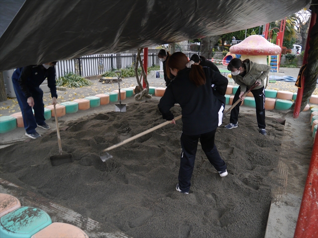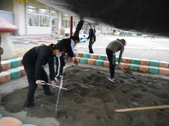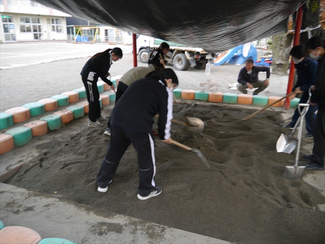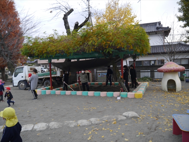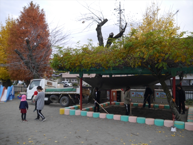 仕方ないので、今日またトラックで2tの砂を砂場に投入しました。これでまた楽しい「砂遊び」がいっぱいできると思います。子どもたち楽しんでください。でも、あまり砂を持ち出さないでね~!(^_^;)