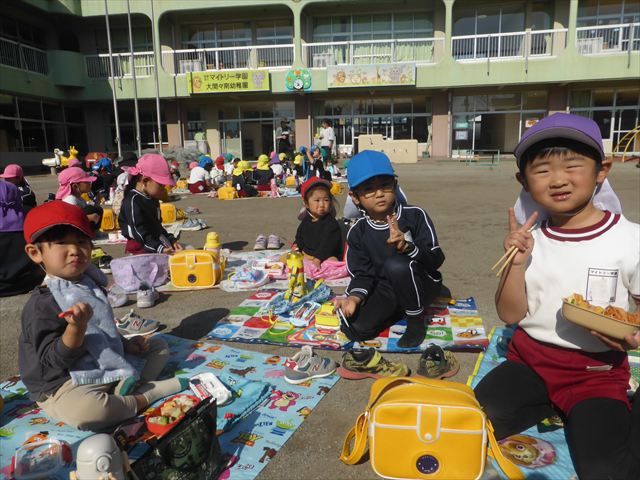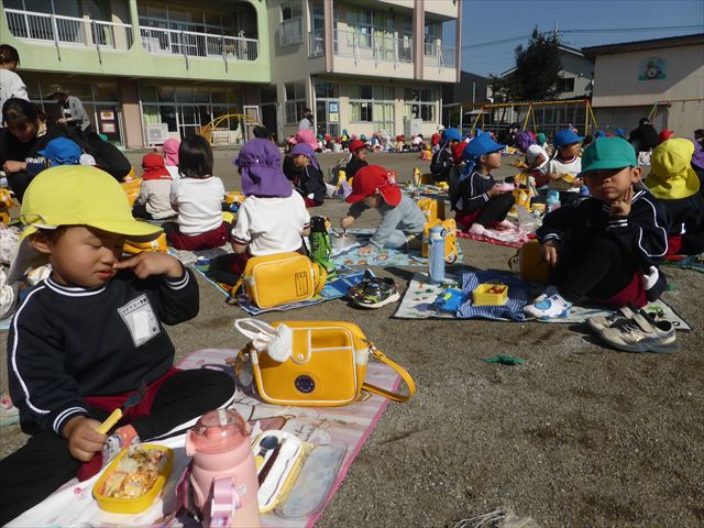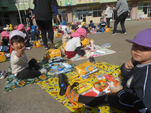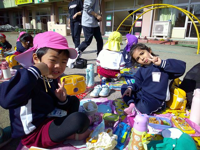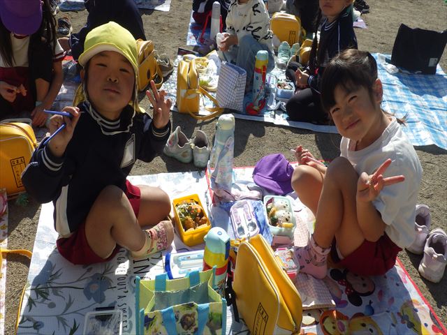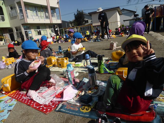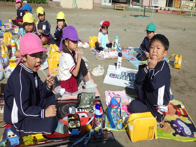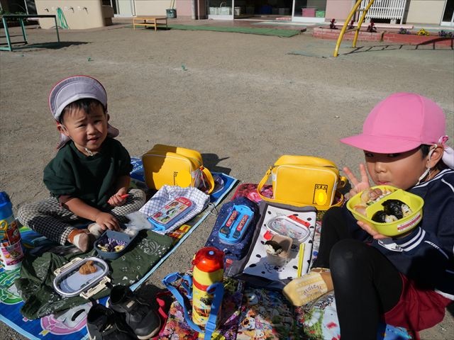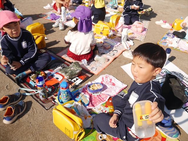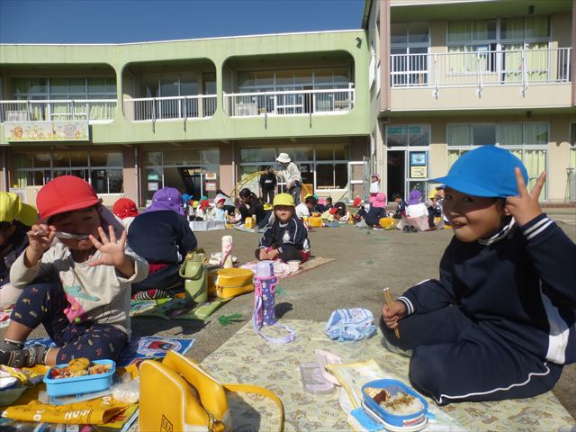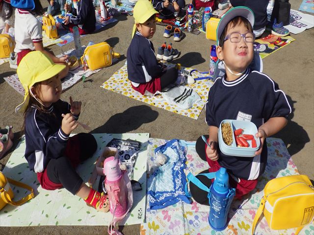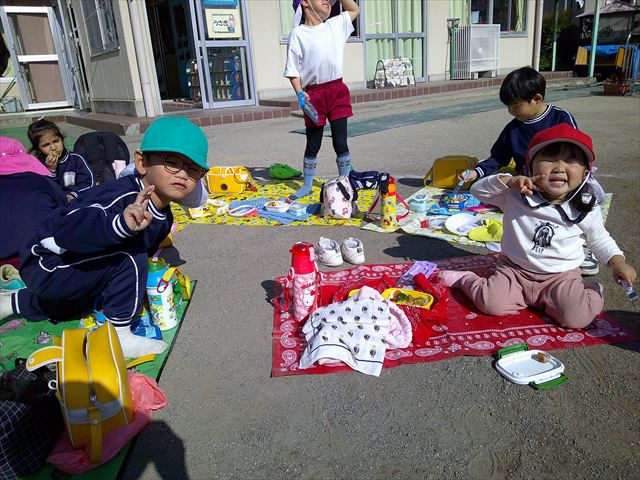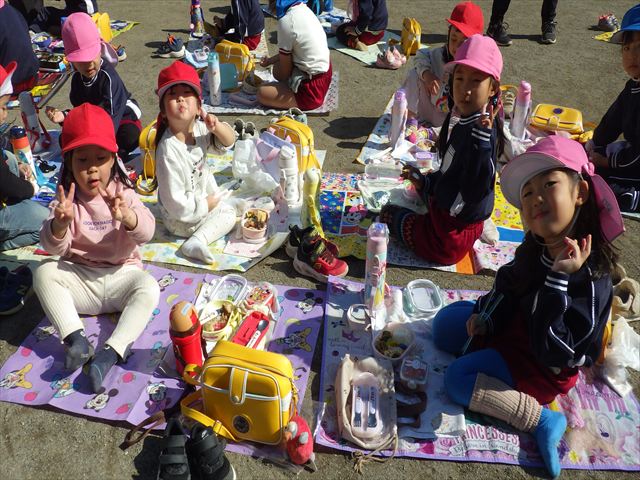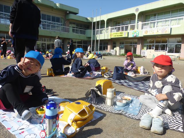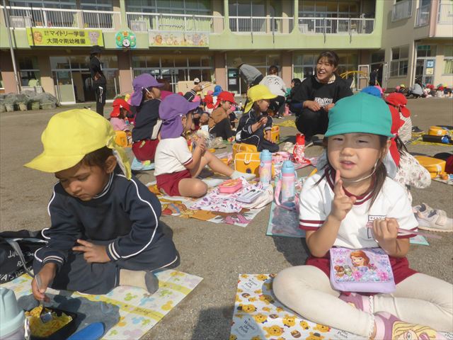 今日は、「ディスクドック」イベントあと、縦割り保育活動「会食」でした。秋の心地よい天候でしたので、園庭でみんな気持ち良く食べることができました。縦割りのバディの子と仲良くみんなで食べたので、「手作り弁当」も美味しさも倍増したようです!ごちそうさまでした!(^_^)b ヘ(^o^)/