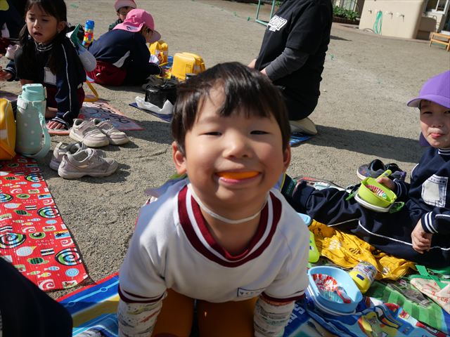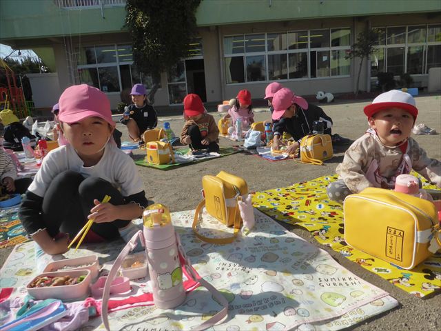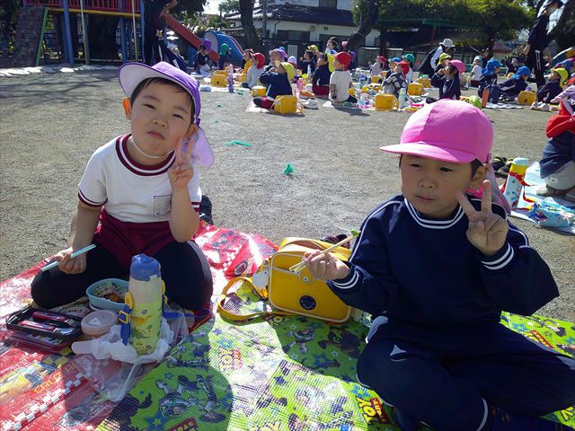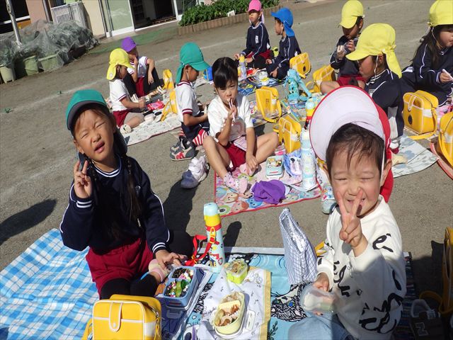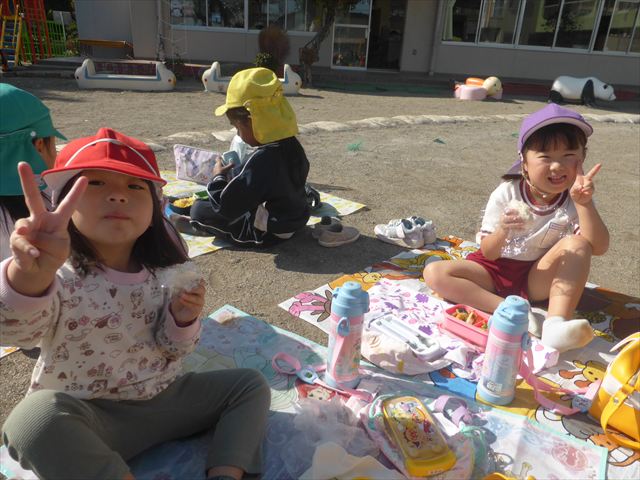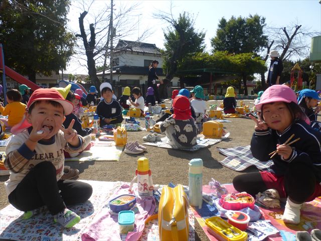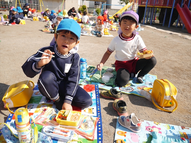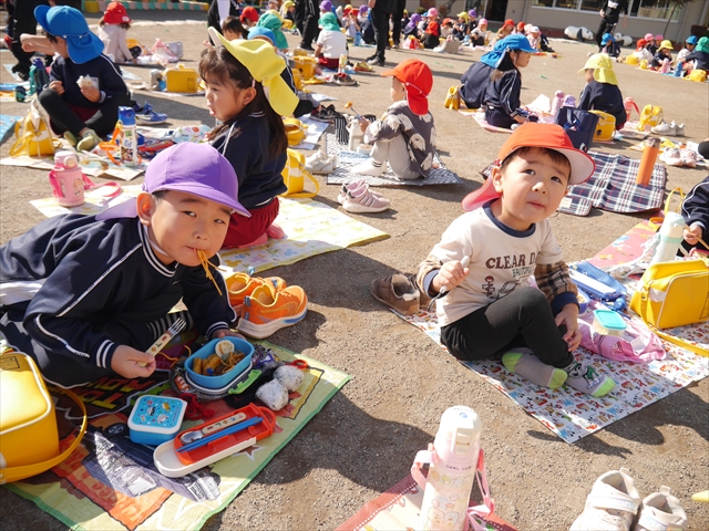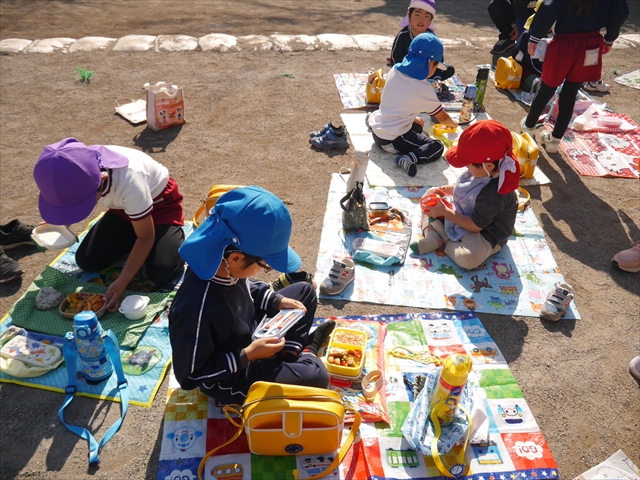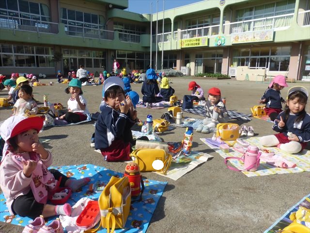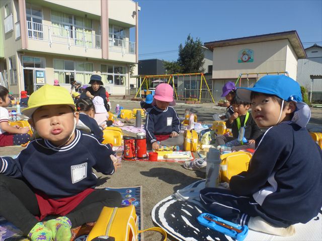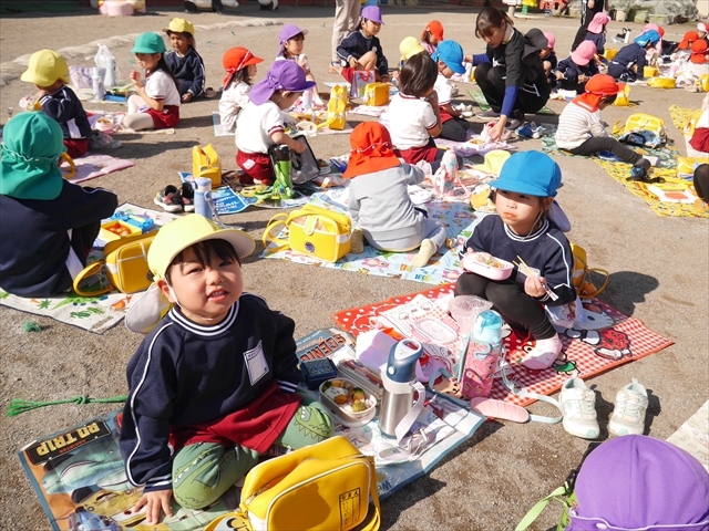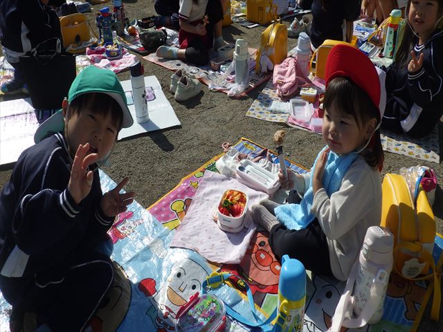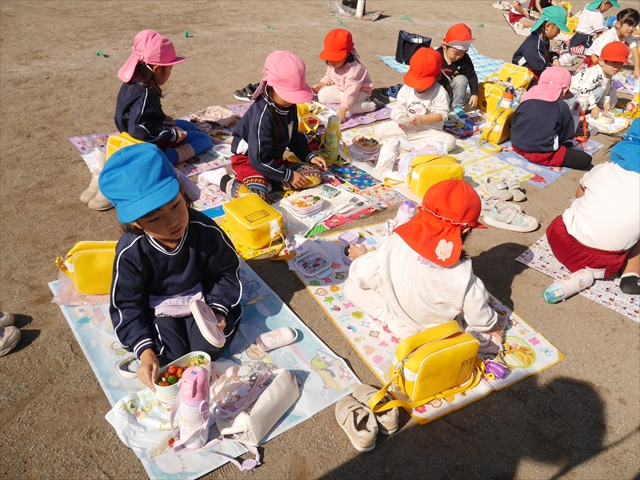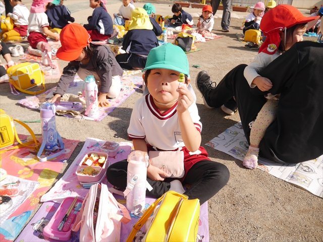 今日は、「ディスクドック」イベントあと、縦割り保育活動「会食」でした。秋の心地よい天候でしたので、園庭でみんな気持ち良く食べることができました。縦割りのバディの子と仲良くみんなで食べたので、「手作り弁当」も美味しさも倍増したようです!ごちそうさまでした!(^_^)b ヘ(^o^)/