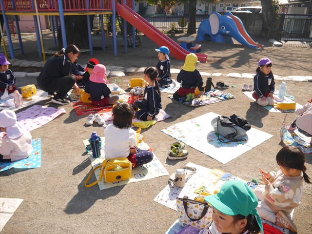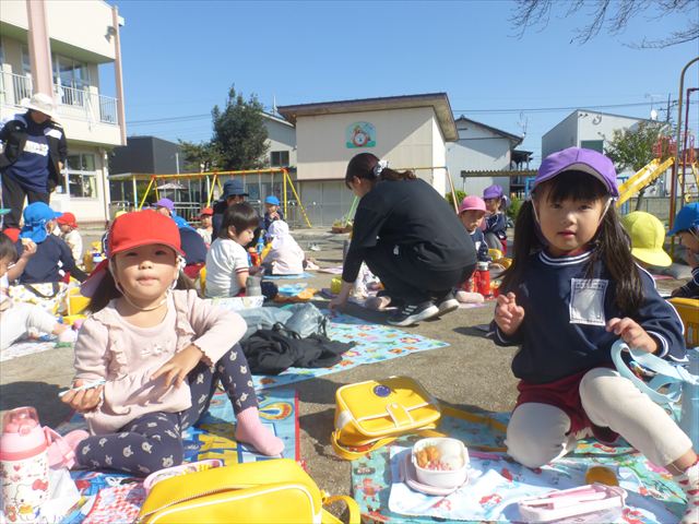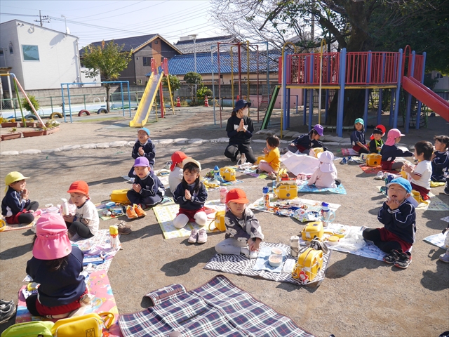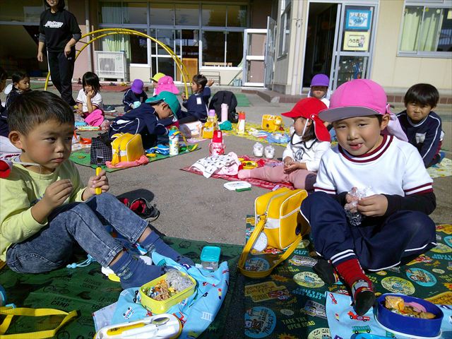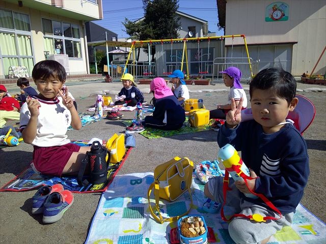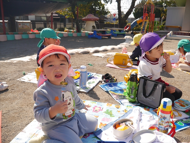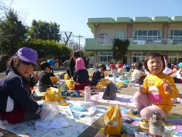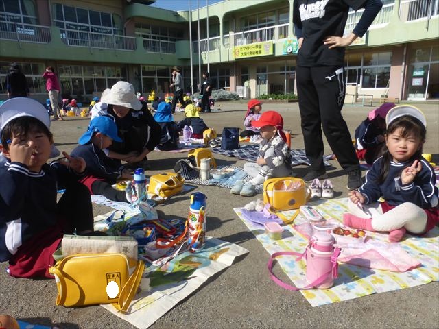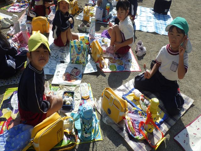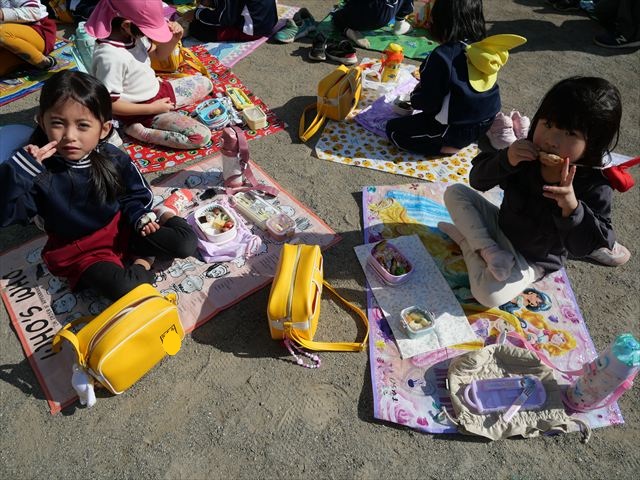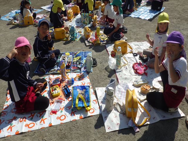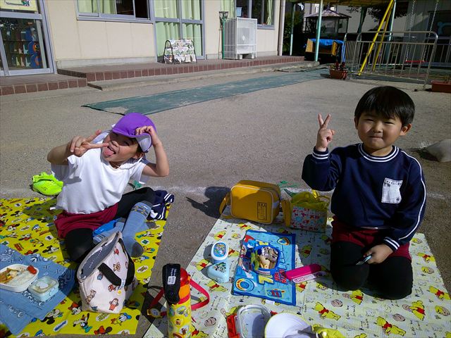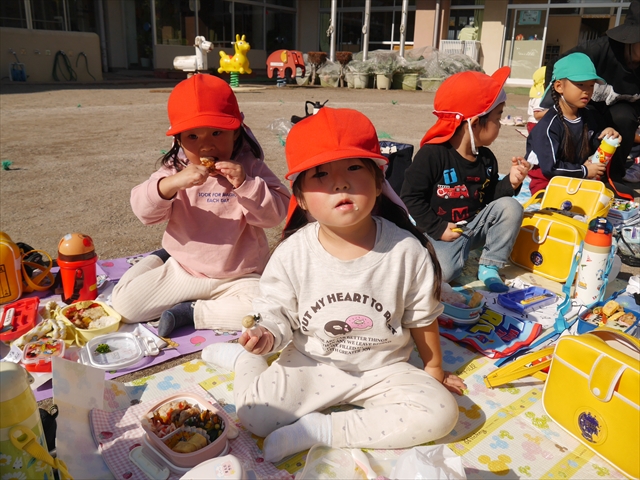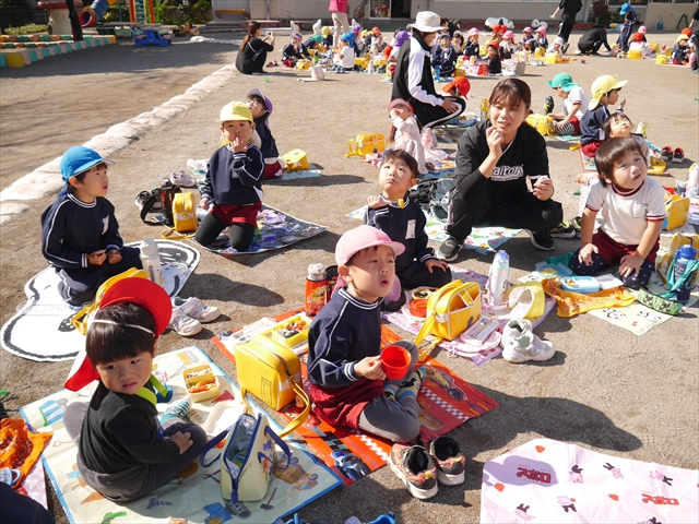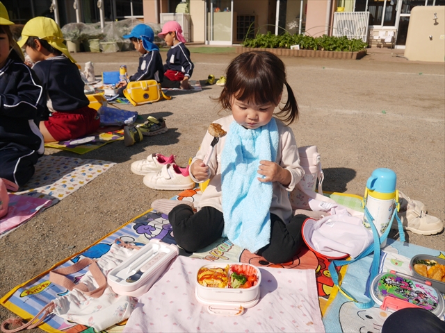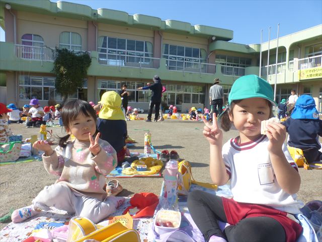 今日は、「ディスクドック」イベントあと、縦割り保育活動「会食」でした。秋の心地よい天候でしたので、園庭でみんな気持ち良く食べることができました。縦割りのバディの子と仲良くみんなで食べたので、「手作り弁当」も美味しさも倍増したようです!ごちそうさまでした!(^_^)b ヘ(^o^)/
