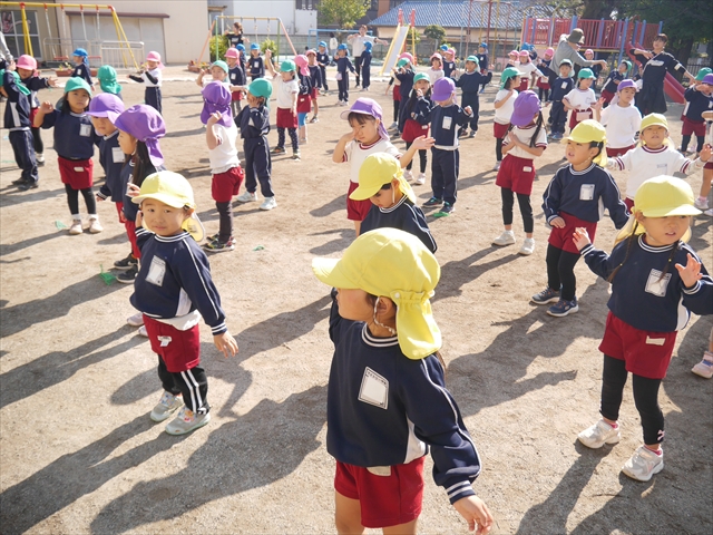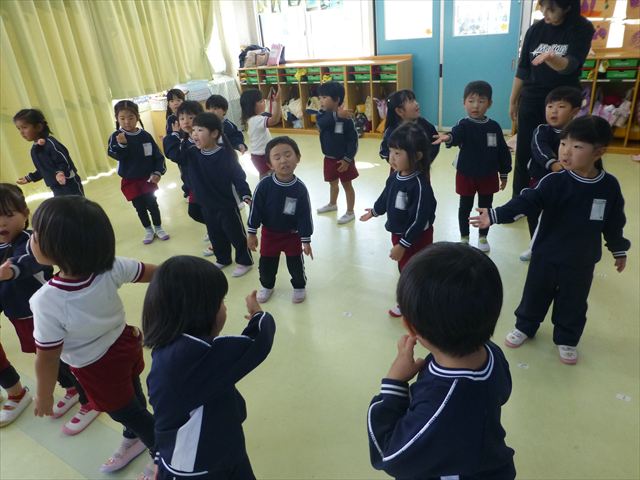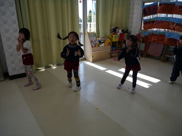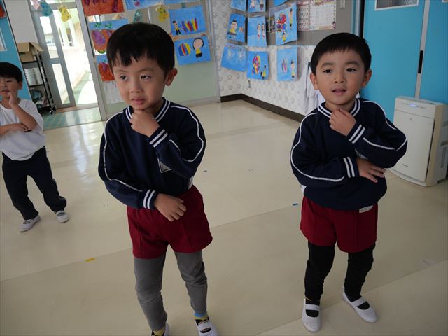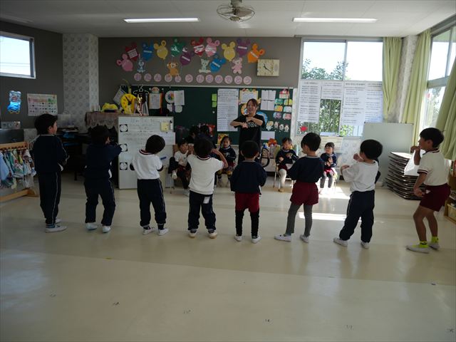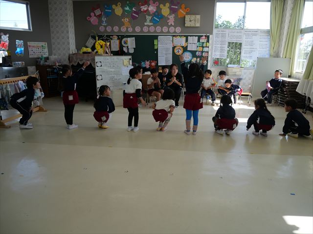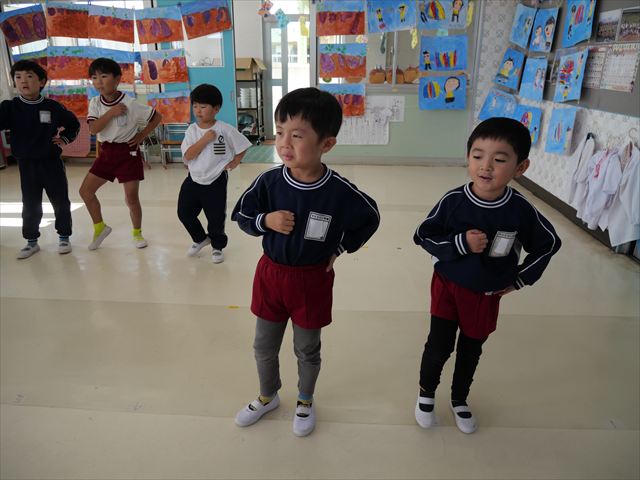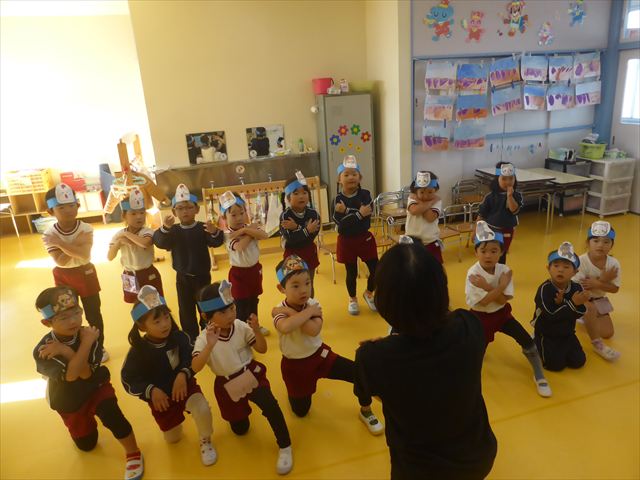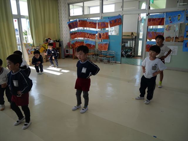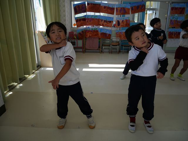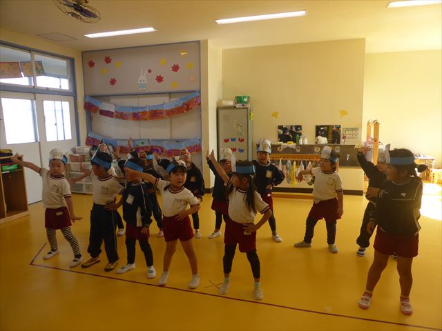 今日は朝から心地よい秋晴れの天気でした。園庭で子どもたちも気持ちよさそうに遊んでました。朝の活動では、久しぶりに「やんちゃ怪獣どっか~ん体操」をしました!みんな元気いっぱい体操を頑張りました!まる!(^
