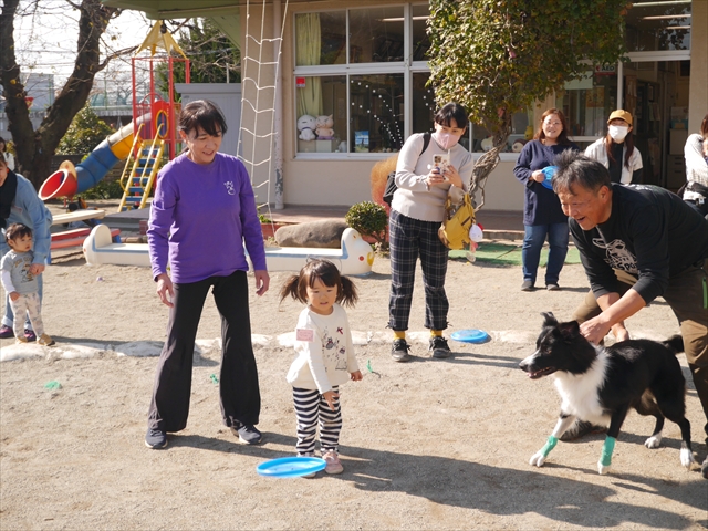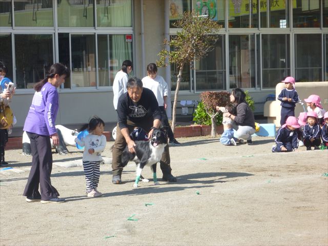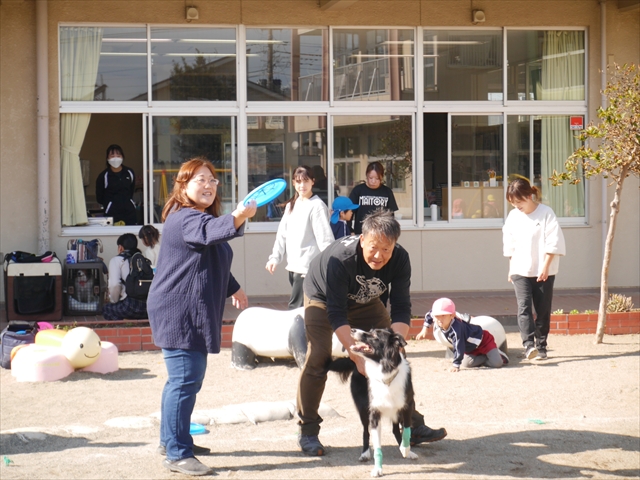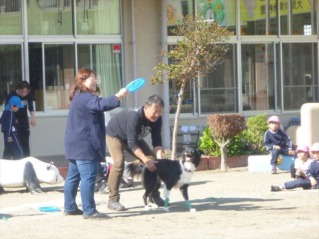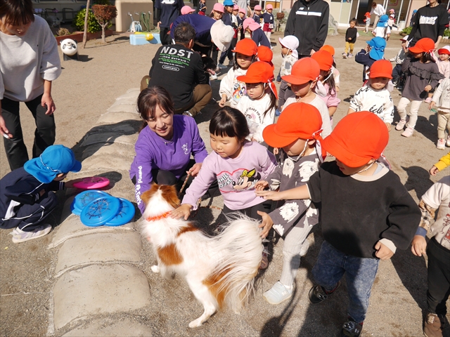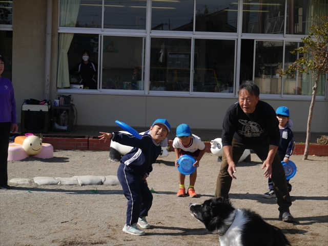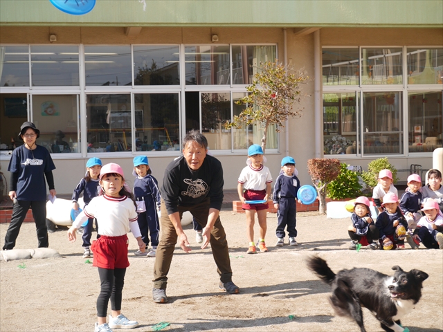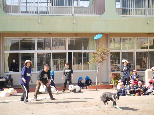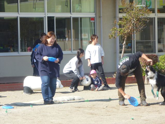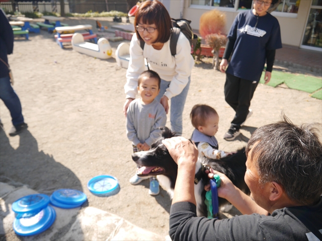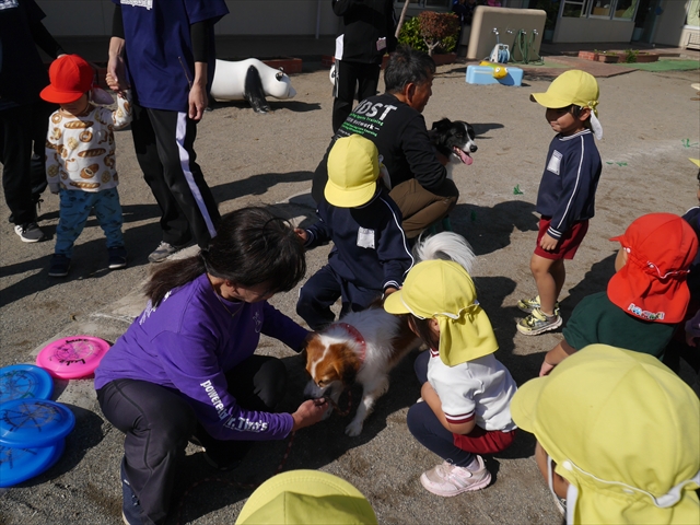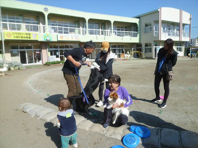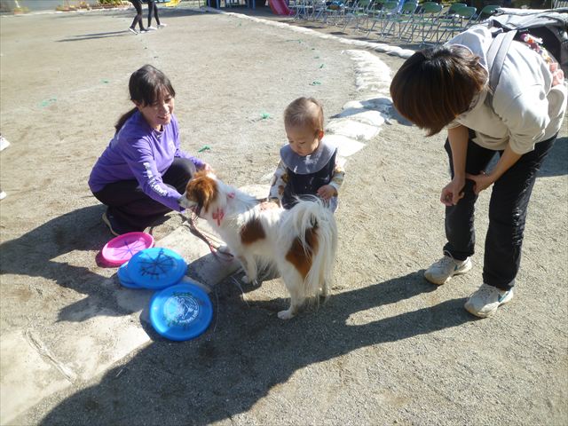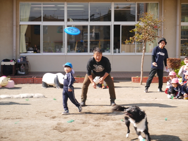 見ていた子どもたちも、さくらんぼクラブの親子の皆さんも、みんな大喜びで楽しい時間を過ごしました。また、園児を代表して年長さんが6名、そして先生方も代表の先生方がディスク・ドッグ体験をさせていただきました。良かったね~!!(^^)b さらにさくらんぼクラブに参加した方々や保護者の方々の希望者の方にも体験していただきました!みんなとっても上手に・・・??できましたかな!(^^;) ヘ(^o^)/ 最後はみんなでわんちゃんを「なでなでして、さよなら」をして終わりにしました!まる!(^^) (^_^)b