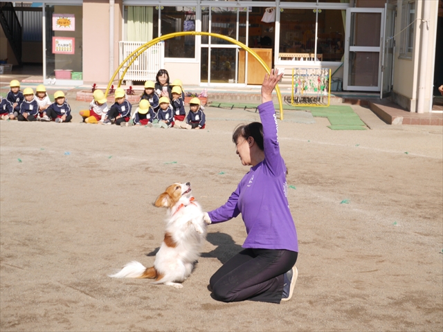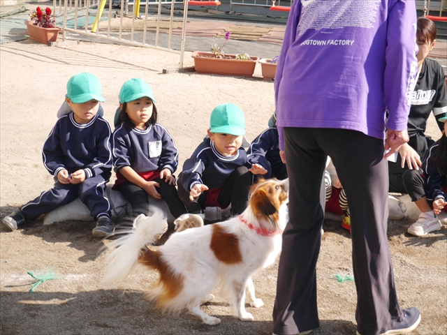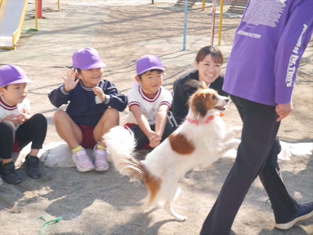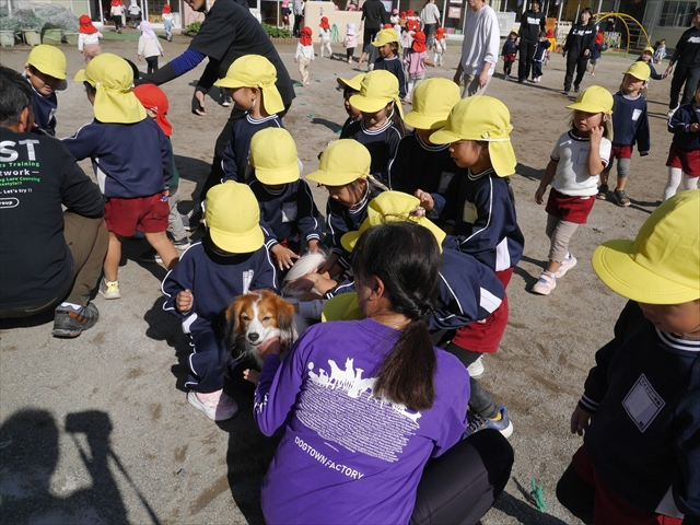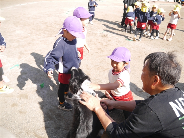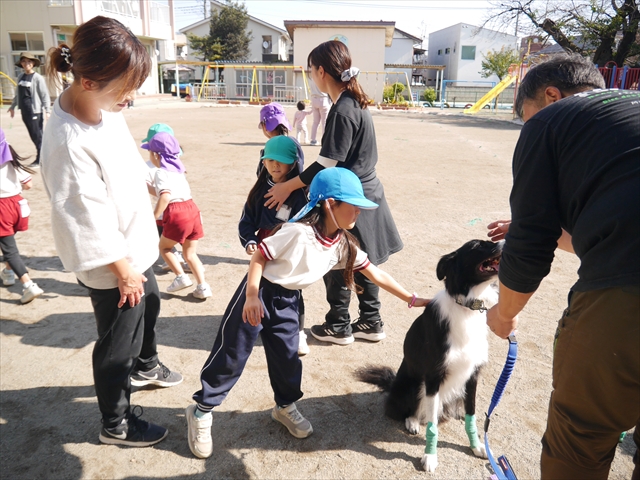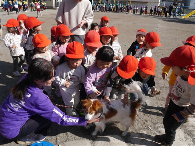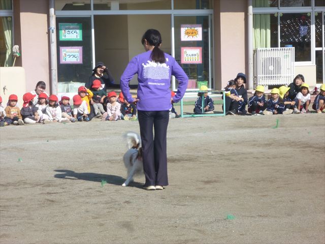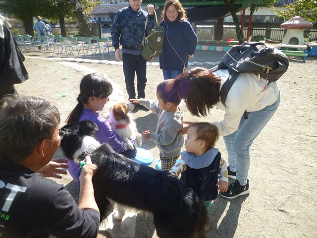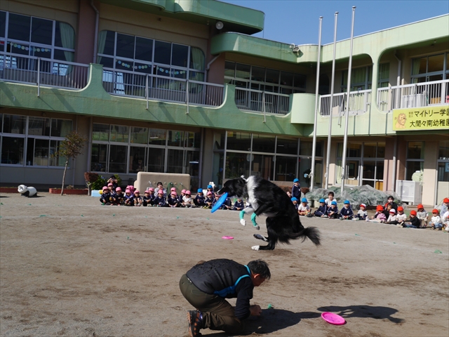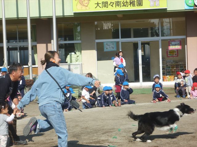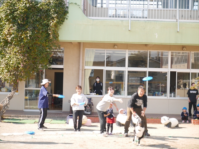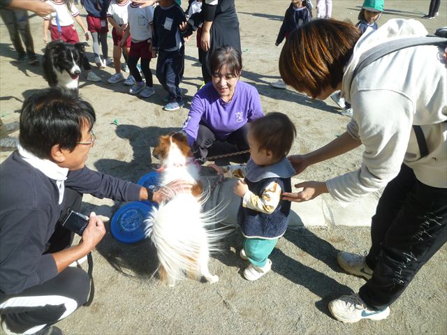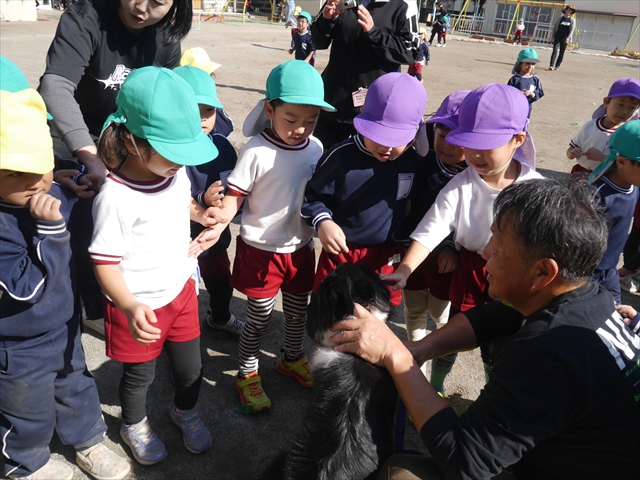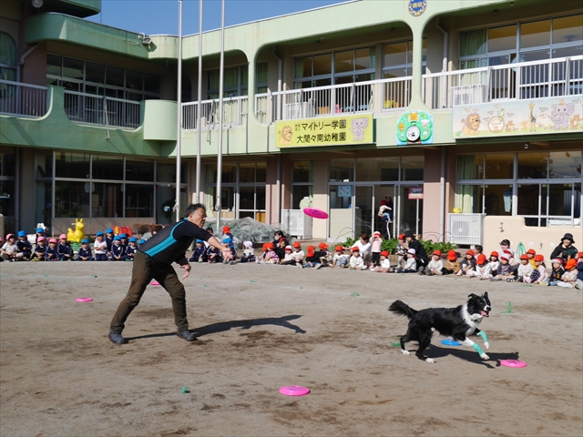 見ていた子どもたちも、さくらんぼクラブの親子の皆さんも、みんな大喜びで楽しい時間を過ごしました。また、園児を代表して年長さんが6名、そして先生方も代表の先生方がディスク・ドッグ体験をさせていただきました。良かったね~!!(^^)b さらにさくらんぼクラブに参加した方々や保護者の方々の希望者の方にも体験していただきました!みんなとっても上手に・・・??できましたかな!(^^;) ヘ(^o^)/ 最後はみんなでわんちゃんを「なでなでして、さよなら」をして終わりにしました!まる!(^^) (^_^)b