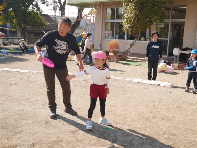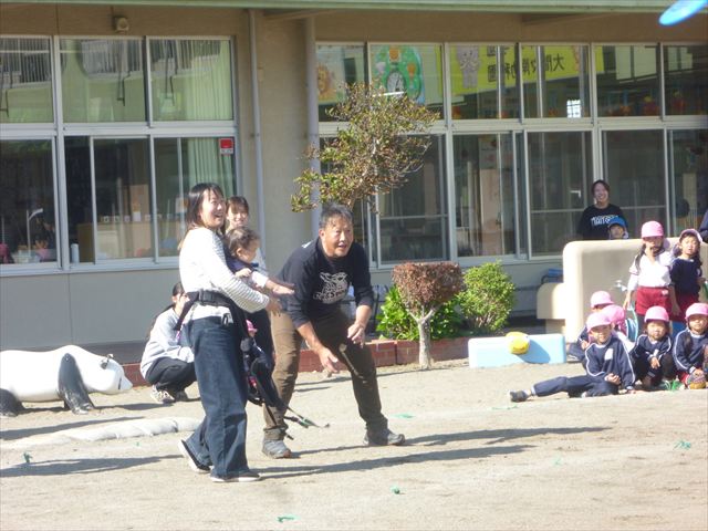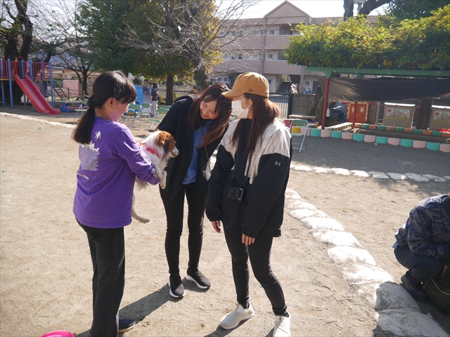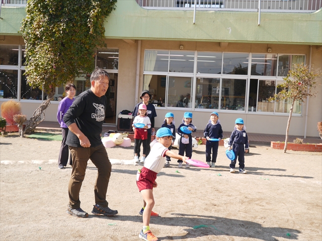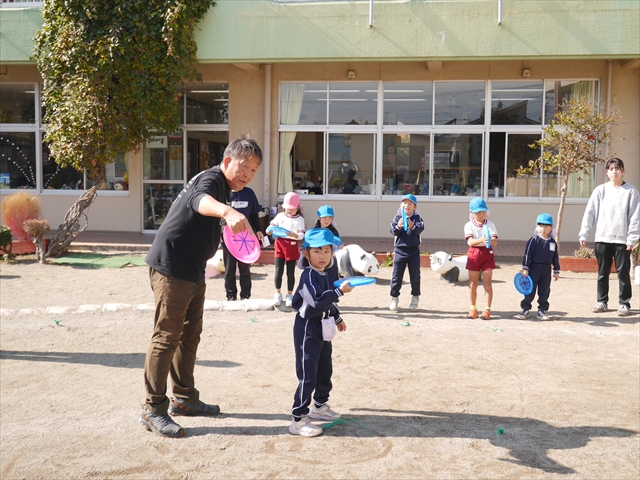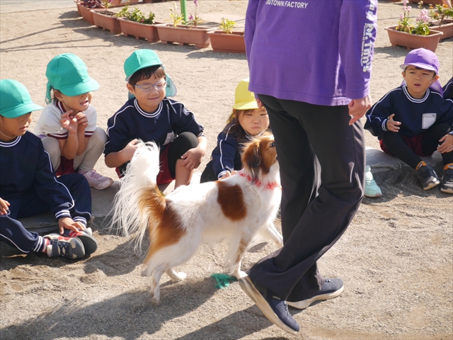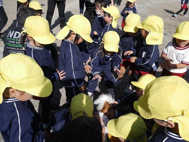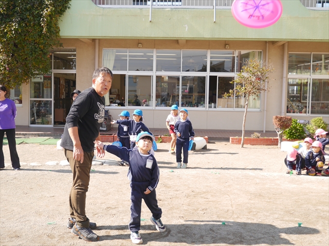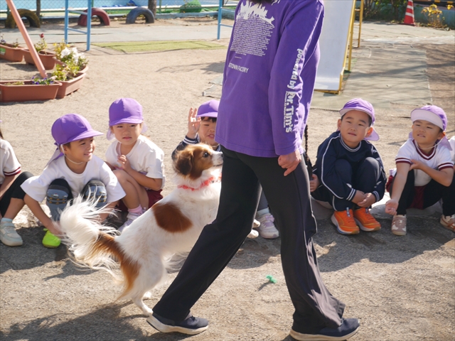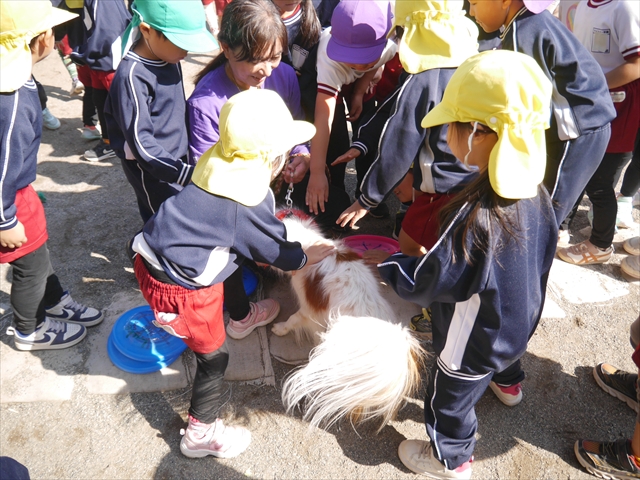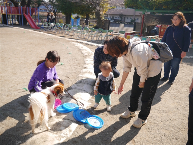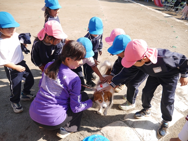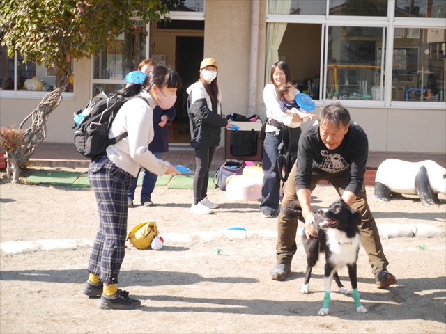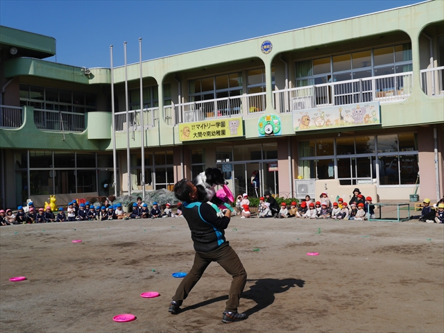 見ていた子どもたちも、さくらんぼクラブの親子の皆さんも、みんな大喜びで楽しい時間を過ごしました。また、園児を代表して年長さんが6名、そして先生方も代表の先生方がディスク・ドッグ体験をさせていただきました。良かったね~!!(^^)b さらにさくらんぼクラブに参加した方々や保護者の方々の希望者の方にも体験していただきました!みんなとっても上手に・・・??できましたかな!(^^;) ヘ(^o^)/ 最後はみんなでわんちゃんを「なでなでして、さよなら」をして終わりにしました!まる!(^^) (^_^)b