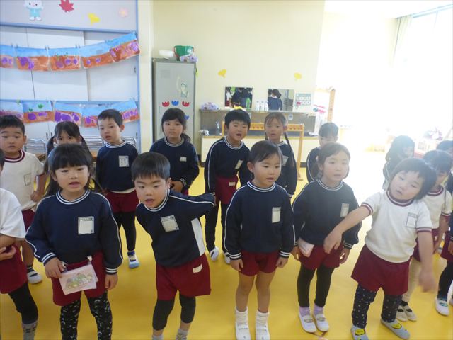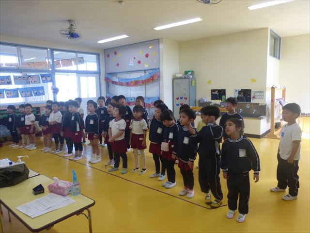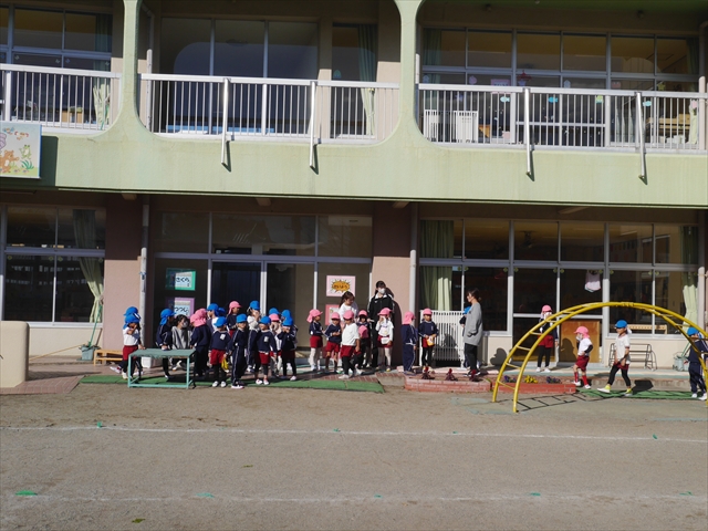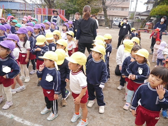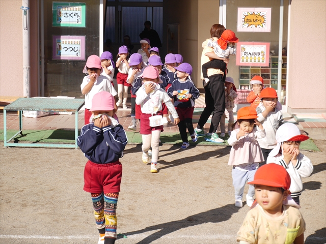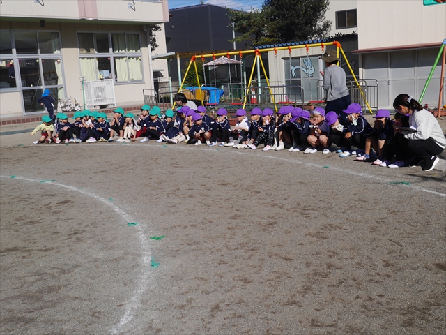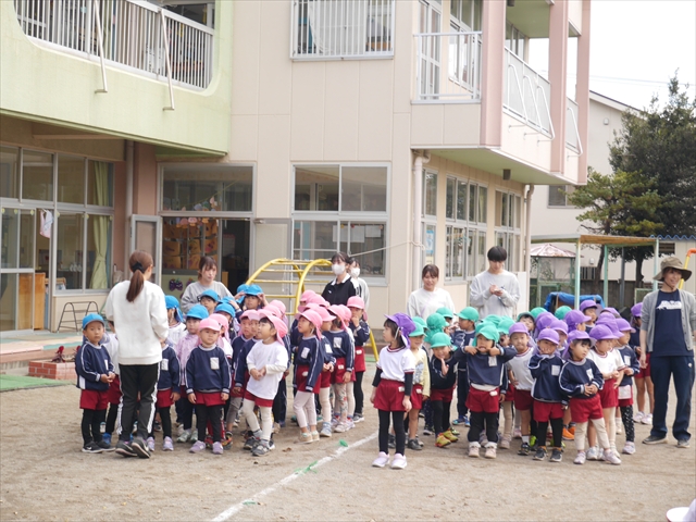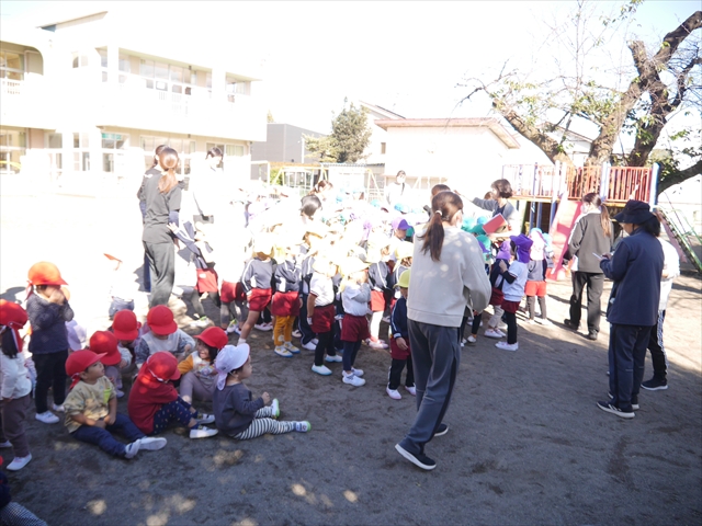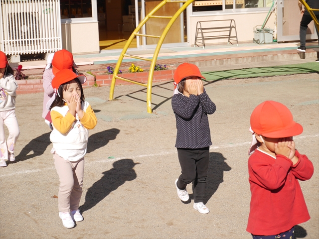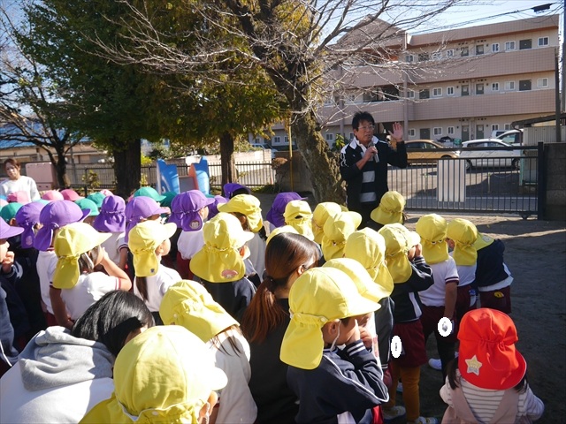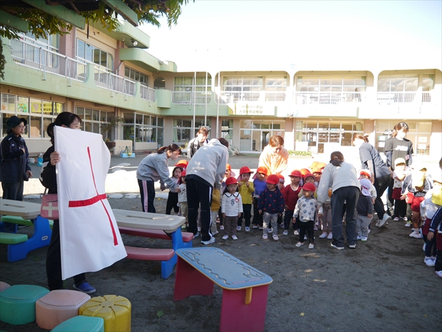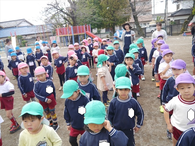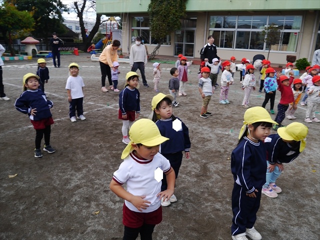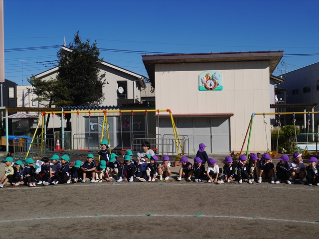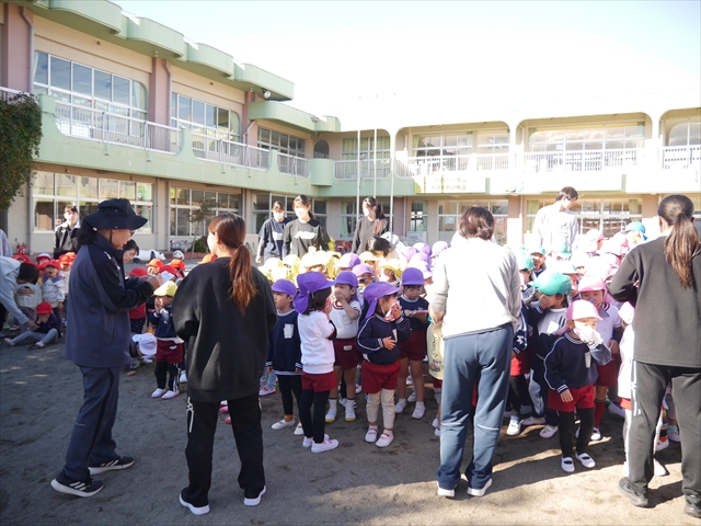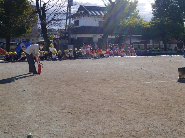 明日は「ひたちなか市との市民交流会」があります。制服登園で来てください。会場は岩宿博物館駐車場になっています。会場付近が渋滞が予想されますので、予定よりも早く園を出発したいと思います。急で申し訳ございませんが、送迎の方はできるだけ9時までに登園してください。また出演時間も前の団体の状況に応じて10時前後になる可能性もありますので、早めに会場にお越しください。ご協力よろしくお願いいたします。今日は、地震・火災対応の「避難訓練」を行いました!(*^^)v また、実際の消火器を使った本物体験「消火訓練」も行い、消防士の先生たちも上手に消火できましたかな?(^_^)B