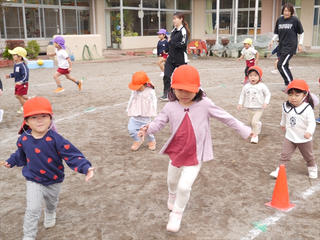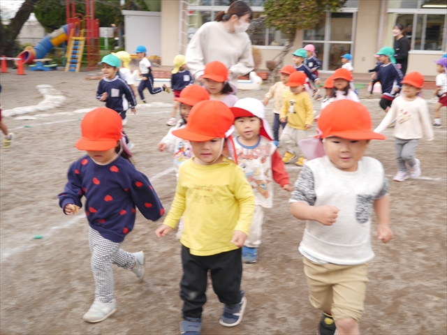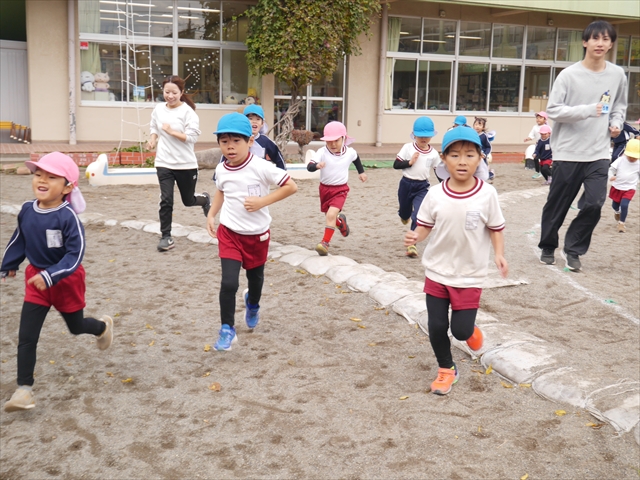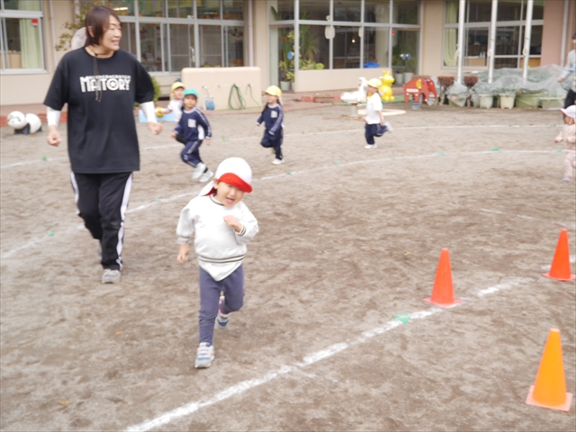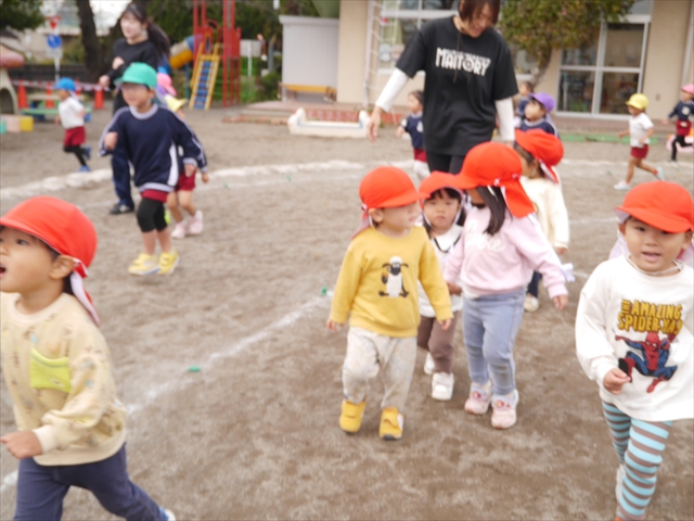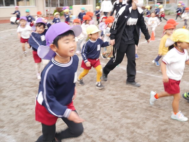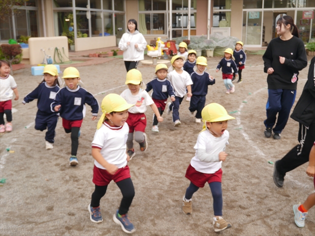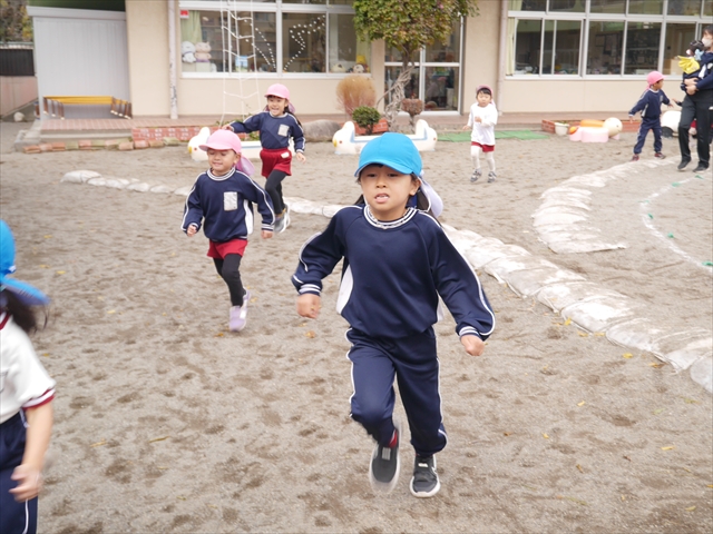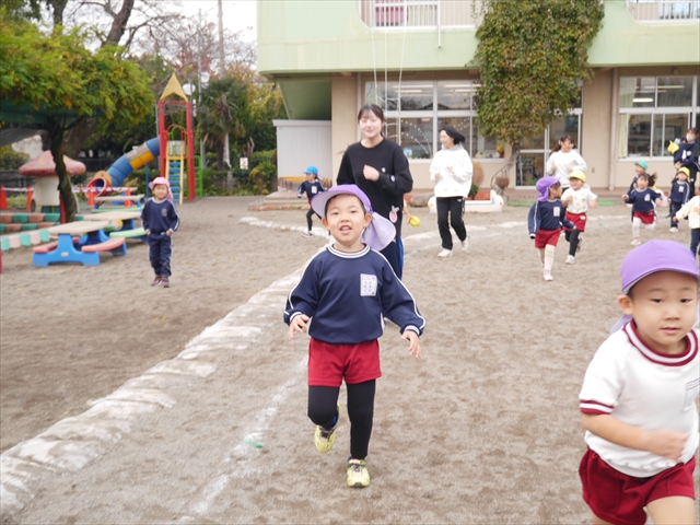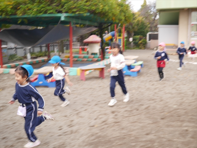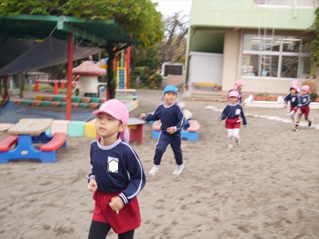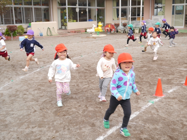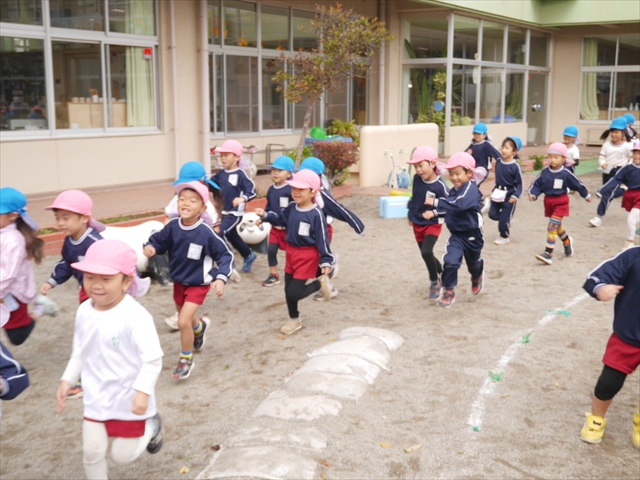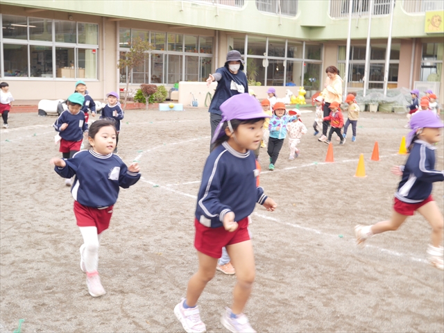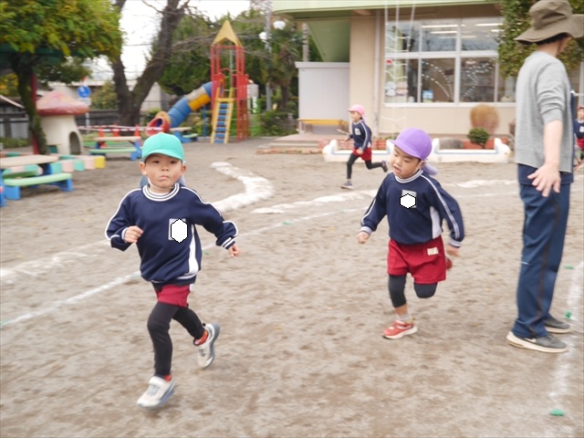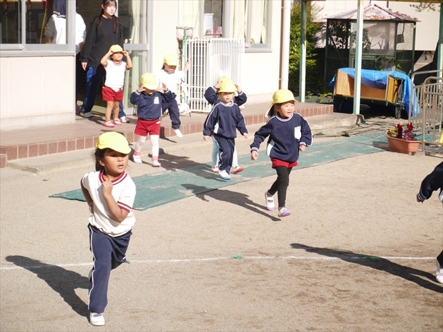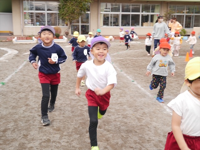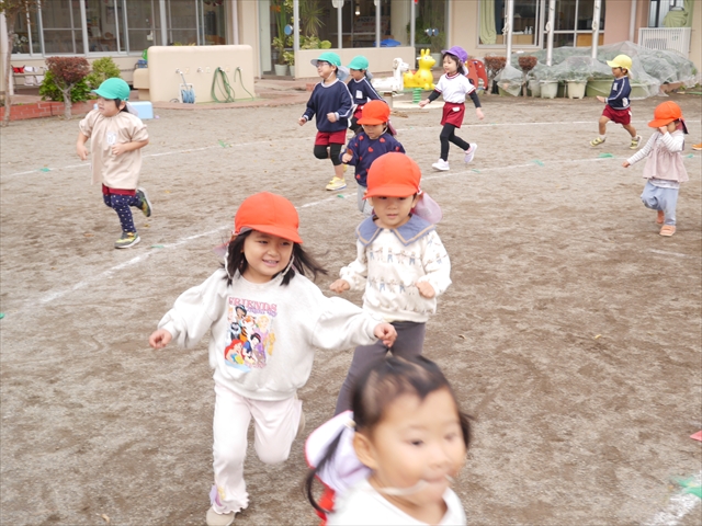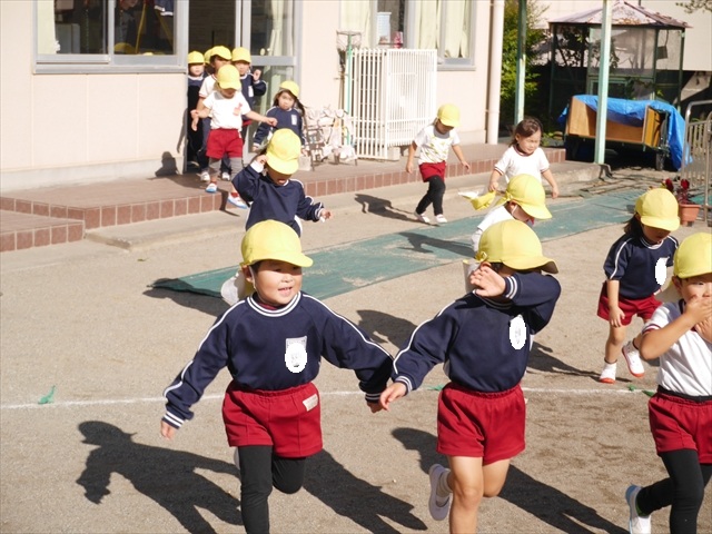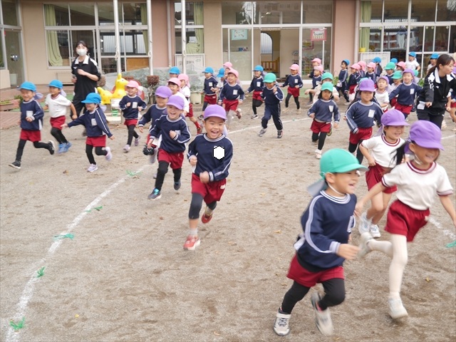 世の中のスポーツは、今「駅伝」や「マラソン」のシーズンとなっておりますが、マイトリー幼稚園も月曜日と水曜日の朝の活動は、「マラソン」になります。準備体操をした後、音楽に合わせた3分間程度の「時間走」を行います。今日は今年度初めての「朝マラソン」でしたが、みんな元気よく頑張って走り抜きました。えらい!えらい! これからどんどん寒くなり、また寒い冬を迎えます。寒さに負けない元気で丈夫で健康な身体・持久力・防衛体力を身につけていってほしいと思います。みんながんばれ~!\(^_^)/ ヘ(^o^)/