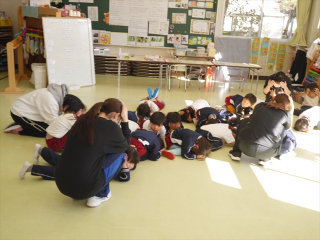 今日は、大きな地震が起きた時の「地震対応の避難訓練」とその地震による火災が起きた時の「火災対応の避難訓練」を一緒にし、複合的な災害に対処する「避難訓練」を行いました。地震が起きた時には、みんな迅速に頭を守ることができ、また、地震により職員室から出火した想定での避難も煙を吸わないようにしっかり口を押さえることがみんなできており、一人一人自分の身を守って避難することができました。みんな先生の指示を聞いて迅速にしっかりやれ、とてもえらかったです! まる!(*^_^*) (^_^)v