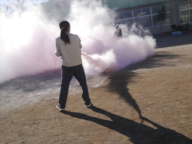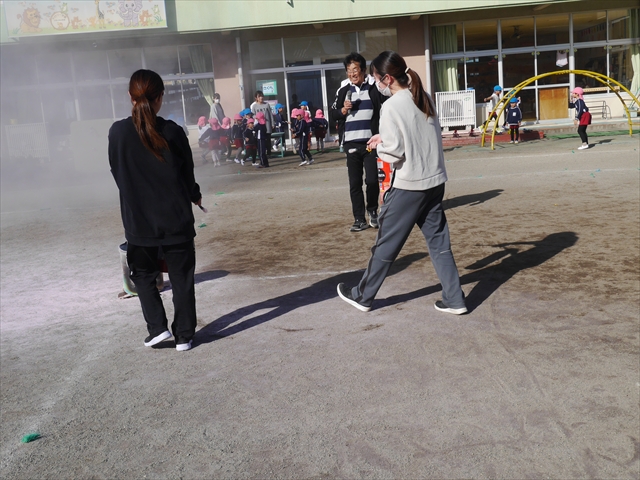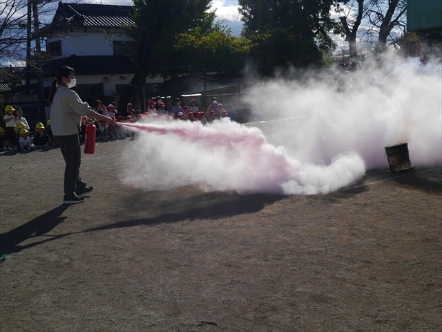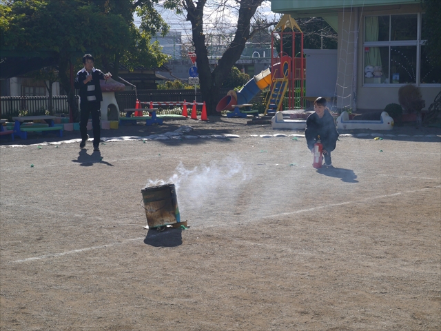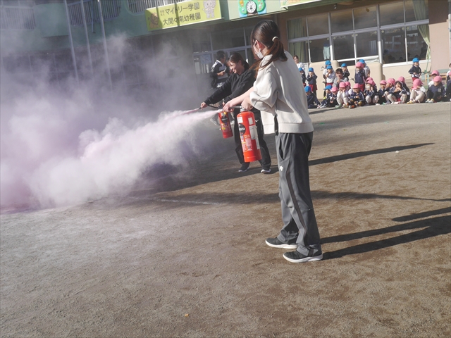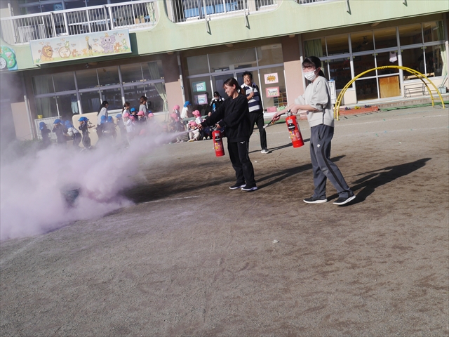 避難した後は、2名の代表の先生方が消防士となり、本物の消火器を使用して初期消火訓練を行いました。園長先生が消火器の説明をしましたが、消火器からピンク色の粉?がたくさん出てきて火を消すことができたのを見て、みんな驚いて大歓声を上げていました。やはり「本物体験」は大切ですね!とにかく先生たちが立派に消火してくれましたかな?ヘ(^o^)/ (^_^)b