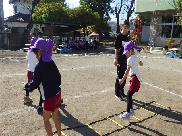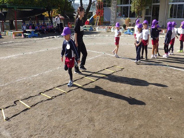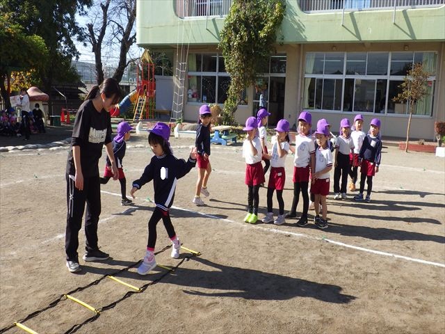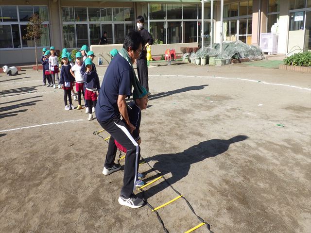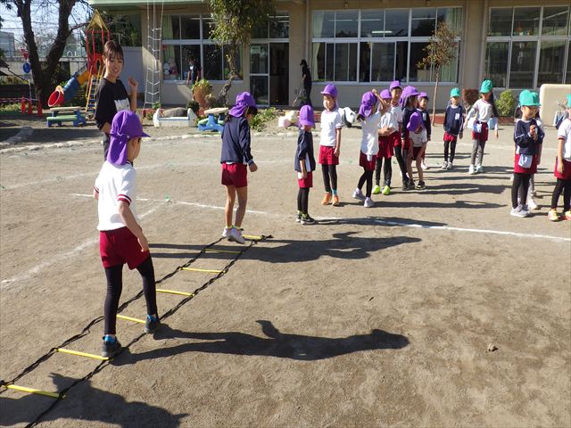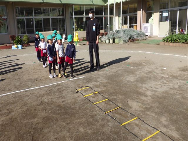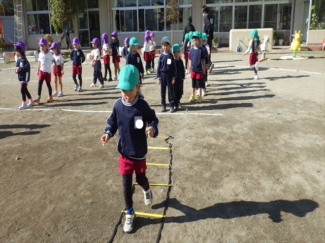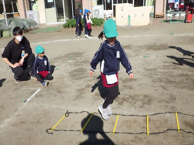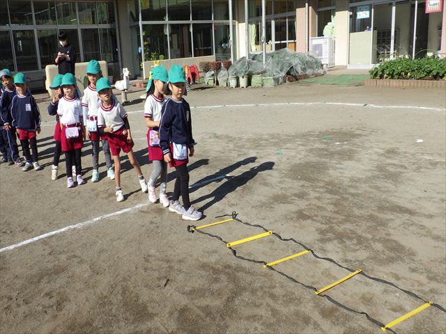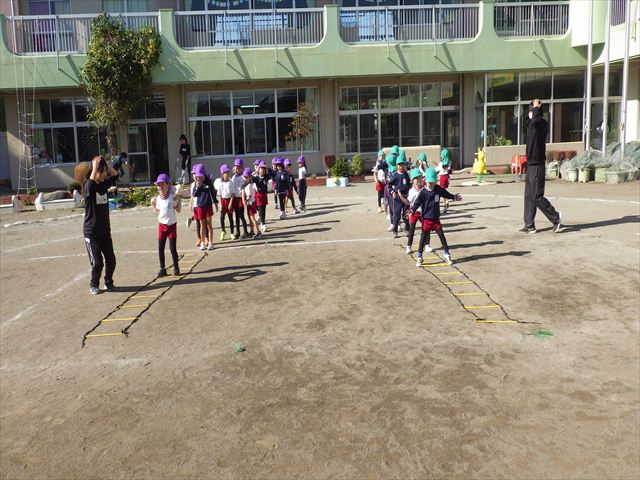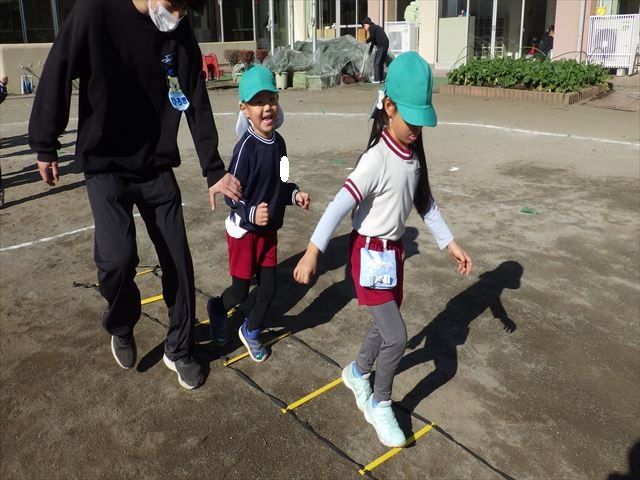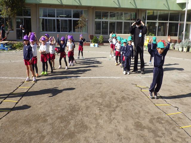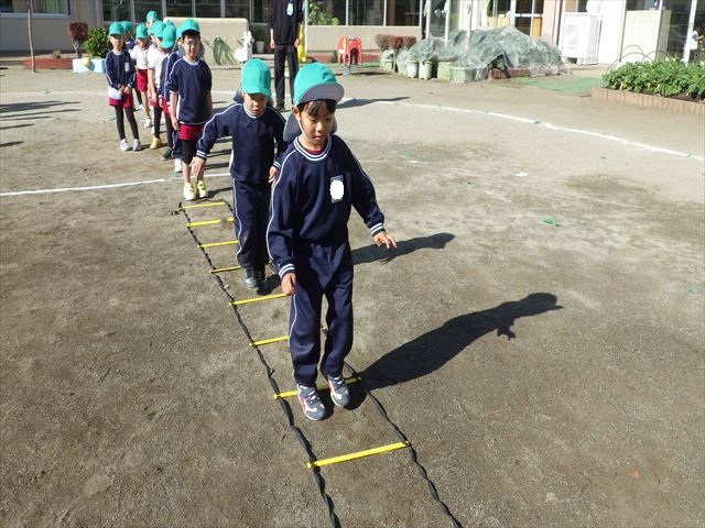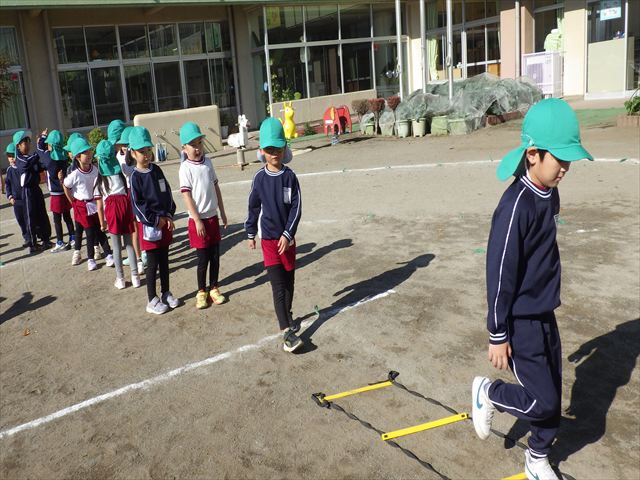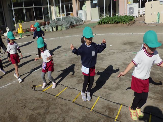 朝のマラソンの後は、ラダーをしました。サーキットのラダーではケンパやジャンプをすることが多いですが、今日の体育の時間では、横を向いて両足でジャンプしたり、手で頭や肩を触りながらジャンプをしたり、色々な跳び方で楽しみました♪何回か飛んでみるとだんだんできるようになり、難しい跳び方も一生懸命チャレンジしていました!