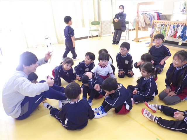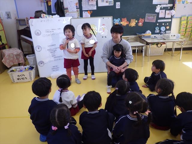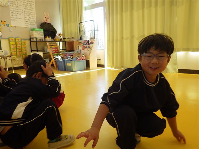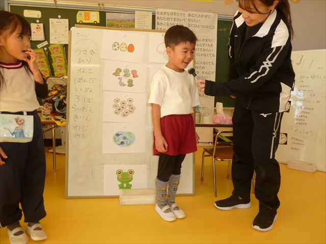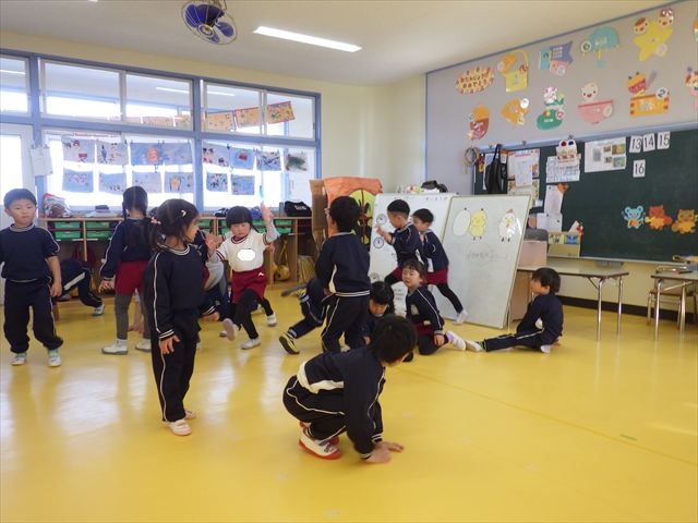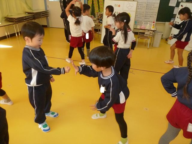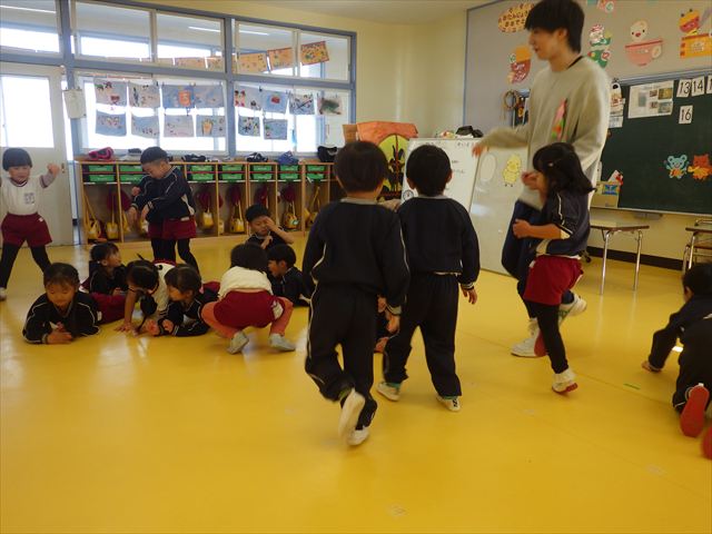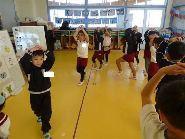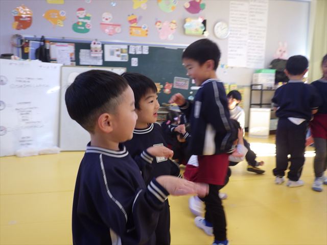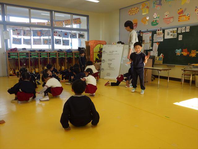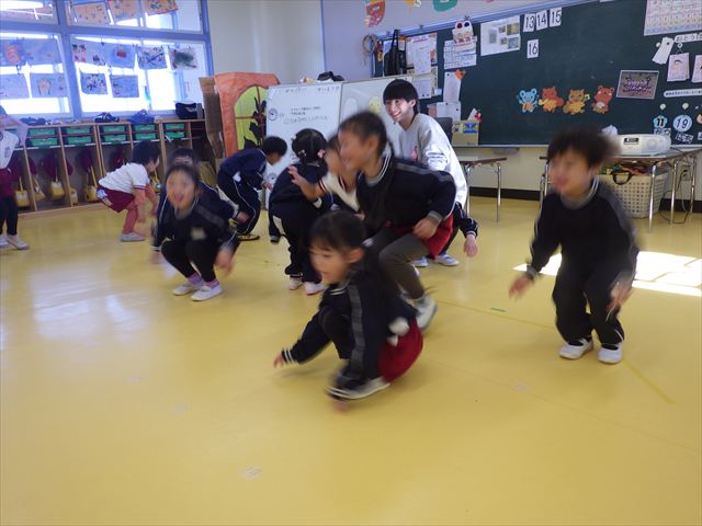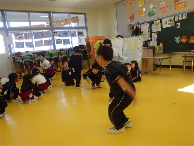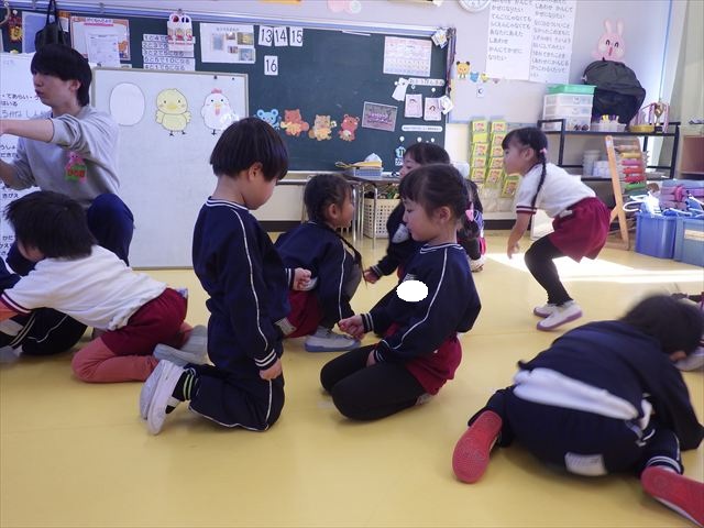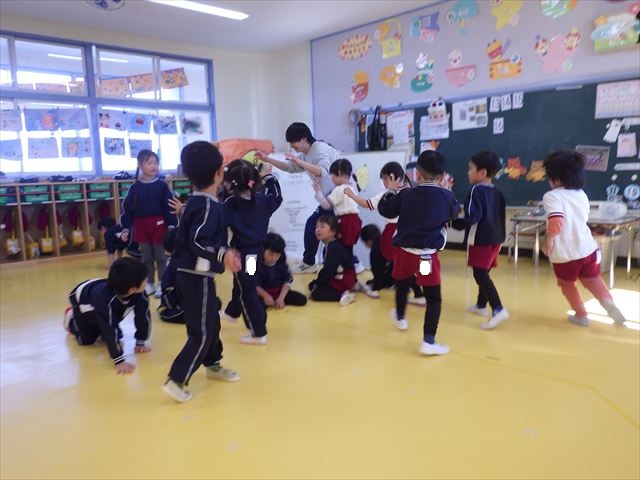 運動教室の後は、さくら組に入っている実習生の責任実習の日でした。主活動として「進化ゲーム」を行いました。まず、導入としてたまごのイラストを見せてなんのたまごかクイズをしました。ひよこや、ヘビ、あり、ペンギン、恐竜などが出て来ました。そして、実際に動物になりきって教室をうごき回って体を動かしました。その発展として、ジャンケンをして勝ったらたまごからひよこ、ニワトリと進化して行くゲームをしました。つつじ組のお友だちも同じ活動を担任の先生と行いました。発表会の劇あそびにも沢山の動物が出てくるので動物のイメージがしやすかったように思います。実習生の先生もとても頑張っていました!