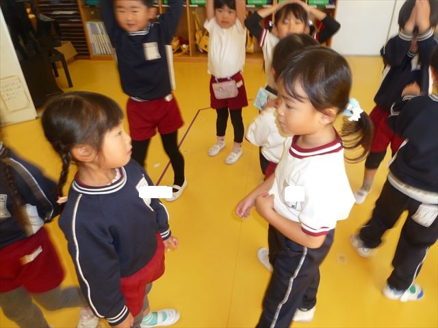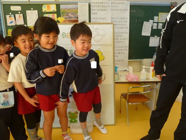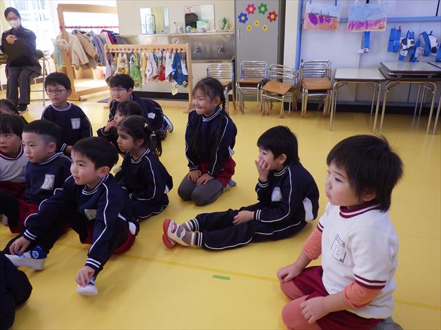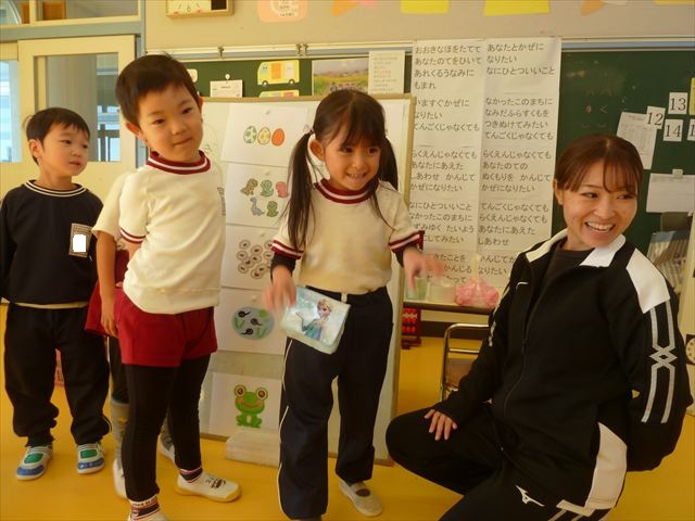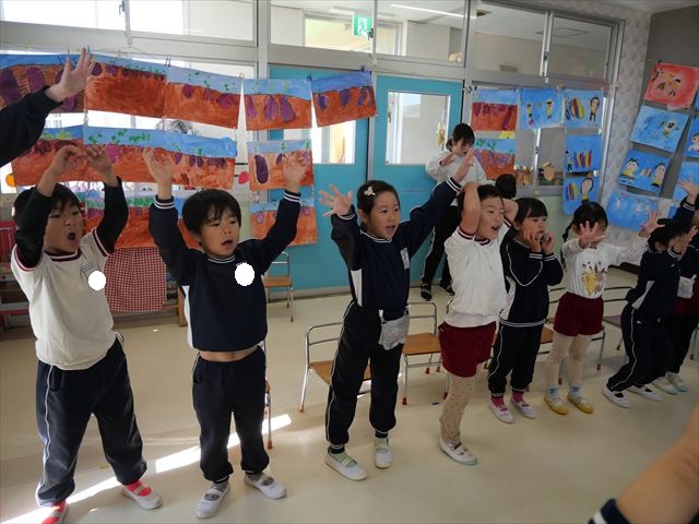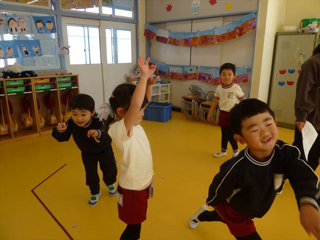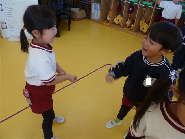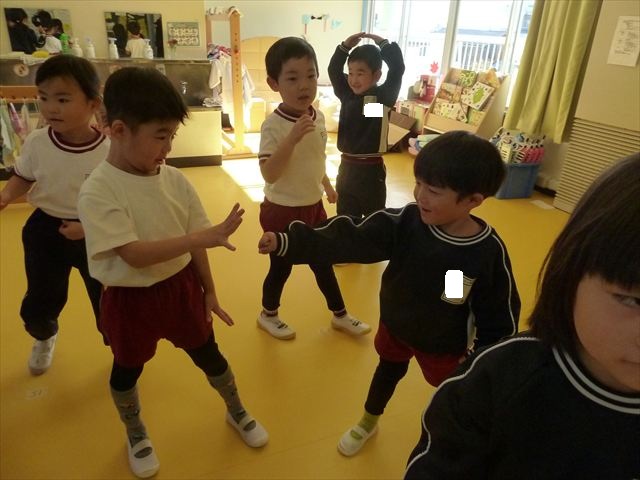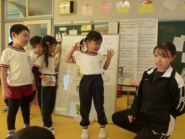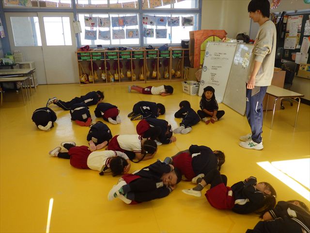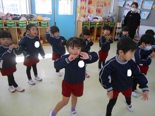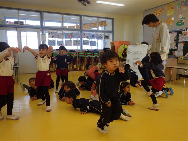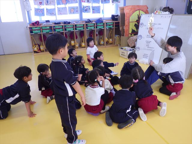 運動教室の後は、さくら組に入っている実習生の責任実習の日でした。主活動として「進化ゲーム」を行いました。まず、導入としてたまごのイラストを見せてなんのたまごかクイズをしました。ひよこや、ヘビ、あり、ペンギン、恐竜などが出て来ました。そして、実際に動物になりきって教室をうごき回って体を動かしました。その発展として、ジャンケンをして勝ったらたまごからひよこ、ニワトリと進化して行くゲームをしました。つつじ組のお友だちも同じ活動を担任の先生と行いました。発表会の劇あそびにも沢山の動物が出てくるので動物のイメージがしやすかったように思います。実習生の先生もとても頑張っていました!