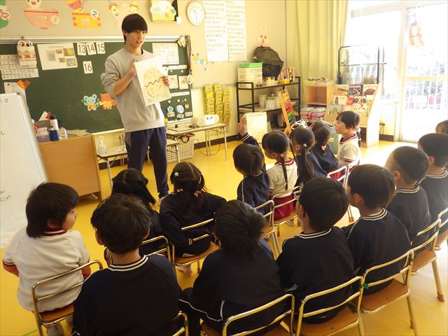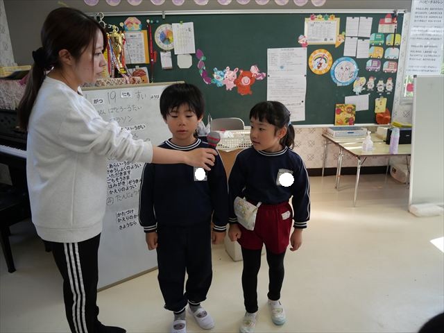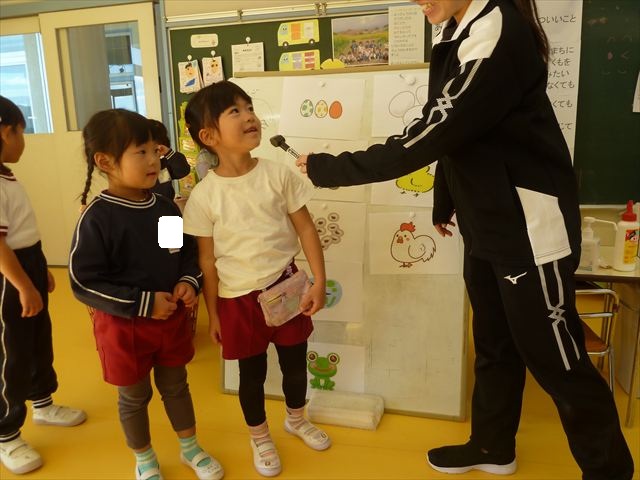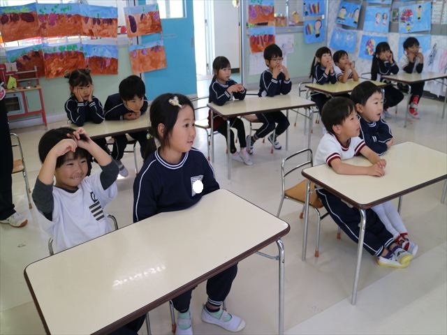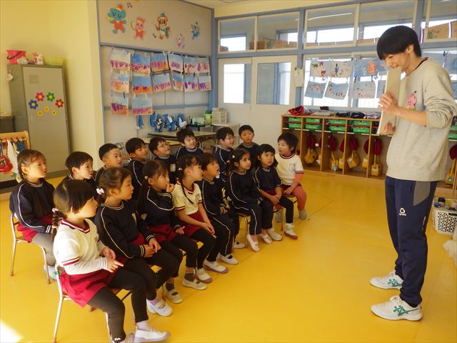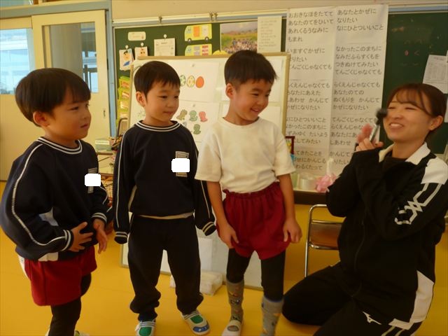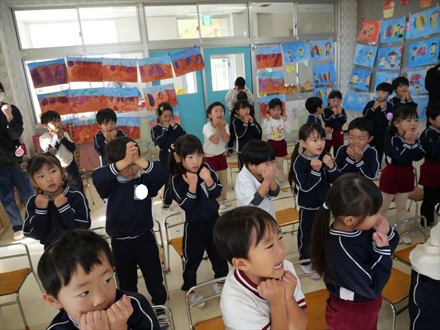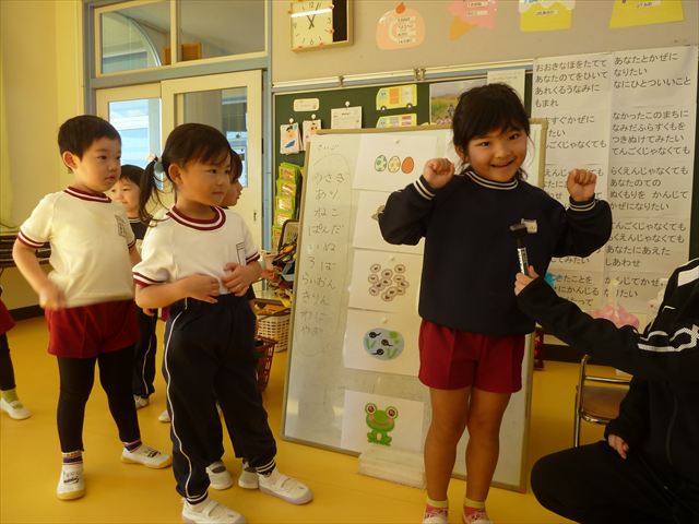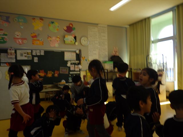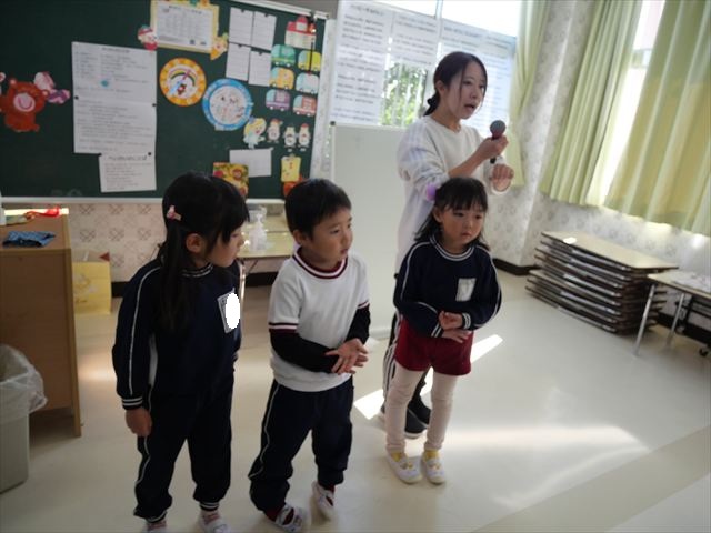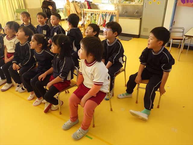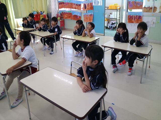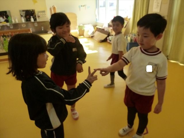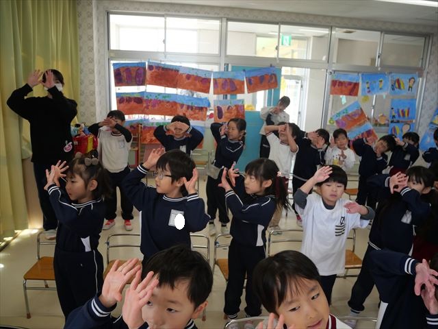 運動教室の後は、さくら組に入っている実習生の責任実習の日でした。主活動として「進化ゲーム」を行いました。まず、導入としてたまごのイラストを見せてなんのたまごかクイズをしました。ひよこや、ヘビ、あり、ペンギン、恐竜などが出て来ました。そして、実際に動物になりきって教室をうごき回って体を動かしました。その発展として、ジャンケンをして勝ったらたまごからひよこ、ニワトリと進化して行くゲームをしました。つつじ組のお友だちも同じ活動を担任の先生と行いました。発表会の劇あそびにも沢山の動物が出てくるので動物のイメージがしやすかったように思います。実習生の先生もとても頑張っていました!