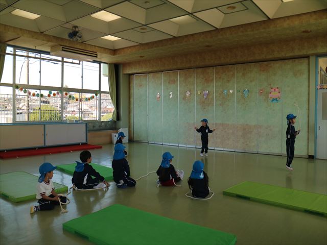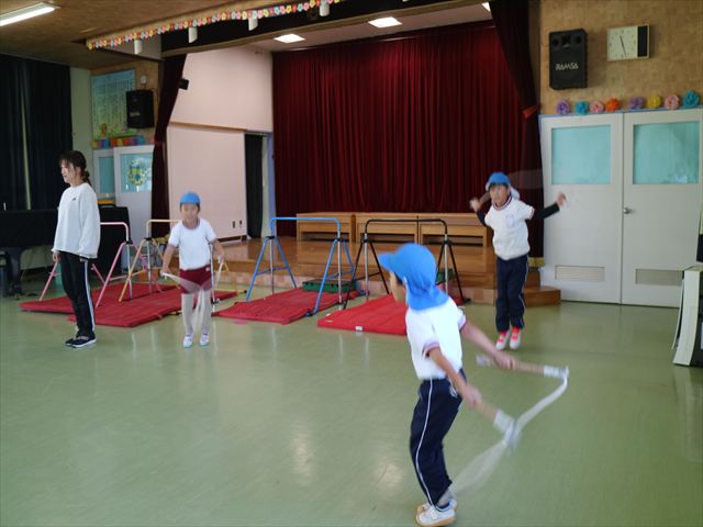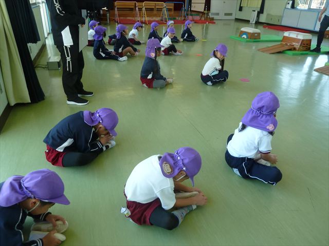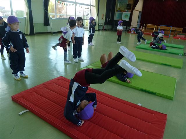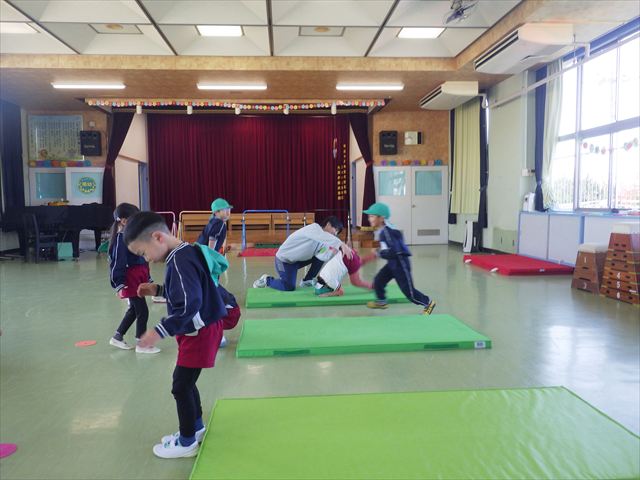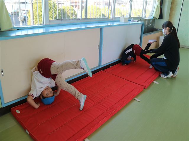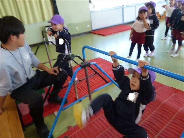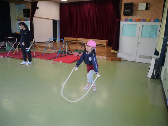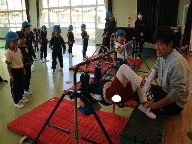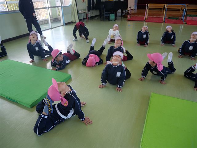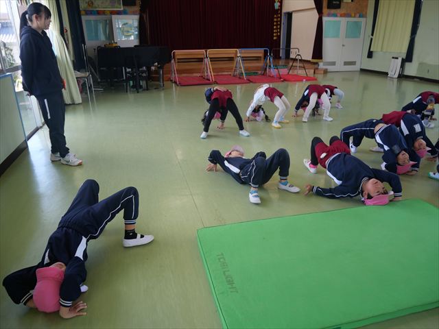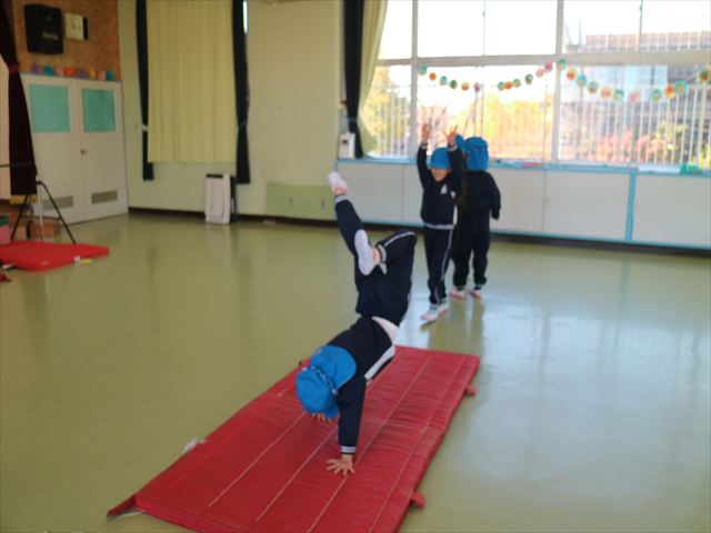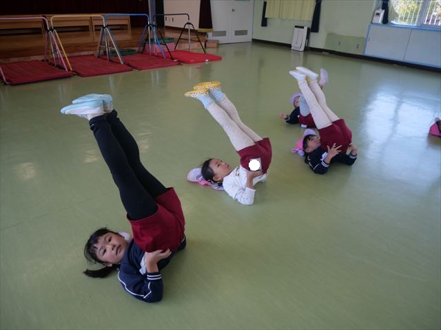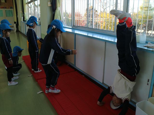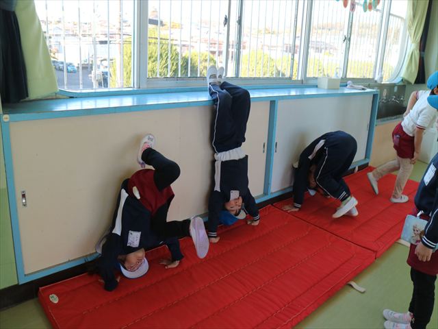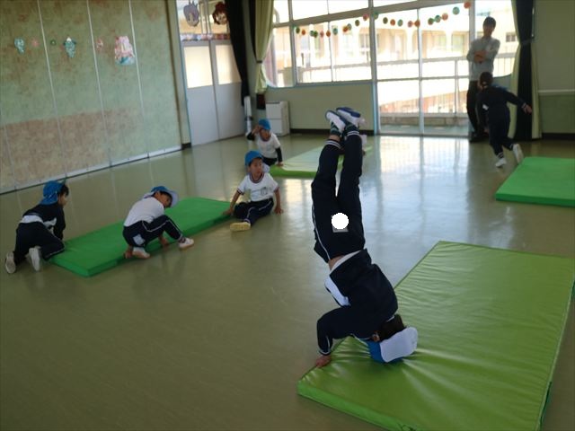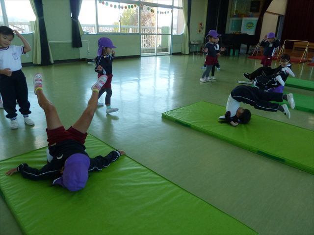 運動教室では三点倒立、鉄棒、縄跳びの練習をしました。練習に励み、友だちの頑張りを認め応援してあげる姿も見られました☆
