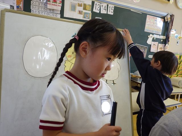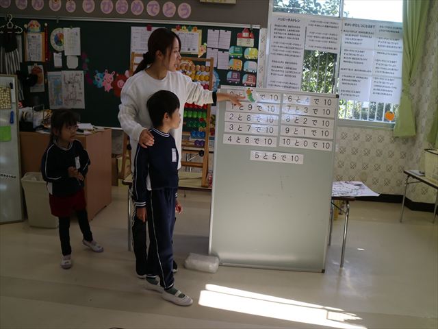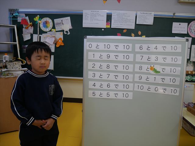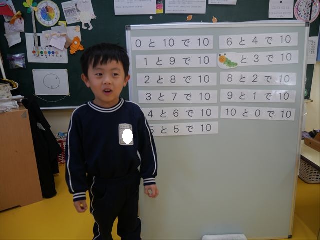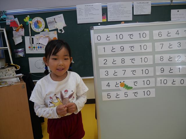 算数の時間では「10のかたまり」をしました。そろばんを使って10のかたまりを考え、その後は虫食いゲームもして楽しんで学びました。
