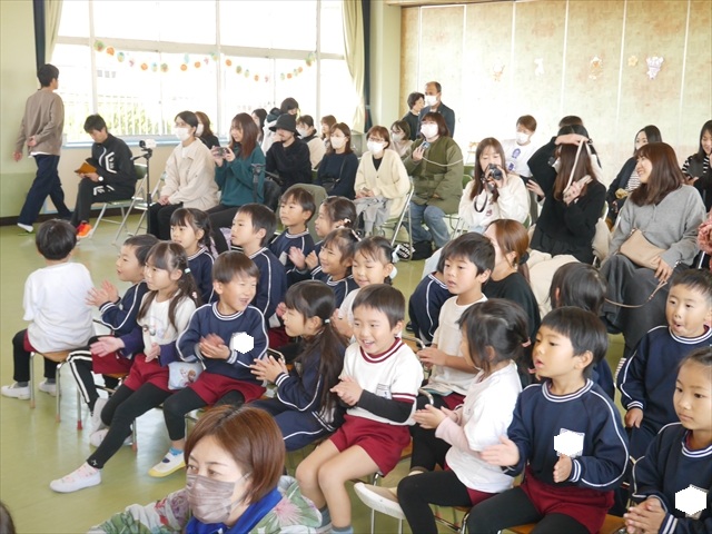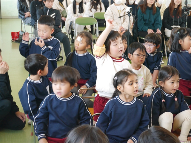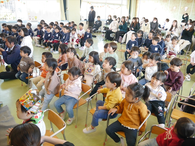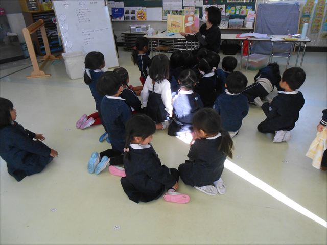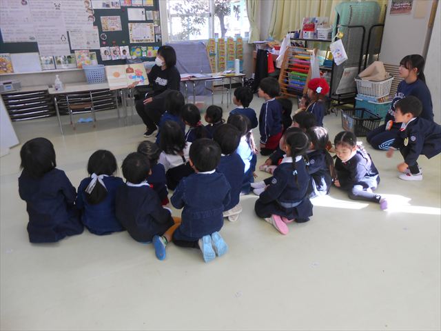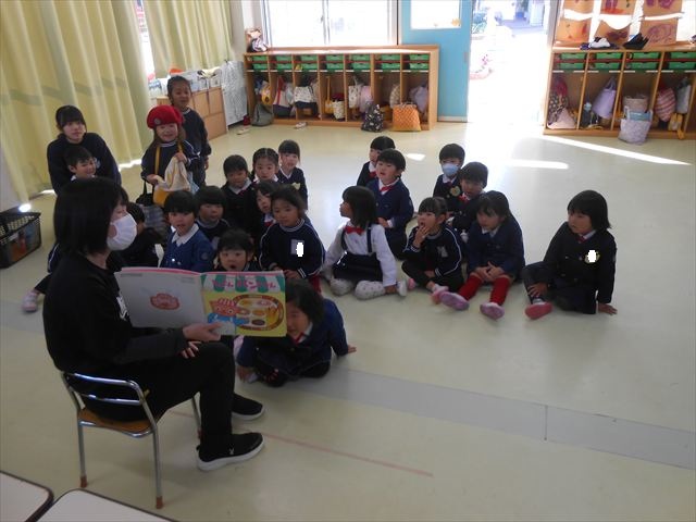 ^^)年長さんや先生たちや出し物を楽しむことができました。午後は、読み聞かせをしました。おいしいパンが出てくる絵本で、「おいしそう~」「これたべたい」と楽しみました(