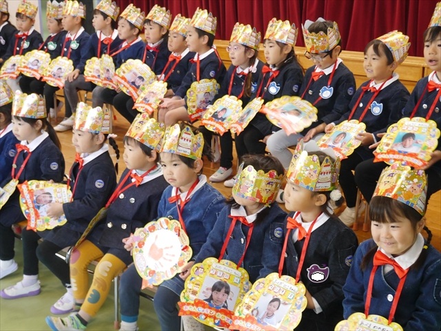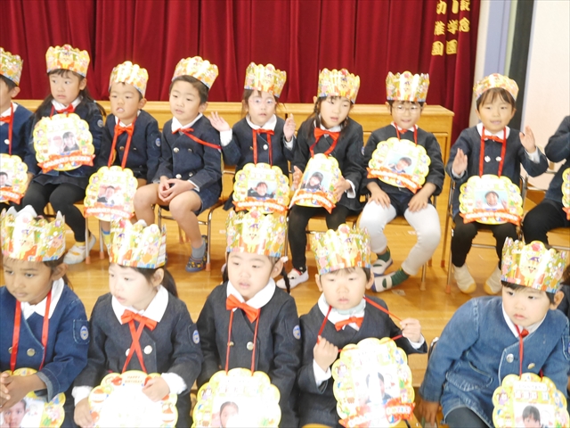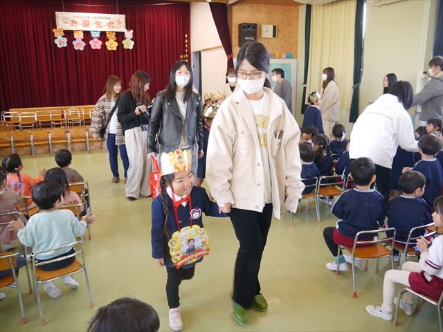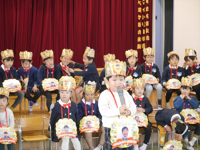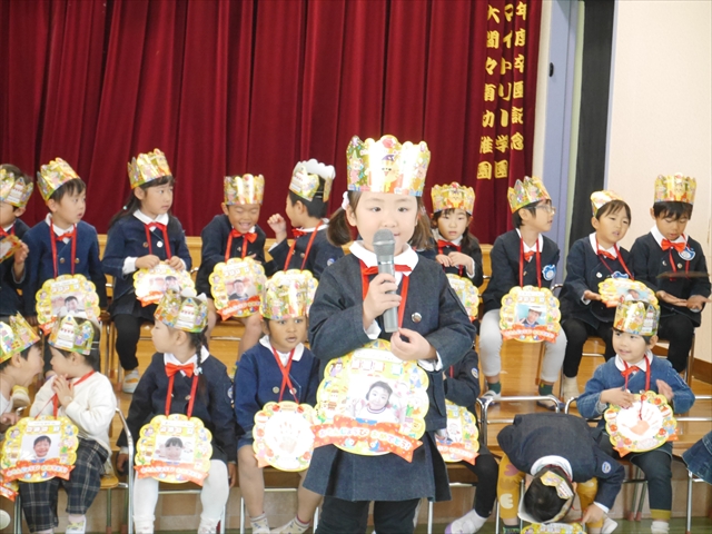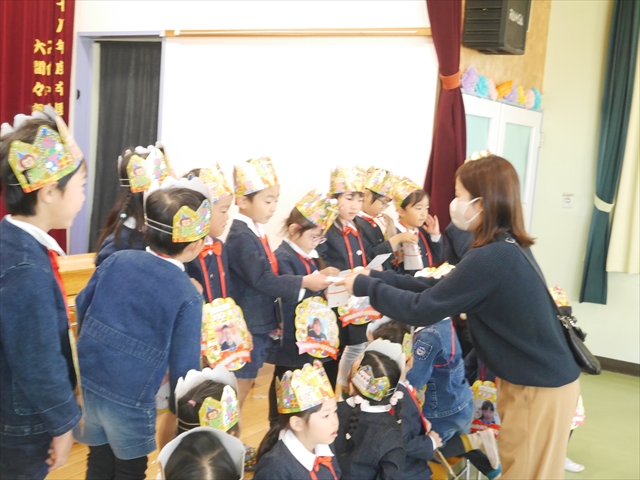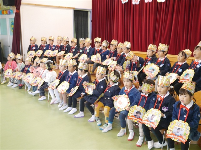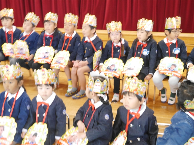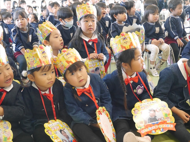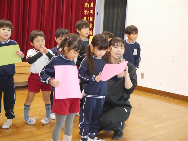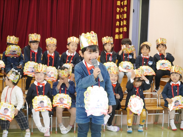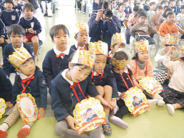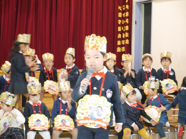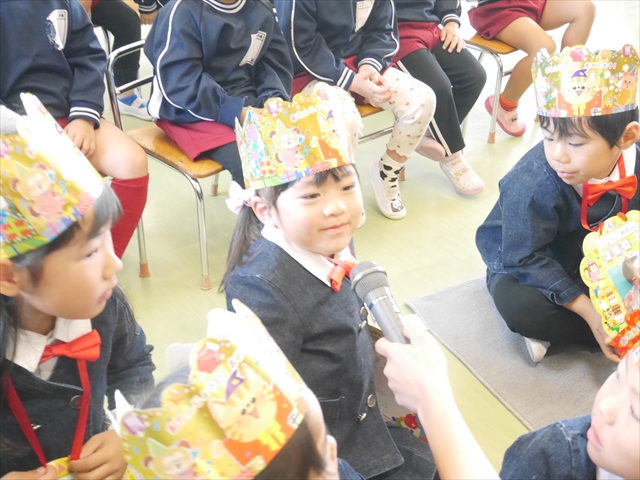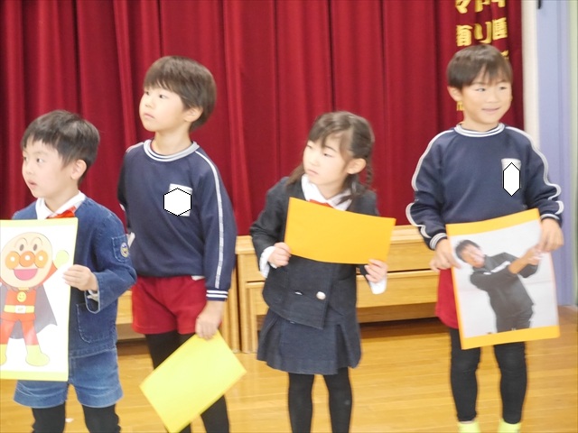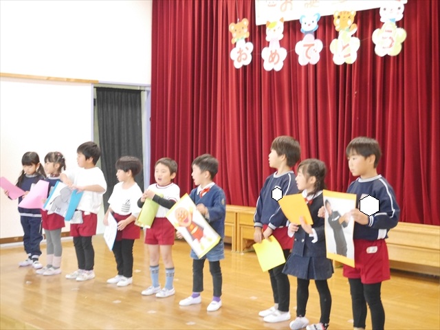 また、誕生日のお友だちには、PTAからの記念品(プレゼントは「図書カード」)が一人ひとりに贈られました。お祝いの出し物は、年長さんの代表の子たちがヒントを出して答える「クイズ」をしてくれ、みんなを楽しませてくれました。また、先生方は今回は担当の4名の先生方が、「アナと雪の女王」を楽しく歌って踊ってくれました。子どもたちも大喜びで楽しんでくれて何よりでした!(^