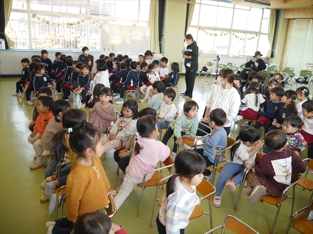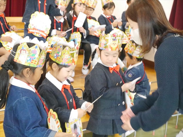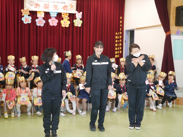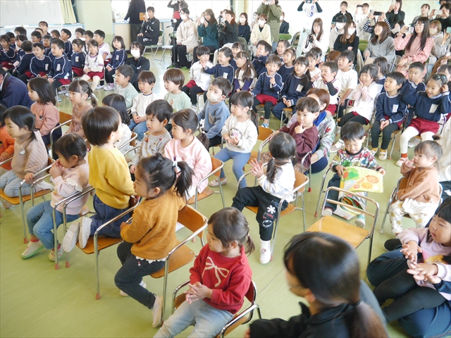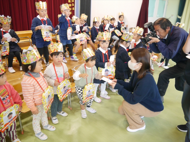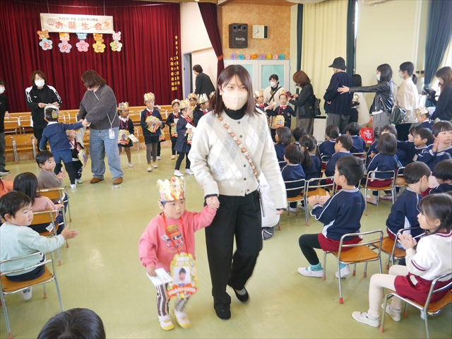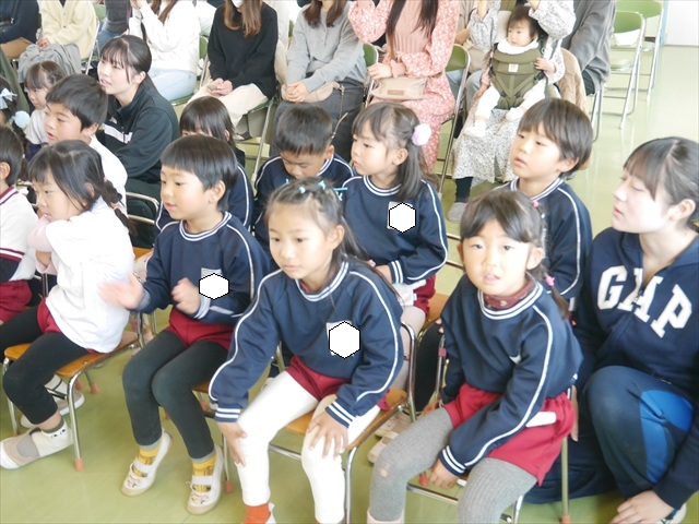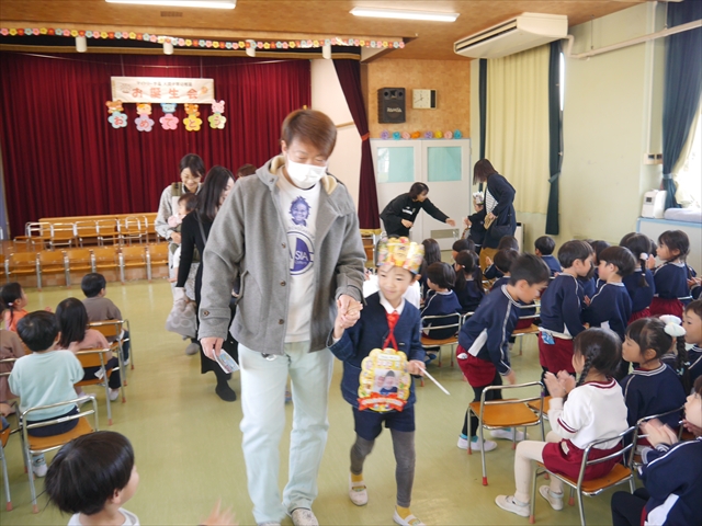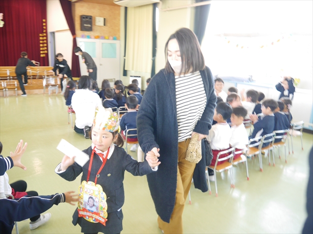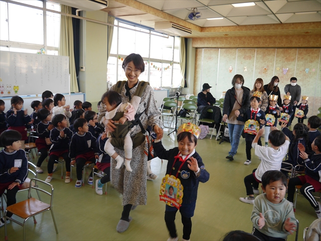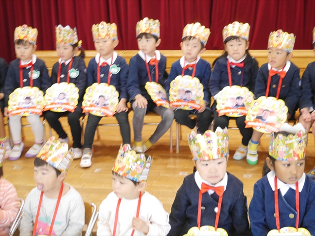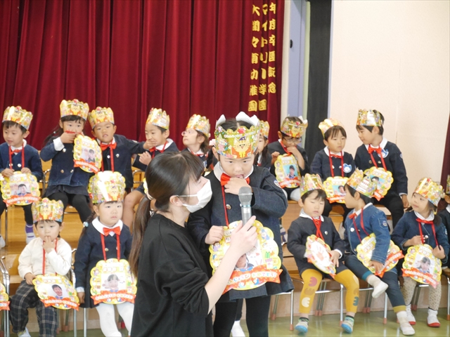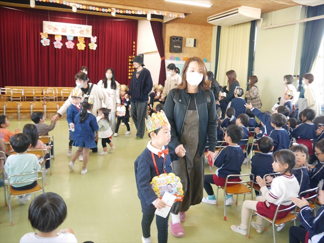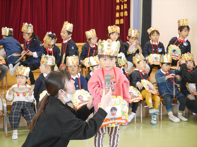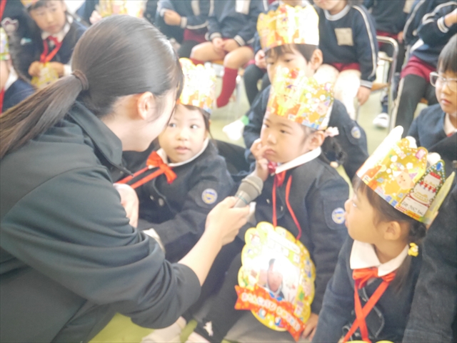 また、誕生日のお友だちには、PTAからの記念品(プレゼントは「図書カード」)が一人ひとりに贈られました。お祝いの出し物は、年長さんの代表の子たちがヒントを出して答える「クイズ」をしてくれ、みんなを楽しませてくれました。また、先生方は今回は担当の4名の先生方が、「アナと雪の女王」を楽しく歌って踊ってくれました。子どもたちも大喜びで楽しんでくれて何よりでした!(^