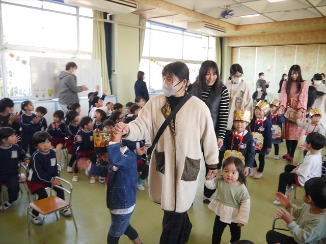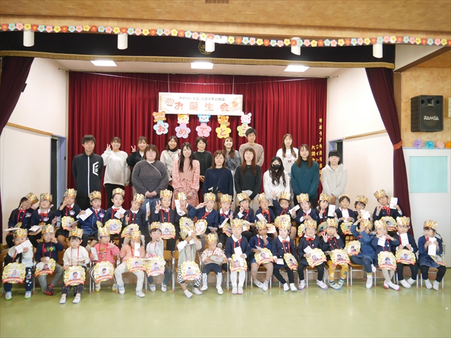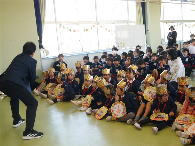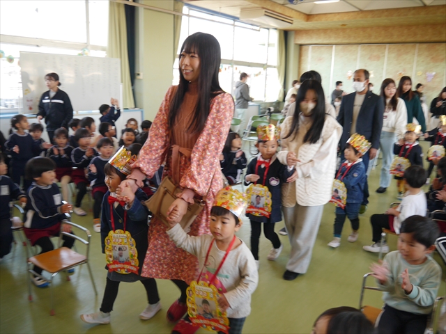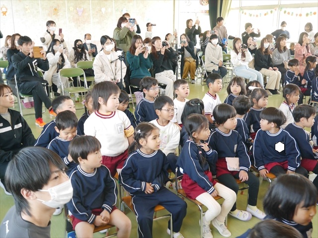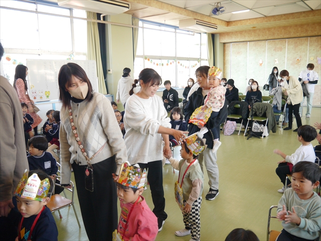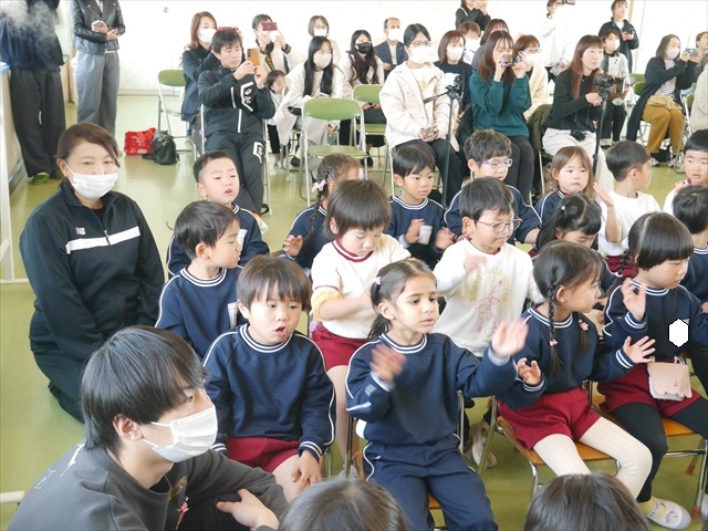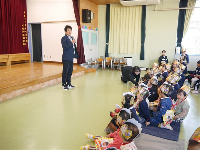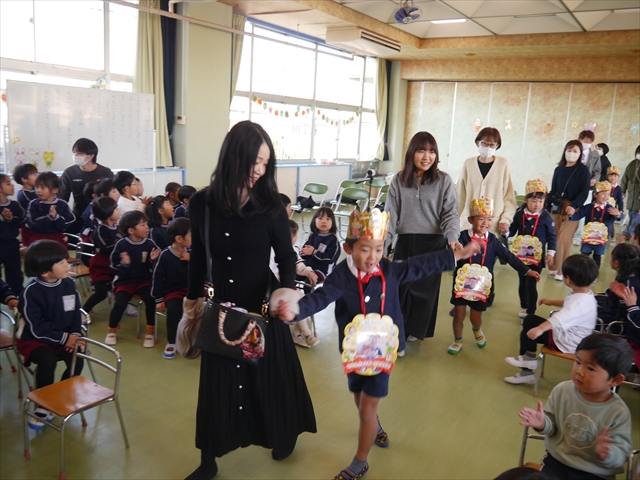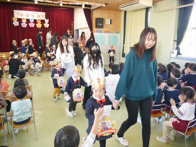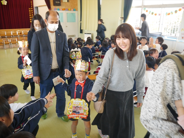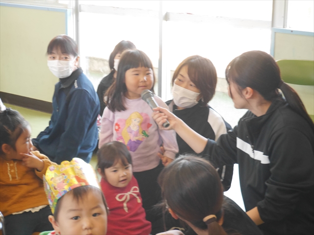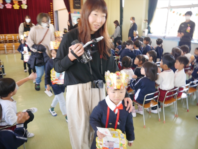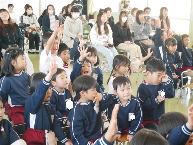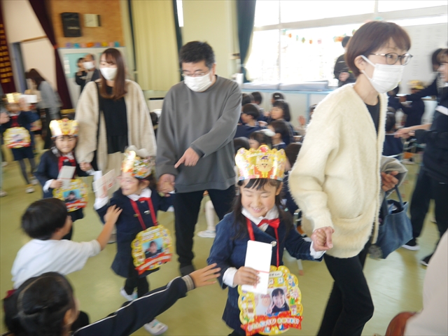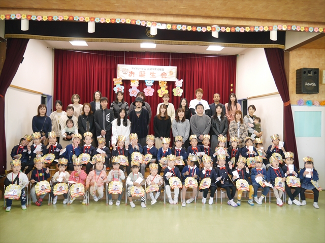 また、誕生日のお友だちには、PTAからの記念品(プレゼントは「図書カード」)が一人ひとりに贈られました。お祝いの出し物は、年長さんの代表の子たちがヒントを出して答える「クイズ」をしてくれ、みんなを楽しませてくれました。また、先生方は今回は担当の4名の先生方が、「アナと雪の女王」を楽しく歌って踊ってくれました。子どもたちも大喜びで楽しんでくれて何よりでした!(^