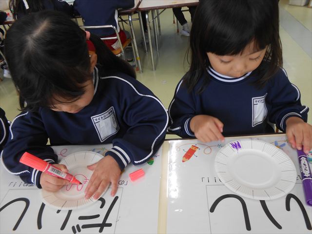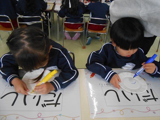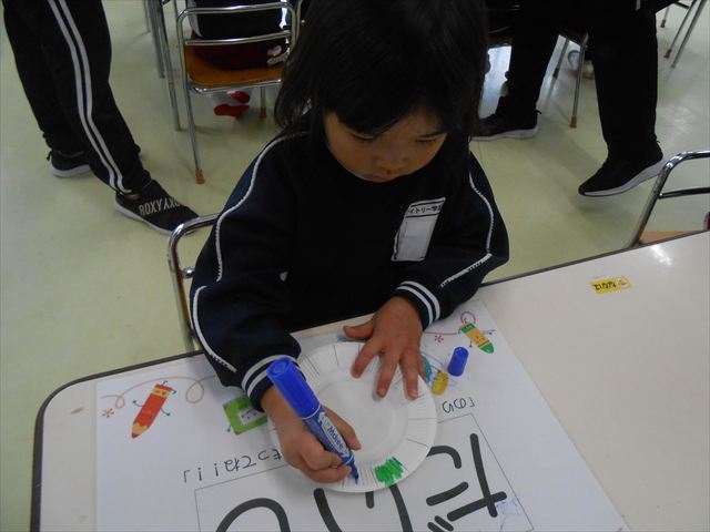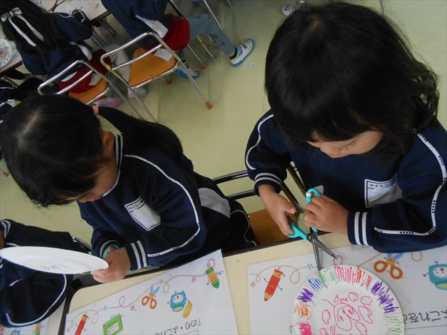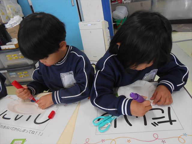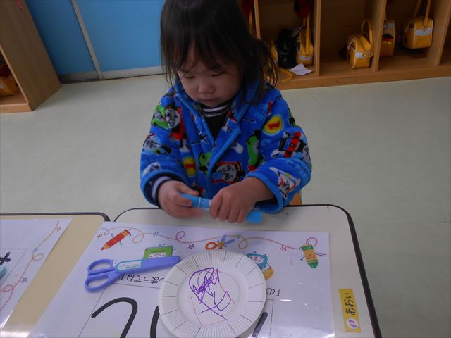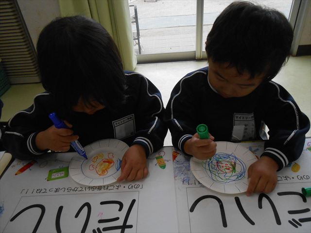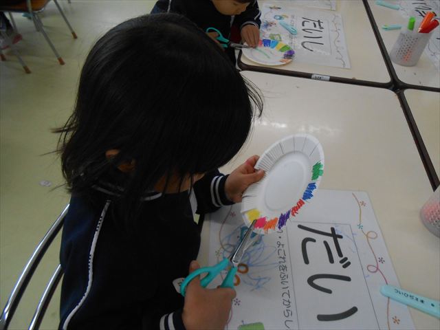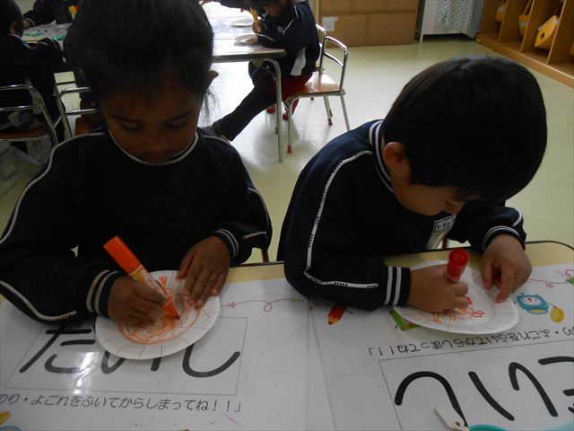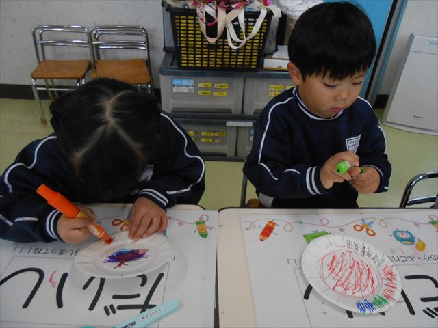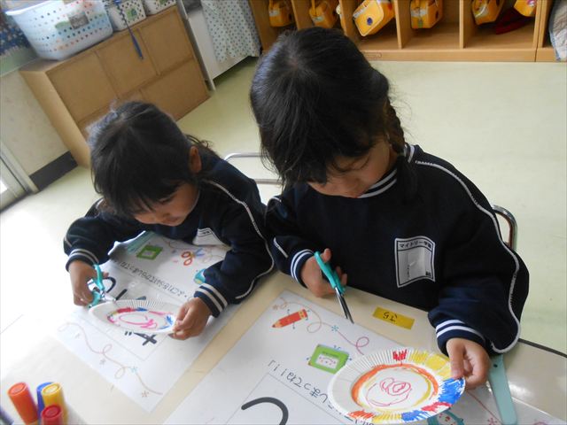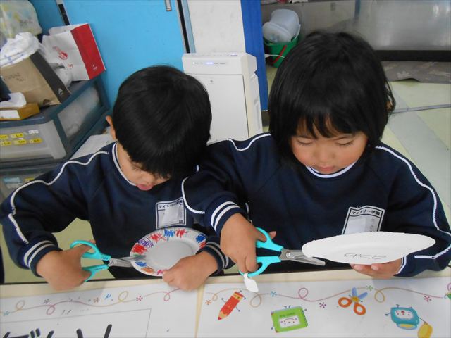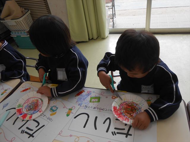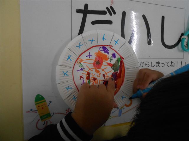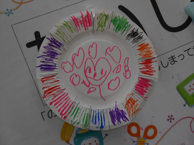今月はフリスビーを作って遊ぼう!を計画し作って遊びました(^^)/今回は、紙皿を使って絵を描いたり、色を塗ったりして自分だけのオリジナルのフリスビーを作りました。そして午後、作ったフリスビーを飛ばして遊びました(^^)/少し飛ばすのは難しかったようですが自分のと言うこともあって楽しそうに飛ばしていました(^^)/今回のフリスビーは、遠くに飛ぶよりくるくる回って跳ぶと綺麗なフリスビーです。ぜひご家庭でも楽しんでいただけたらと思います(