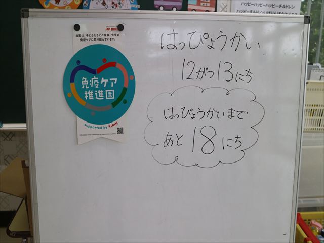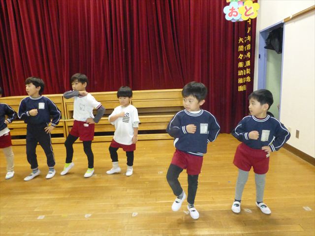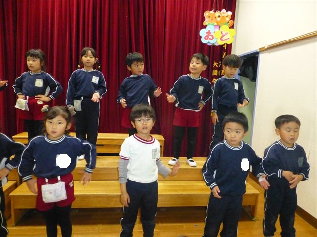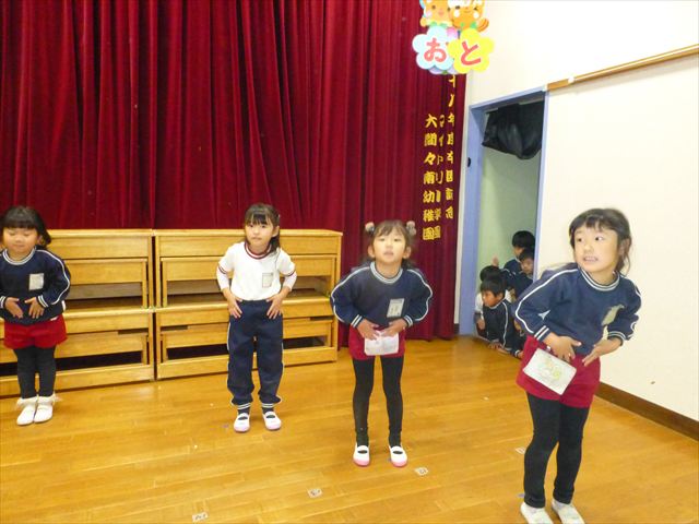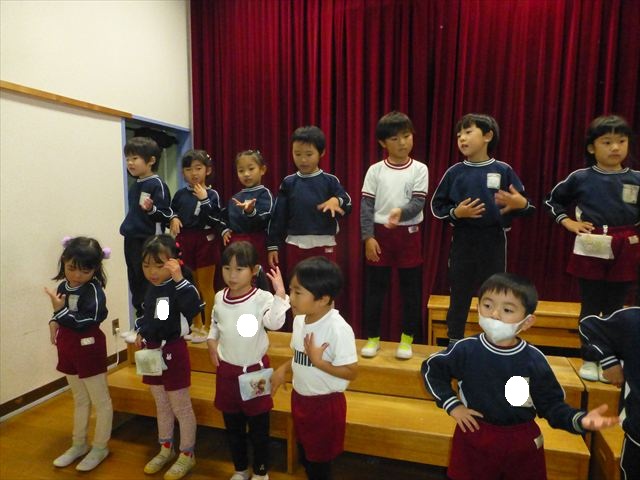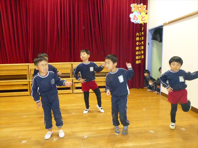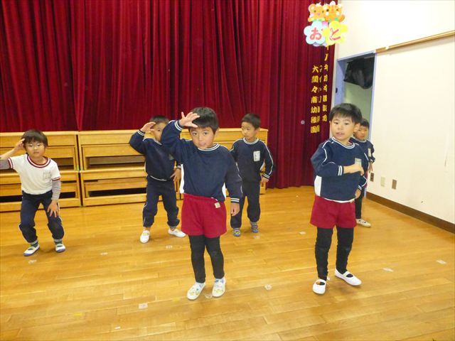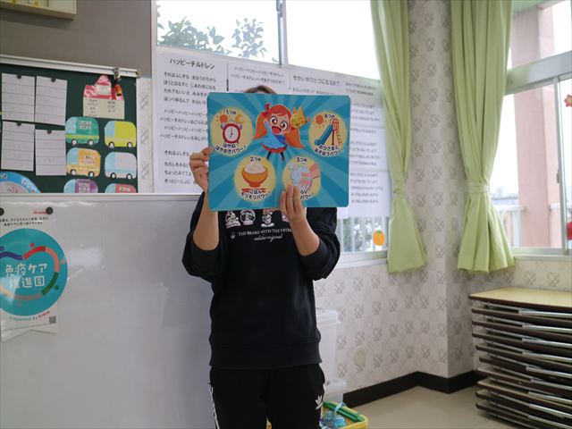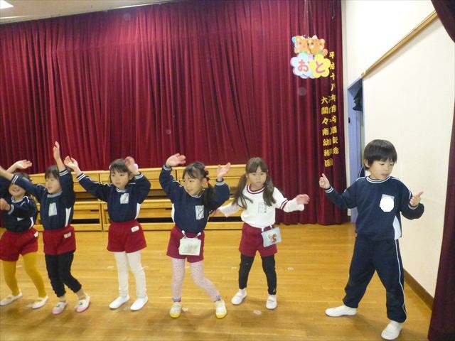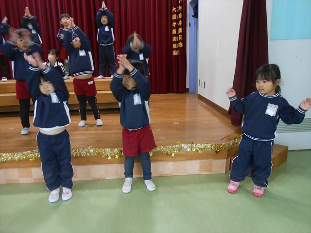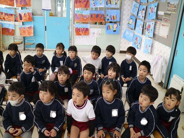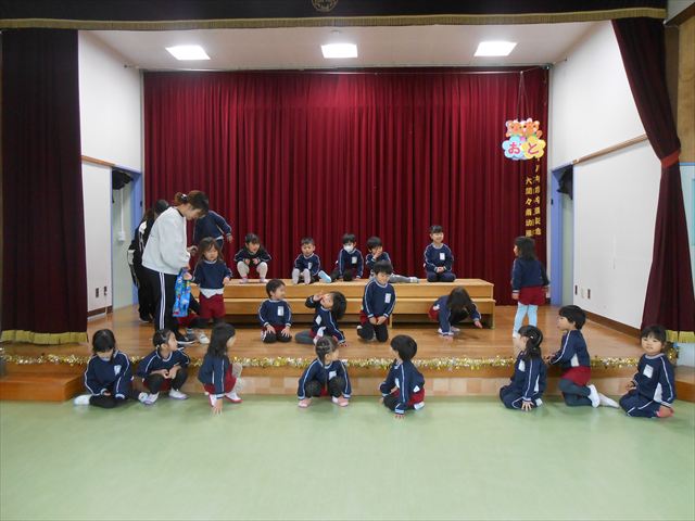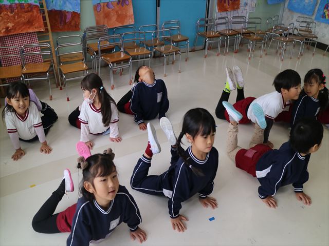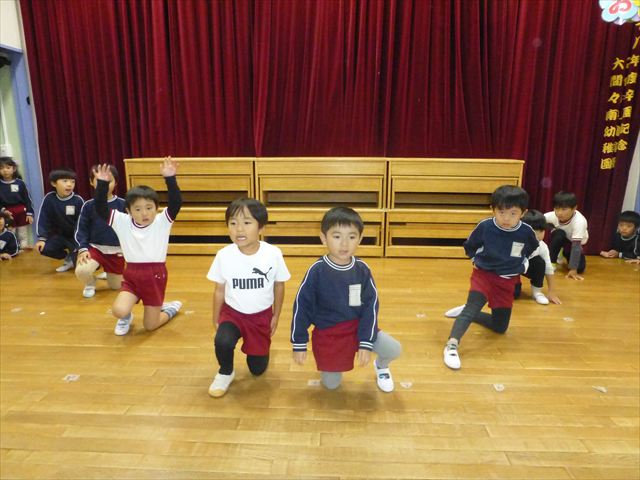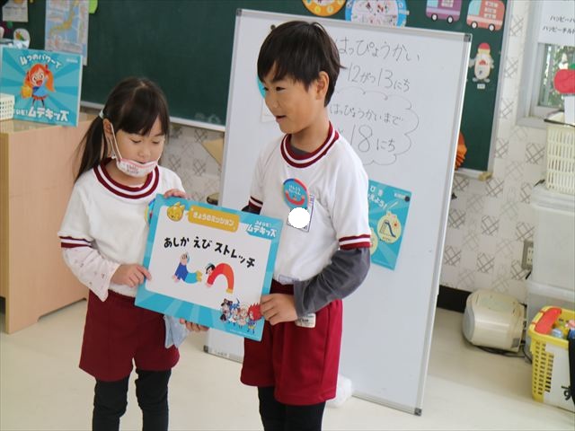 今日は(株)KIRINからいただいた紙芝居「つよいぞムテキッズ!」を読みました。大切な日に向けて免疫力を高めて、元気に過ごすために4つのパワーを身に着けようという話でした。年長さんにとって一番近い大切な日は発表会なので、発表会に向けて風邪をひかないようにムテキッズになろう!と話をしました。また毎日のミッションもあり、今日は「あしかとえびのストレッチ」をしました!みんな楽しんで取り組んでくれました。そして配布した手紙の中にミッションカードも入っていますので、ぜひお子さんと一緒におうちでも取り組んでみて下さい☆
