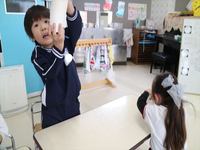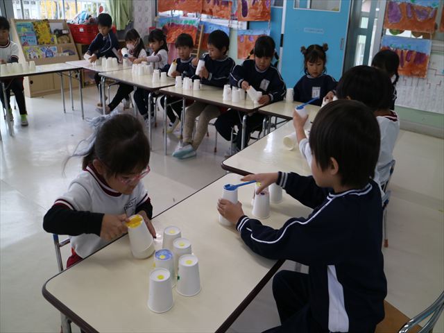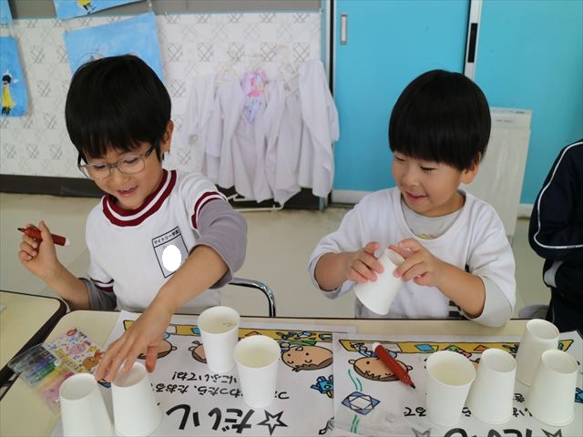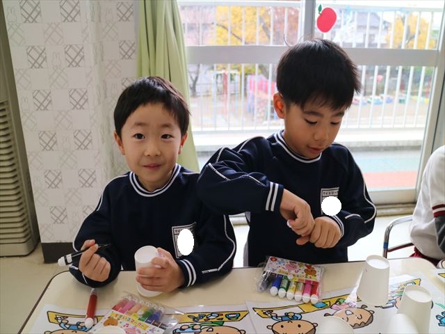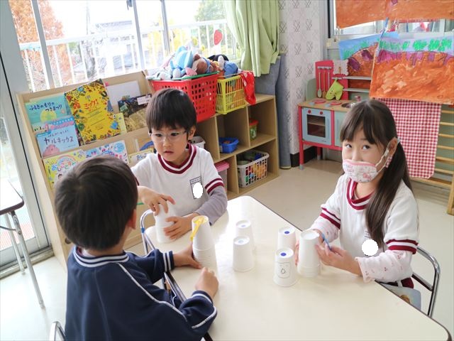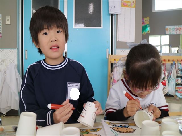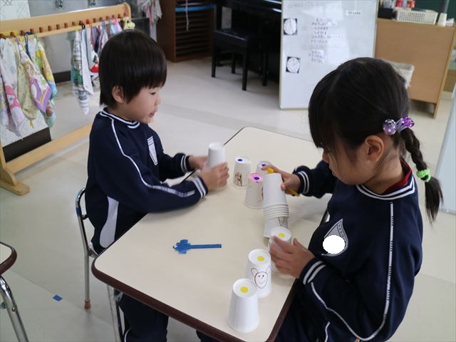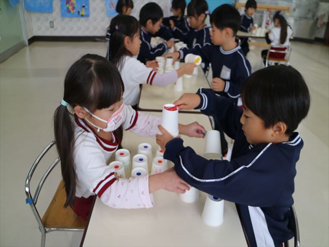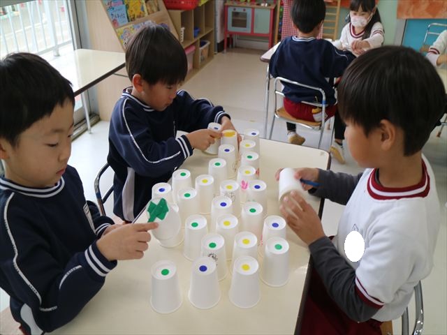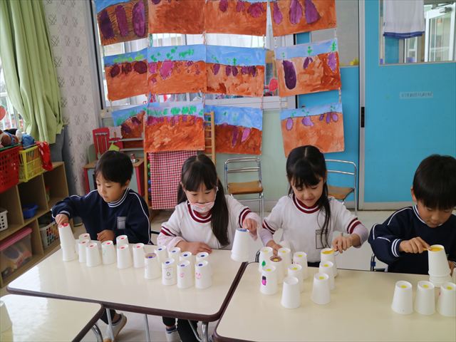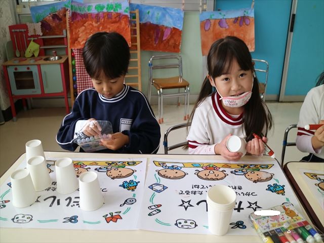 自由保育の時間を行いました。うみ組は遊べるおもちゃを作ろうと思い、紙コップでモグラ叩きを作りました。紙コップにモグラや動物の絵を描き、紙コップのハンマーで叩くという遊びでした!友だちと競争したりしながら楽しむことができました!