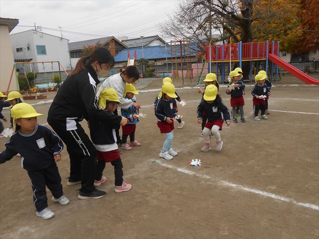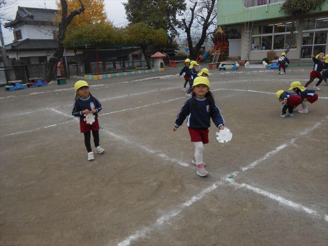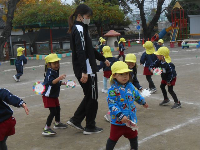 今日は、フリスビーで遊ぼう合間で発表会の練習をしました(^O^)遊戯室の練習では移動が心配になってしまう子もいますが、大きな動きで楽しそうに踊る姿が見られました(