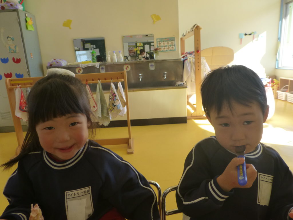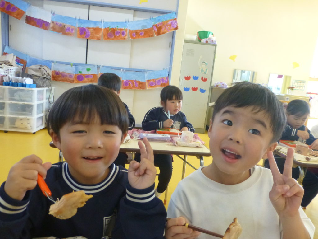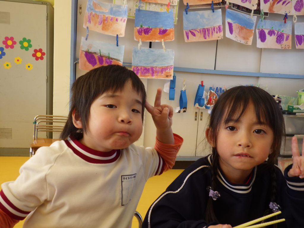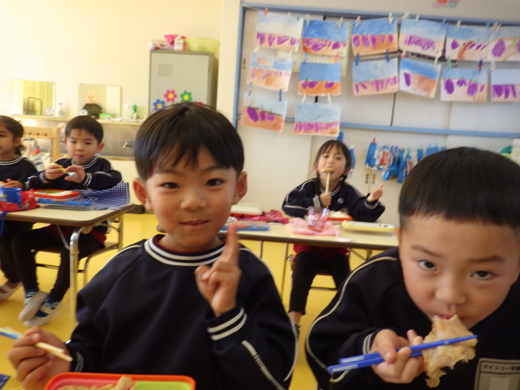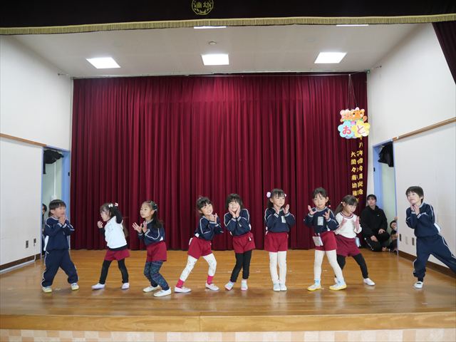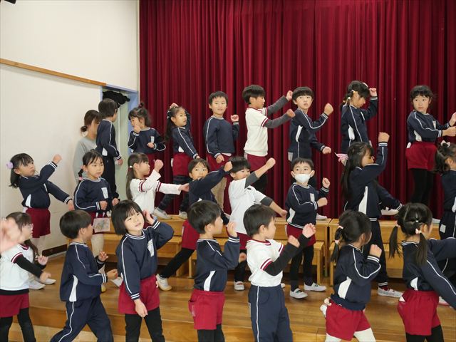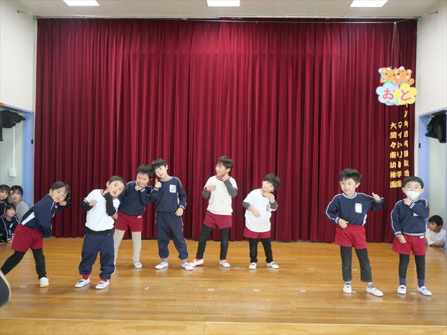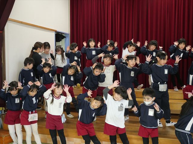 今日は(株)KIRINからいただいた紙芝居「つよいぞムテキッズ!」を読みました。大切な日に向けて免疫力を高めて、元気に過ごすために4つのパワーを身に着けようという話でした。年長さんにとって一番近い大切な日は発表会なので、発表会に向けて風邪をひかないようにムテキッズになろう!と話をしました。また毎日のミッションもあり、今日は「あしかとえびのストレッチ」をしました!みんな楽しんで取り組んでくれました。そして配布した手紙の中にミッションカードも入っていますので、ぜひお子さんと一緒におうちでも取り組んでみて下さい☆
