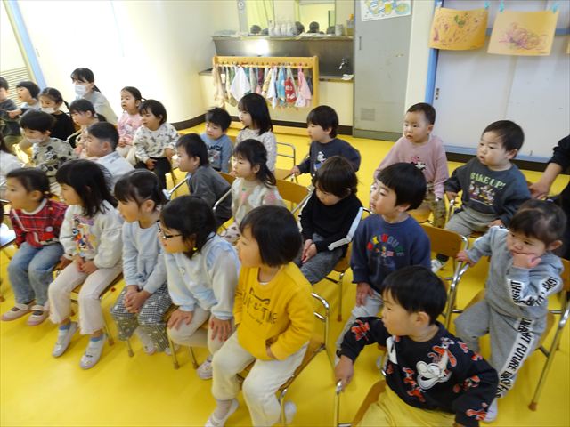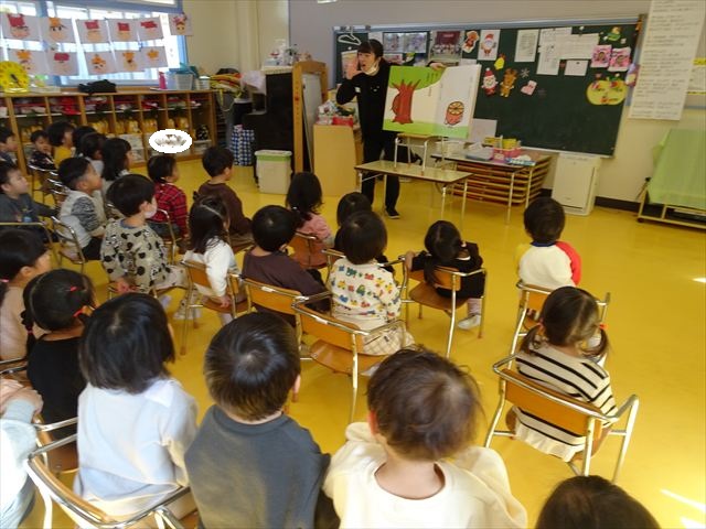 今日は、大型絵本「おべんとうバスかくれんぼ」を読みました。園庭のおべんとうバスが大好きな年少さん。絵本も楽しみながら見る事が出来ました!(^^)!