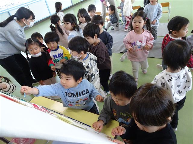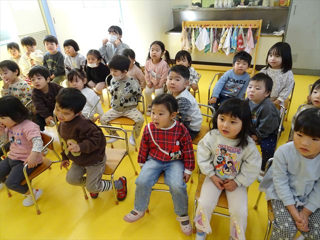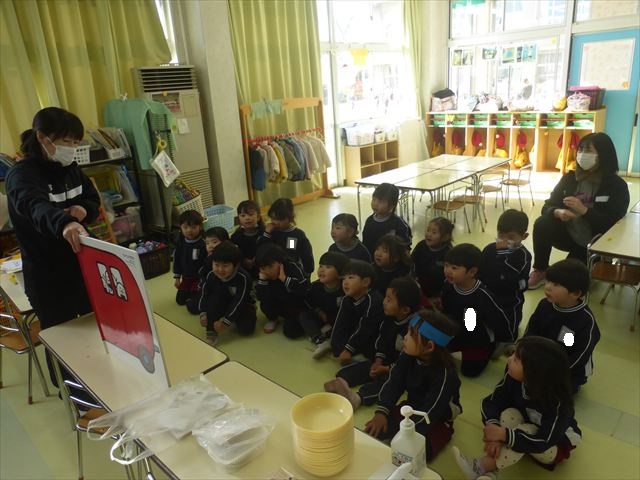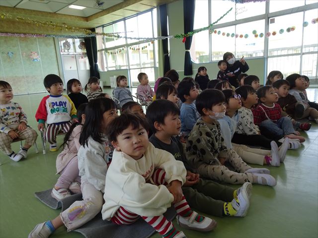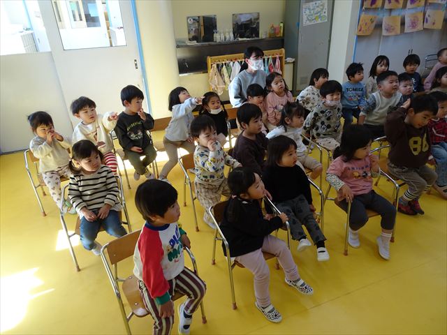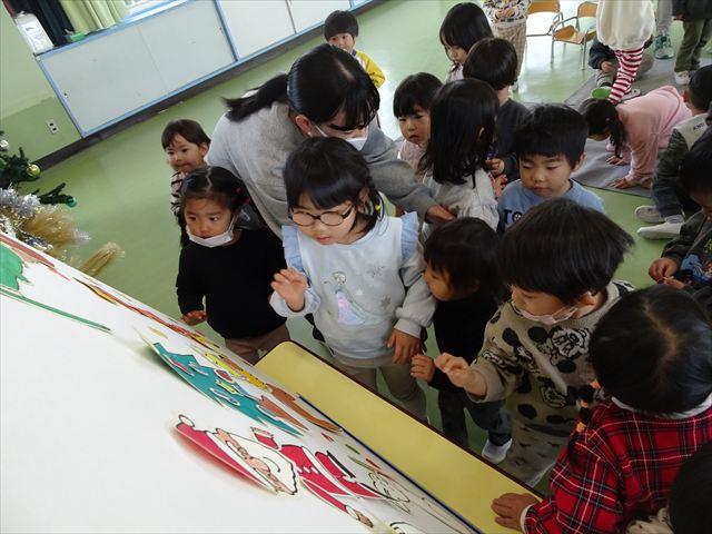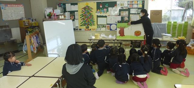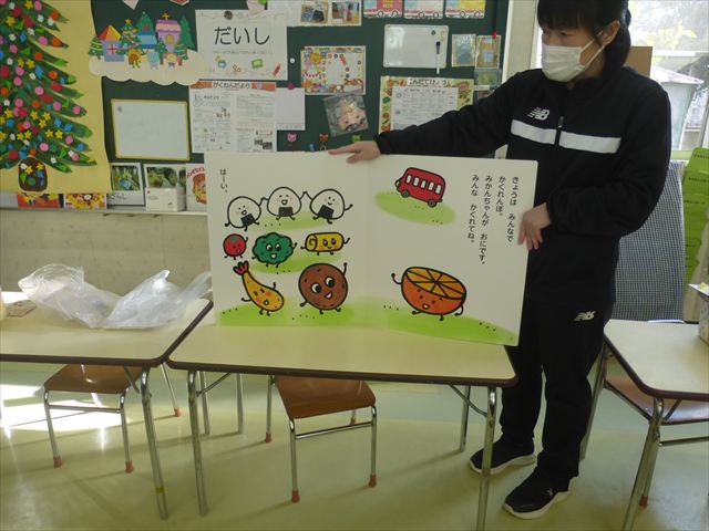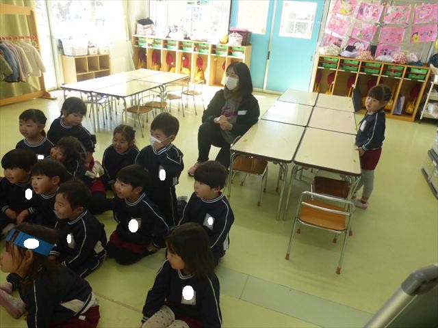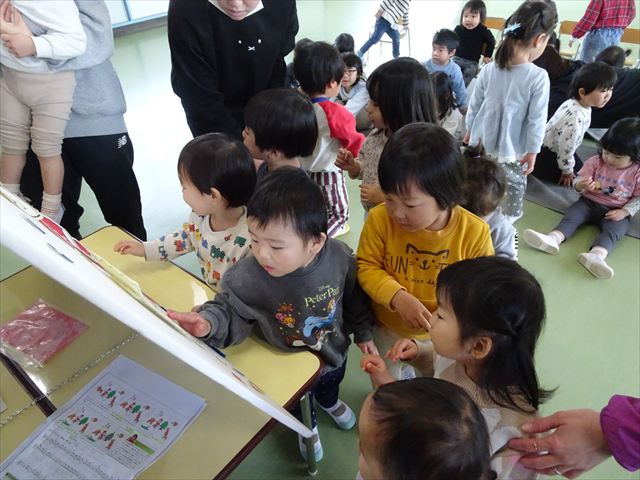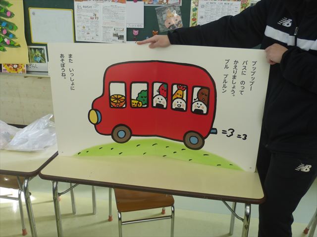 今日は、大型絵本の「おべんとうバスのかくれんぼ」の読み聞かせをしました。おべんとうバスのお友だちがみんなでかくれんぼ。たんぽぽさんも一緒に鬼になってお友だちを探してくれました!幼稚園のおべんとうバスも、たんぽぽさんに大人気☆年明けにまた仲良く遊んでね!(^^)!