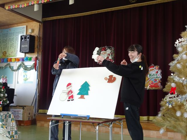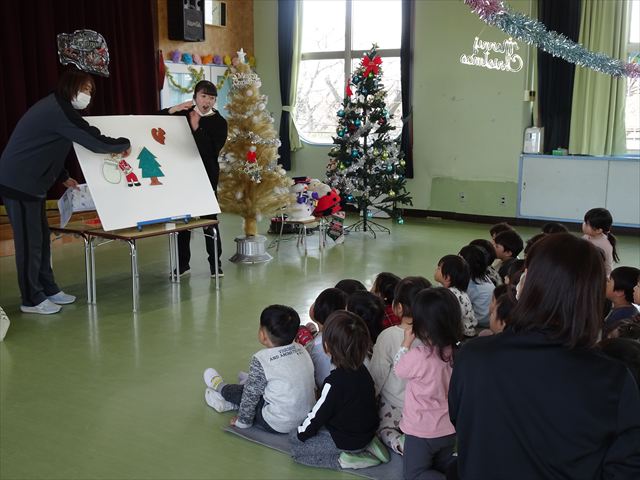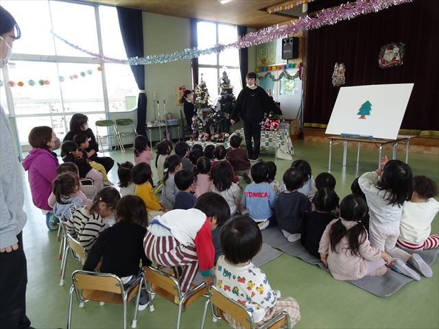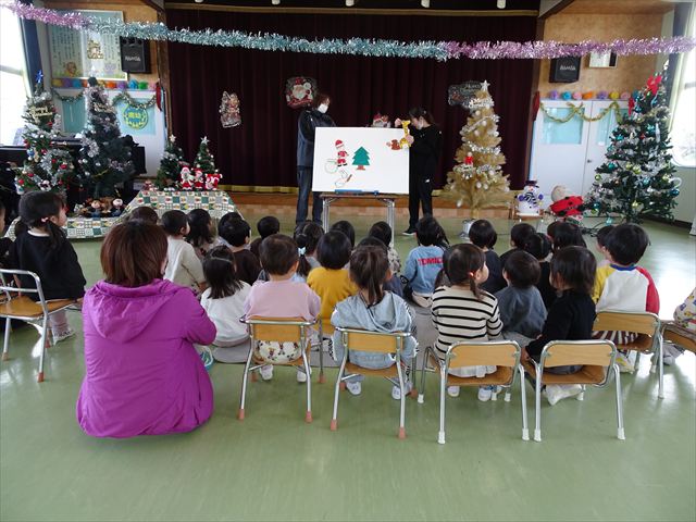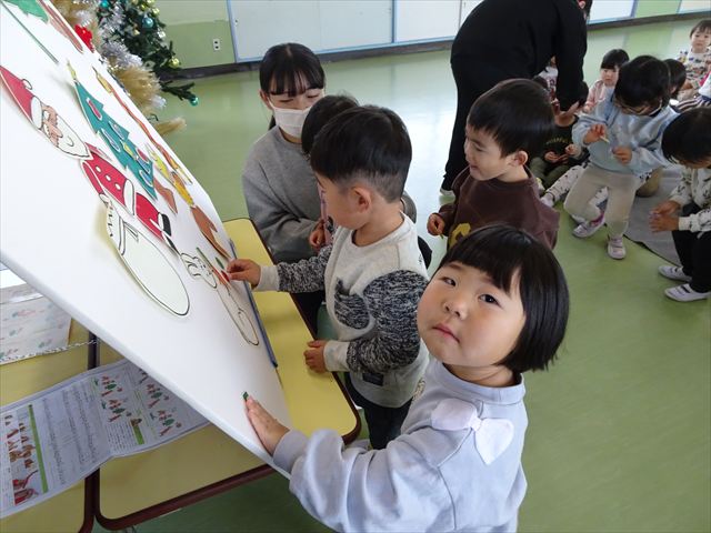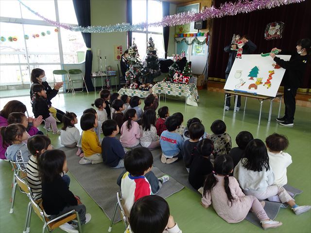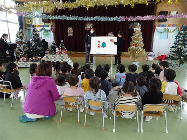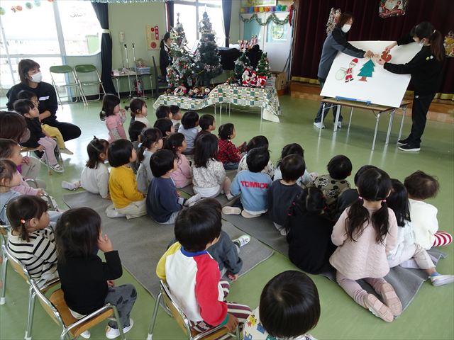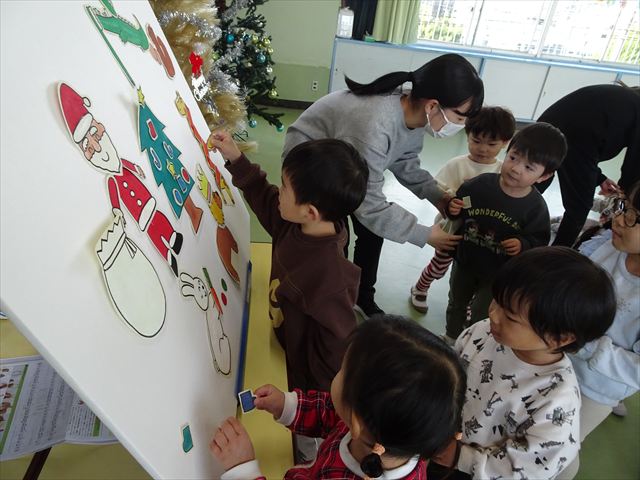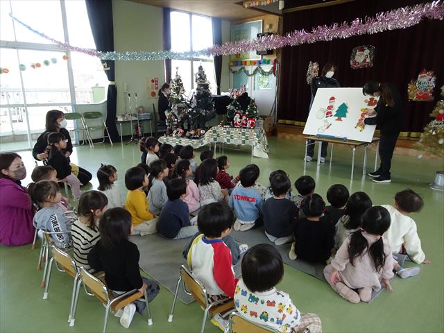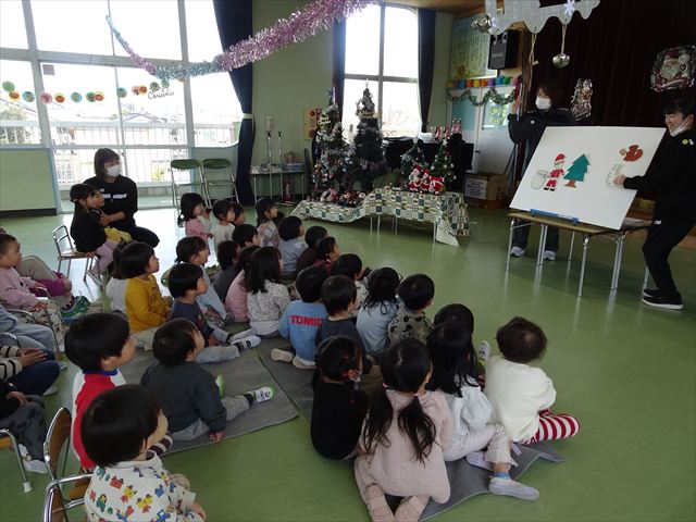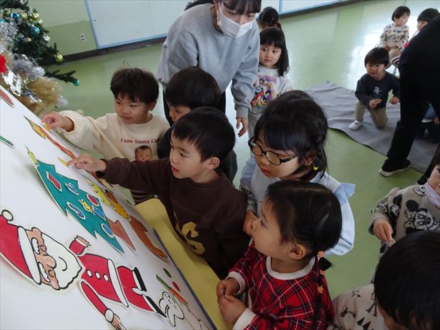 その後は、遊戯室に移動してパネルシアターを見ました。いつもと違って豪華な遊戯室にたんぽぽさんは大喜び!!「サンタさんだ!」「クリスマスだね~」とお話していると、真ん中にポツンとクリスマスツリーが!今回は「森のクリスマス」というお話のパネルシアターを、ともえ先生のピアノに合わせて楽しみました。サンタさんが、森の動物さんたちにクリスマスプレゼントを持ってきてくれました!リスさんには大好きなクルミ。うさぎさんにも大好物のにんじん。首が長くて寒そうなキリンさんにはマフラー。森の王様のライオンさんには冠。虫歯になってしまって歯が痛いワニさんにはハブラシ。それぞれピッタリのクリスマスプレゼントを渡してくれました!(^^)!最後はたんぽぽさんみんなでクリスマスの飾り付け☆初めて見るパネルシアターに子どもたちは釘付けで、先生の歌やともえ先生のピアノの効果音を聴いて体を揺らしながら、真剣なまなざしで見てくれました。みんなのところにもサンタさん来るかな?とワクワクのたんぽぽさん。午後のクリスマスイベントでサンタさんに会えて、とっても嬉しそうでした♡