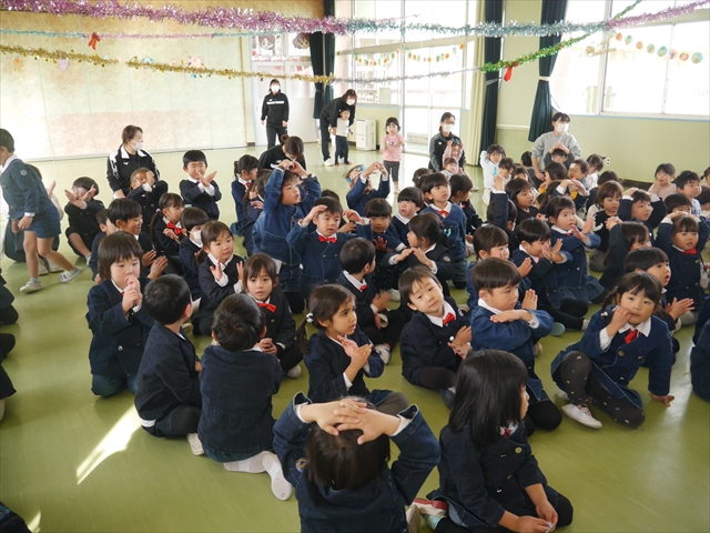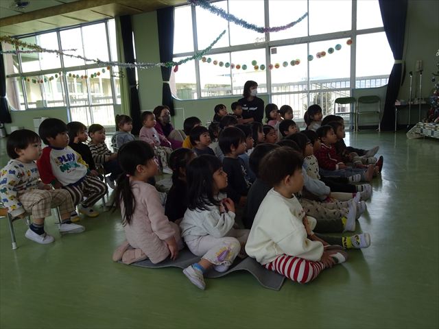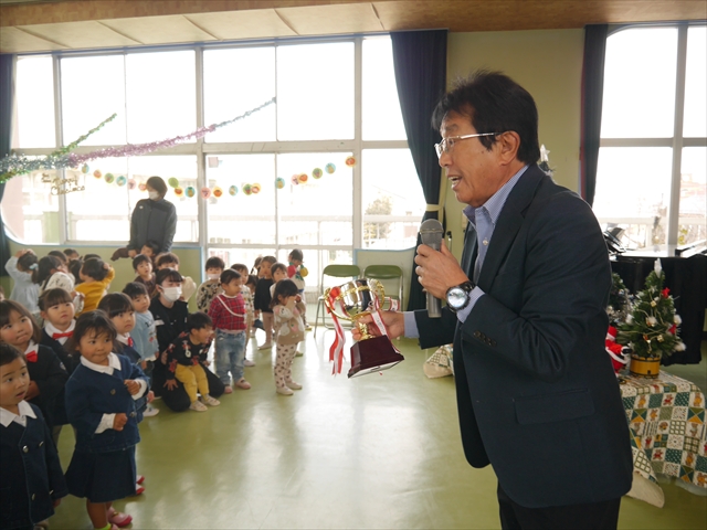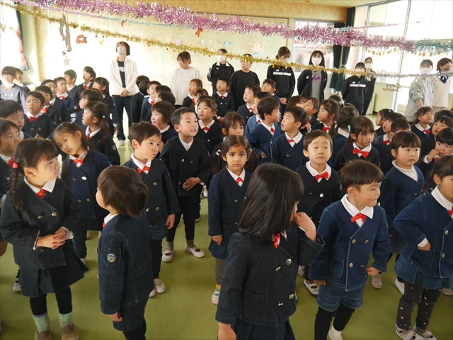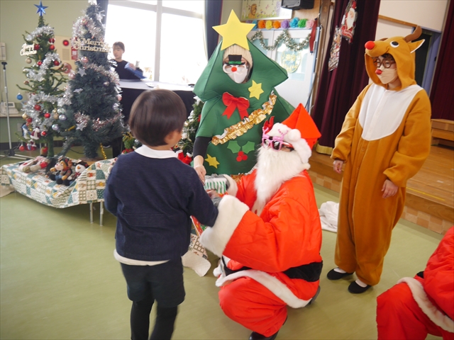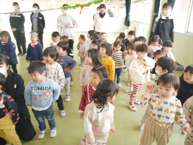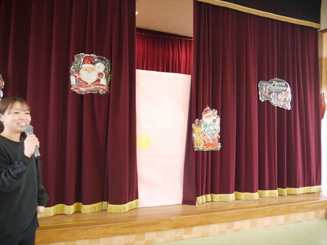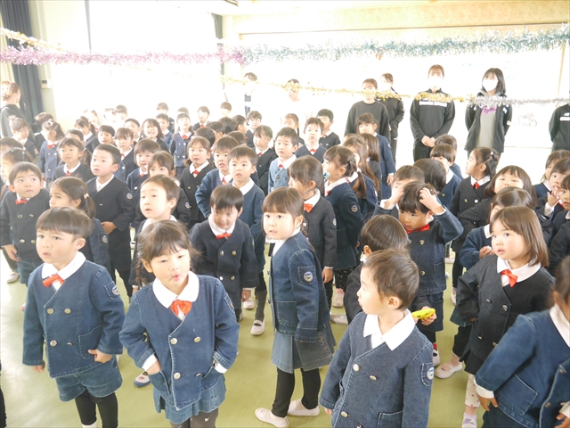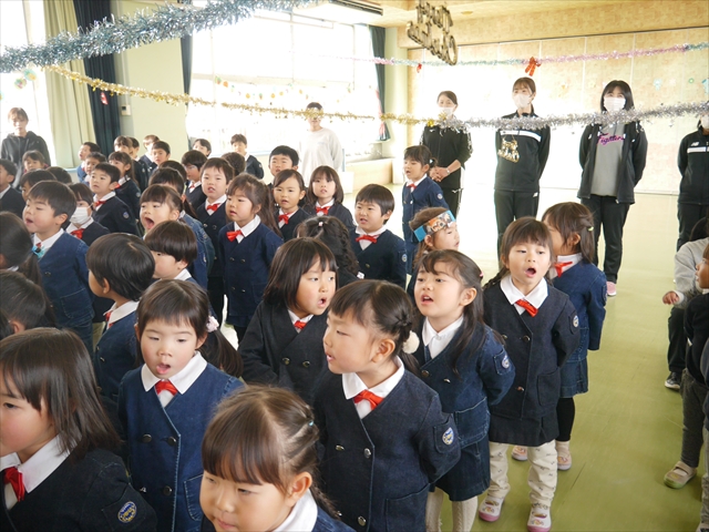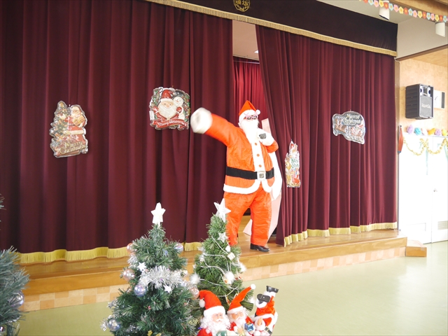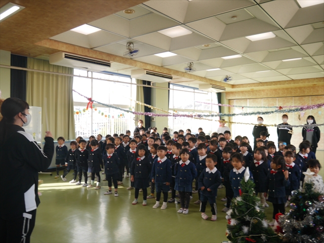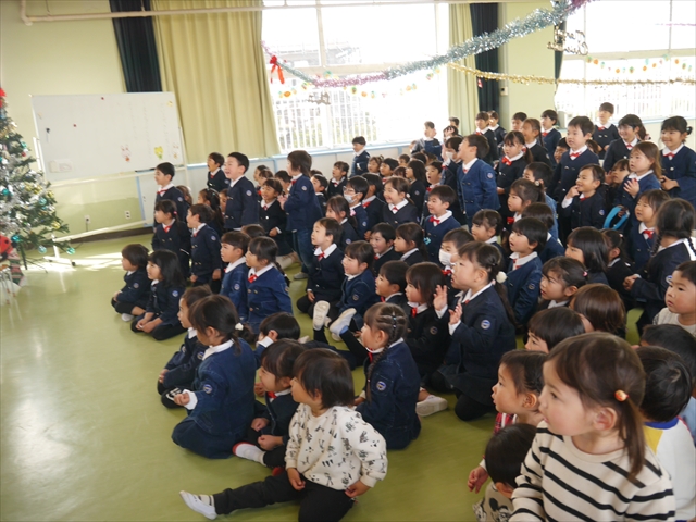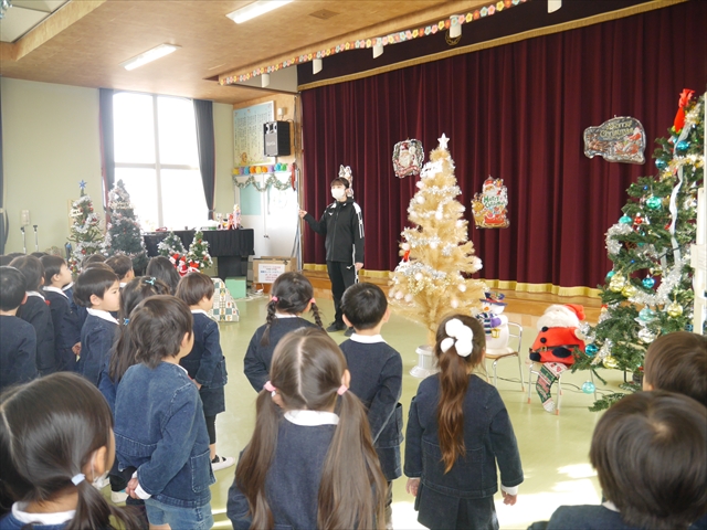 園長先生から、「みんな2学期の様々な行事や活動に頑張って取り組み、いっぱい楽しんで、とっても大きく成長してえらかったです。」と話があり、また、「冬休みは、上毛カルタとなわとびを頑張ってください!園長先生からの冬休みの宿題です!上毛かるたもなわとびも鉄棒なども何でもそうですが、練習をやればやるほど上手になります。でも、何もやらない子、練習しない子、努力しない子は絶対に上手になりません。だから、みんな練習頑張ってください。」と話がありました。ですので、お父さん、お母さん、お家の人たちにお願いです。この冬休み、是非子どもたちと一緒に「上毛カルタ」と「なわとび」をやってあげてください。よろしくお願いします!m(_ _)m 今年は年長さんだけでなく、初めて年中さんも「マイトリー杯上毛かるた大会」を開催しますので、気合いを入れて頑張ってください。また、年長さんと年中さんは、今年も「マイトリーカップなわとび大会(前跳び)」を開催します!だから、「なわとび」も頑張ってください!ヘ(^o^)/ 朝礼の最後にかわいいサンタクロースから話がありました! サンタさんが何を話たのか?お子さんに聞いてみて下さい!(^_^;)