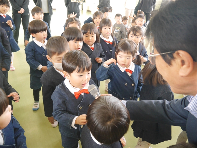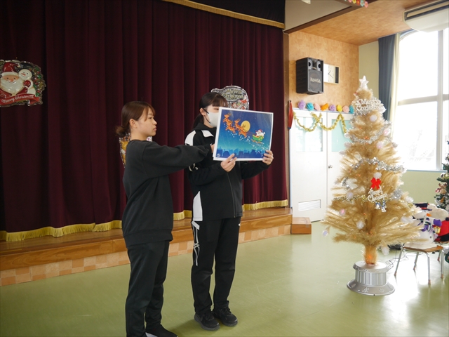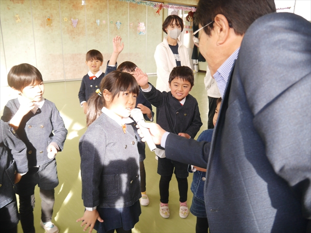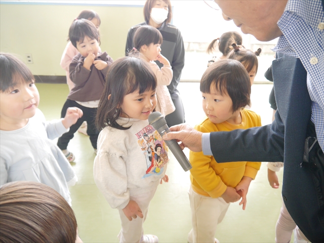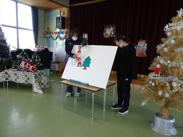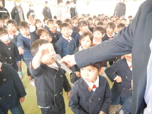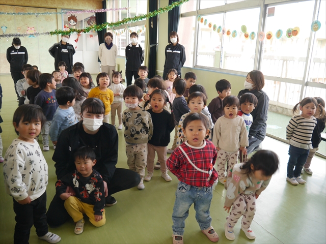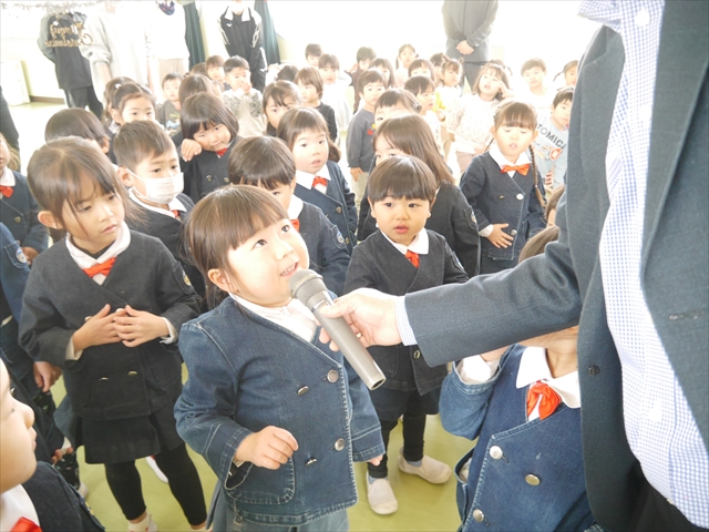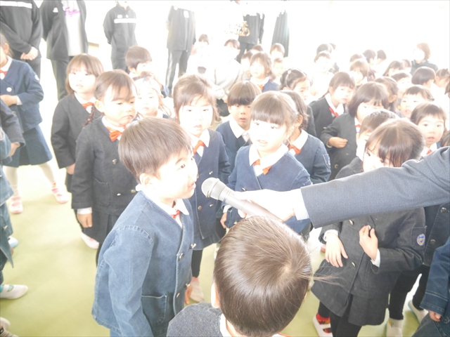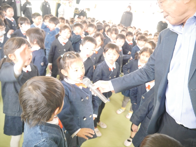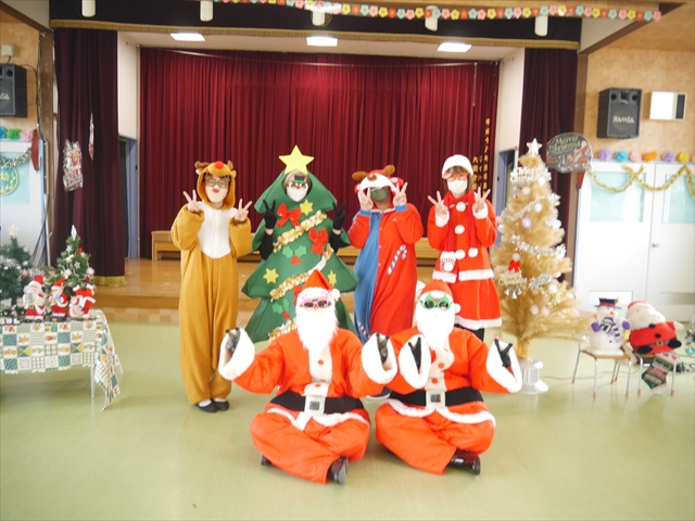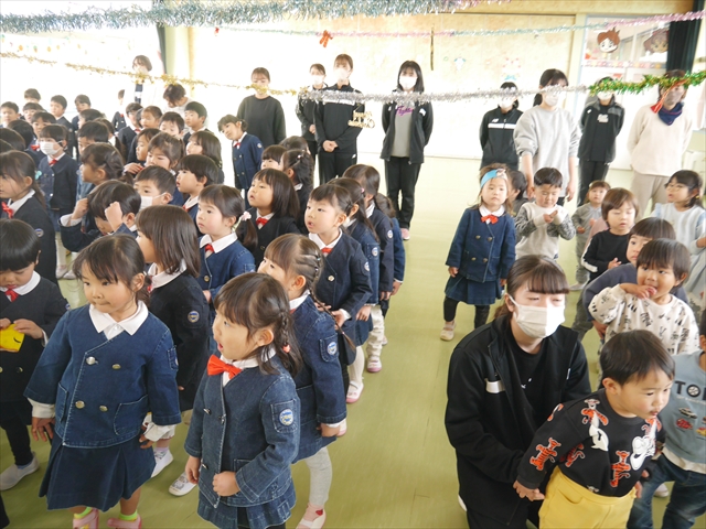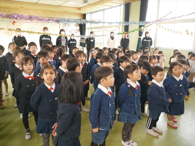 園長先生から、「みんな2学期の様々な行事や活動に頑張って取り組み、いっぱい楽しんで、とっても大きく成長してえらかったです。」と話があり、また、「冬休みは、上毛カルタとなわとびを頑張ってください!園長先生からの冬休みの宿題です!上毛かるたもなわとびも鉄棒なども何でもそうですが、練習をやればやるほど上手になります。でも、何もやらない子、練習しない子、努力しない子は絶対に上手になりません。だから、みんな練習頑張ってください。」と話がありました。ですので、お父さん、お母さん、お家の人たちにお願いです。この冬休み、是非子どもたちと一緒に「上毛カルタ」と「なわとび」をやってあげてください。よろしくお願いします!m(_ _)m 今年は年長さんだけでなく、初めて年中さんも「マイトリー杯上毛かるた大会」を開催しますので、気合いを入れて頑張ってください。また、年長さんと年中さんは、今年も「マイトリーカップなわとび大会(前跳び)」を開催します!だから、「なわとび」も頑張ってください!ヘ(^o^)/ 朝礼の最後にかわいいサンタクロースから話がありました! サンタさんが何を話たのか?お子さんに聞いてみて下さい!(^_^;)