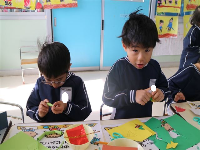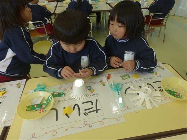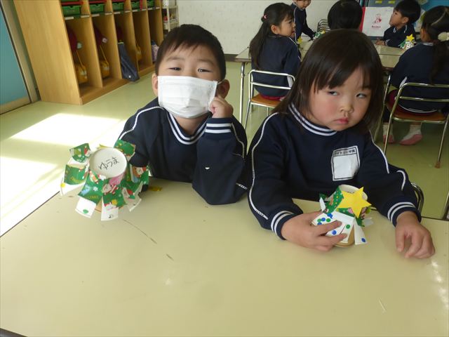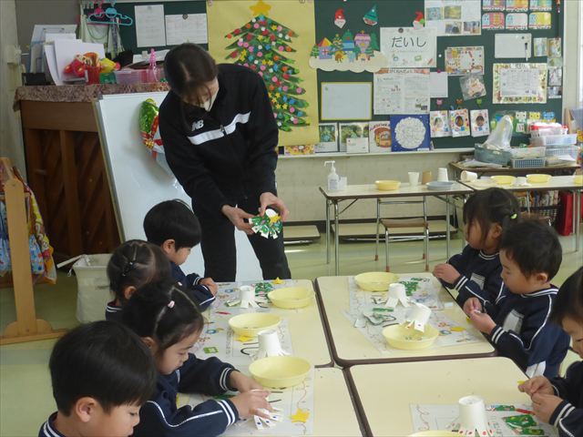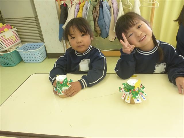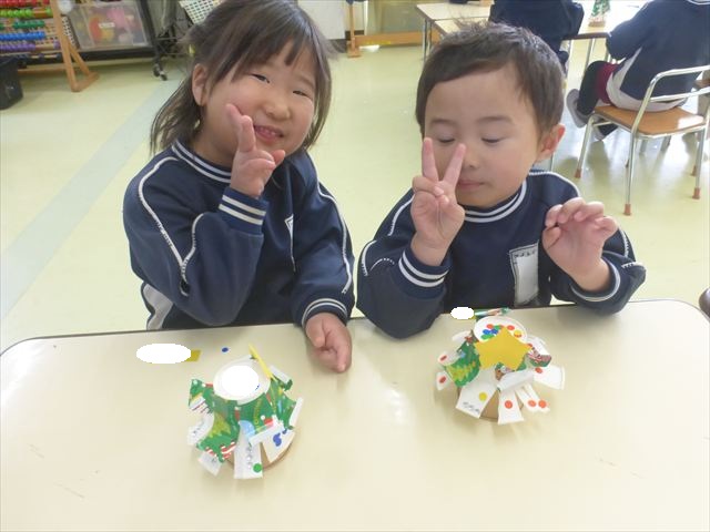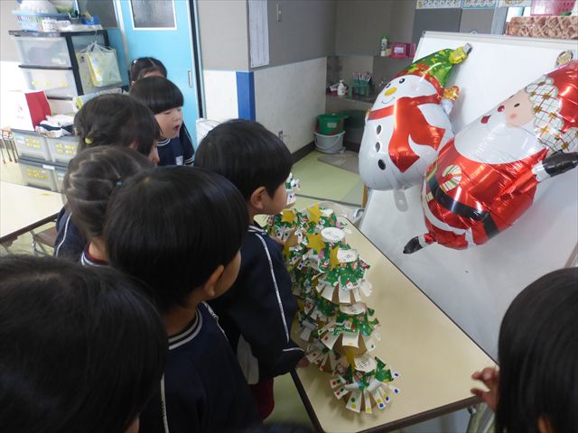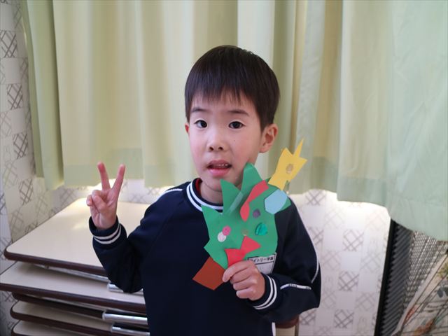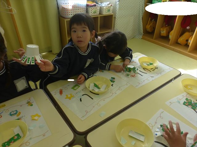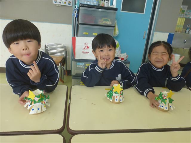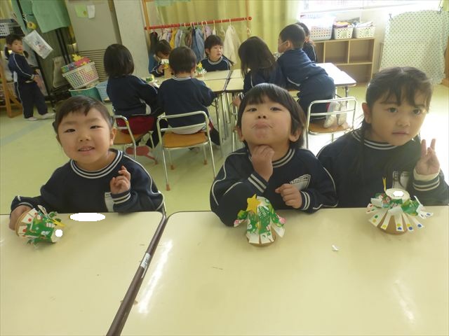 今年度から新たに取り入れた本園の特色の一つで、月に1回程度「自由保育の時間」のカリキュラムを組み込みました。これは、園児主体ではなく、教師主体を重視したカリキュラムです。この時間は、先生たち教師主体・教師の主張の保育・授業であり、担任(各クラスごと)が、園児の成長・教育のために、先生方が指導・保育したい内容・方法・日程・時間等を自由に設定して実施するものです。今までのカリキュラムを無視しても、幼稚園教育要領を逸脱しても、レベルが高すぎても低すぎても問題なく、とにかく先生たちが子どもたちに教えたい、学ばせたい、遊ばせたい、やらせたいものを好きにやる時間です。 今月は「クリスマスツリー」を作りました。紙コップを使ってクリスマス柄の包装紙を くるくるして上から貼ってシールで飾り付けをしました。ハサミで紙コップを切るのはドキドキの年少さんでしたが、個性も出てかわいいツリーを作ることができました。今日は、色画用紙を半分に折って線の上を切ると「星」が出来る活動もしました。見本を見せると「わぁ~」と喜ぶお友だちでした。実際は、線の上を切るのは難しい子もいましたが、広げて星が出来るととっても嬉しそうでした。最後はみんなのツリーを重ねて大きいツリーを作りました(