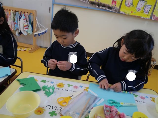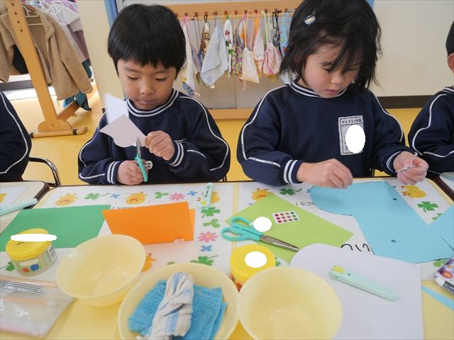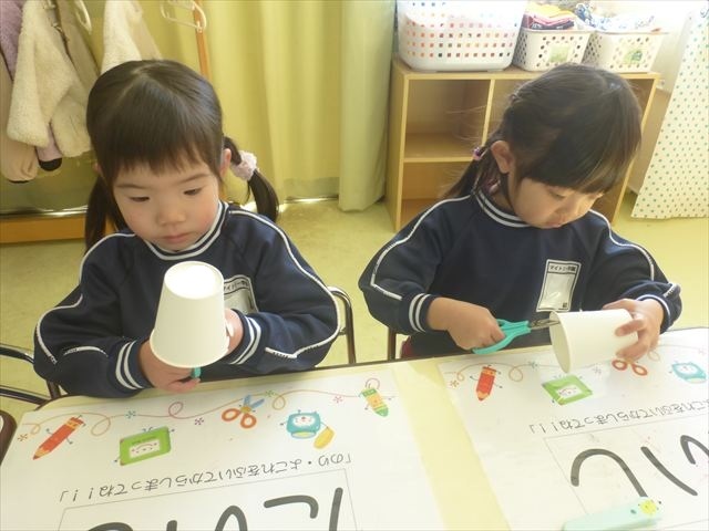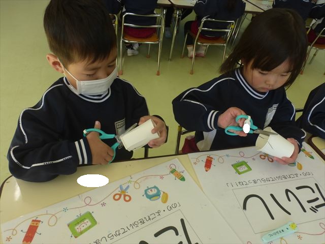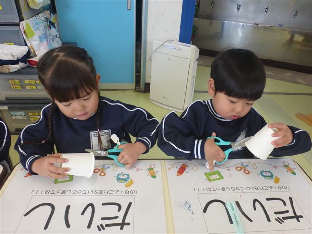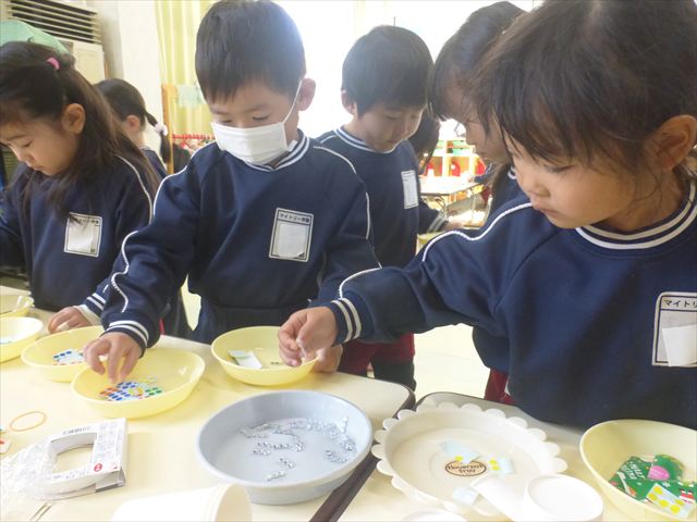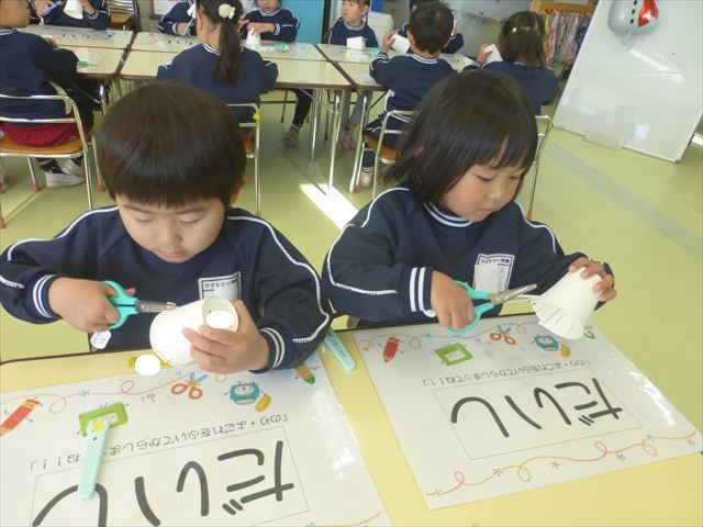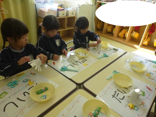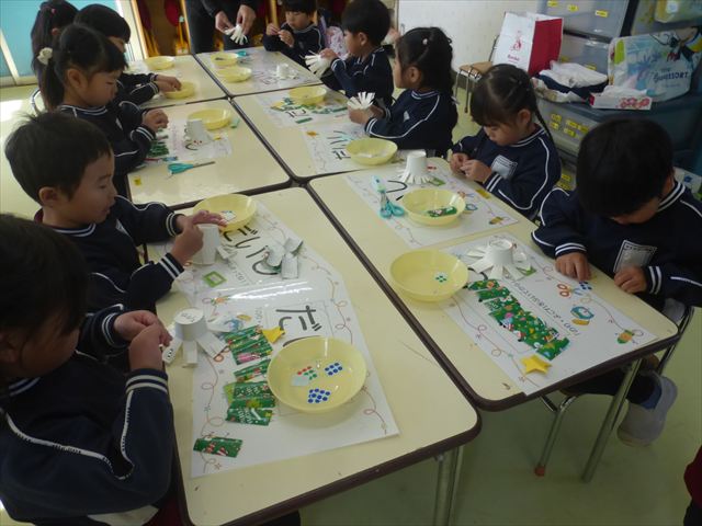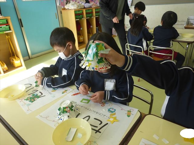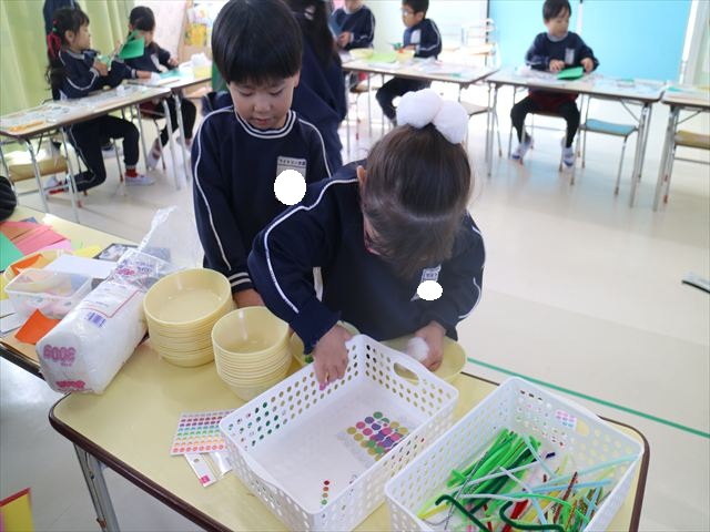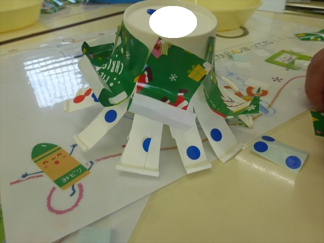 今年度から新たに取り入れた本園の特色の一つで、月に1回程度「自由保育の時間」のカリキュラムを組み込みました。これは、園児主体ではなく、教師主体を重視したカリキュラムです。この時間は、先生たち教師主体・教師の主張の保育・授業であり、担任(各クラスごと)が、園児の成長・教育のために、先生方が指導・保育したい内容・方法・日程・時間等を自由に設定して実施するものです。今までのカリキュラムを無視しても、幼稚園教育要領を逸脱しても、レベルが高すぎても低すぎても問題なく、とにかく先生たちが子どもたちに教えたい、学ばせたい、遊ばせたい、やらせたいものを好きにやる時間です。 今月は「クリスマスツリー」を作りました。紙コップを使ってクリスマス柄の包装紙を くるくるして上から貼ってシールで飾り付けをしました。ハサミで紙コップを切るのはドキドキの年少さんでしたが、個性も出てかわいいツリーを作ることができました。今日は、色画用紙を半分に折って線の上を切ると「星」が出来る活動もしました。見本を見せると「わぁ~」と喜ぶお友だちでした。実際は、線の上を切るのは難しい子もいましたが、広げて星が出来るととっても嬉しそうでした。最後はみんなのツリーを重ねて大きいツリーを作りました(