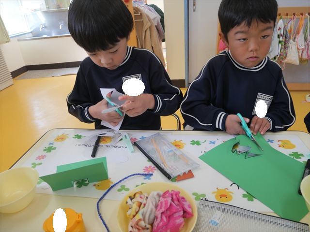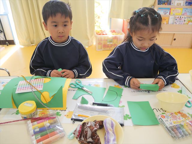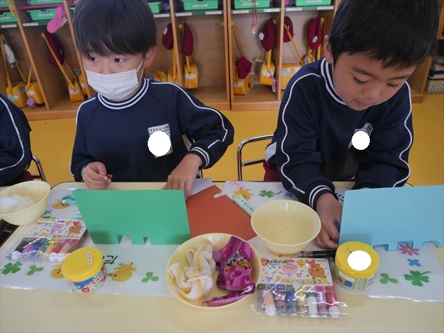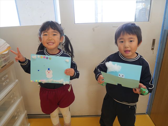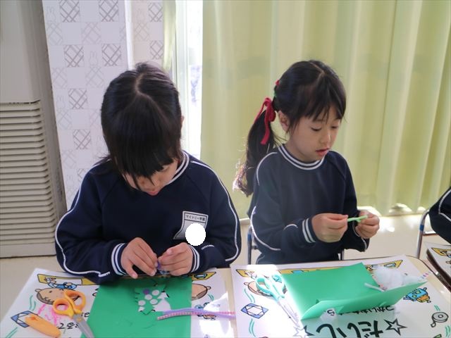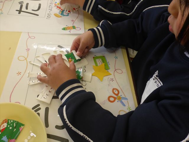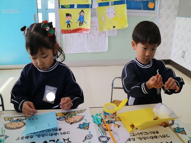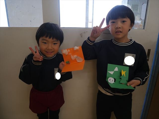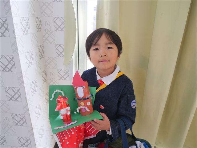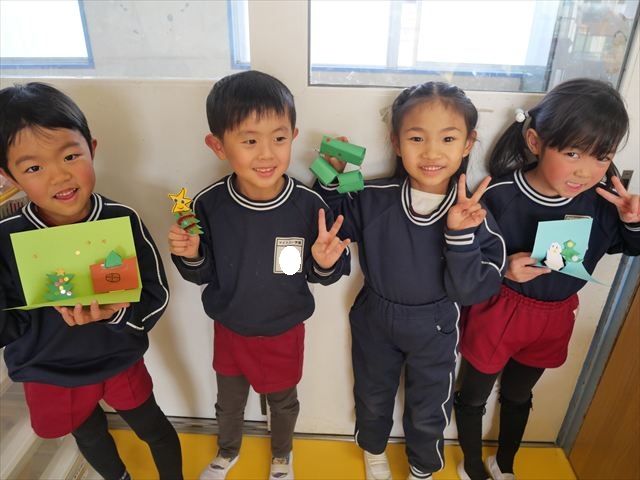 その後は主体性の時間として「クリスマス製作」をしました。今回は画用紙やモール、綿などを使って自由にクリスマスの製作をしてみました。いくつかの見本や飛び出すカードの作り方を伝えると挑戦する子も多く、自分で考えて創意工夫された作品をつくることができました☆