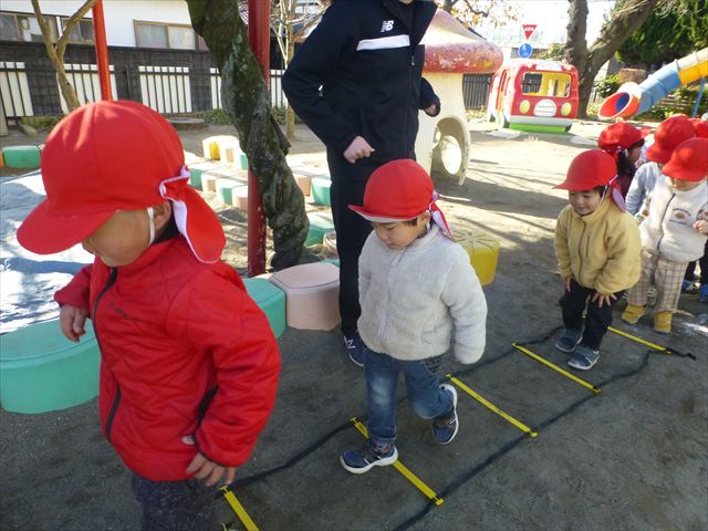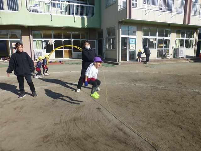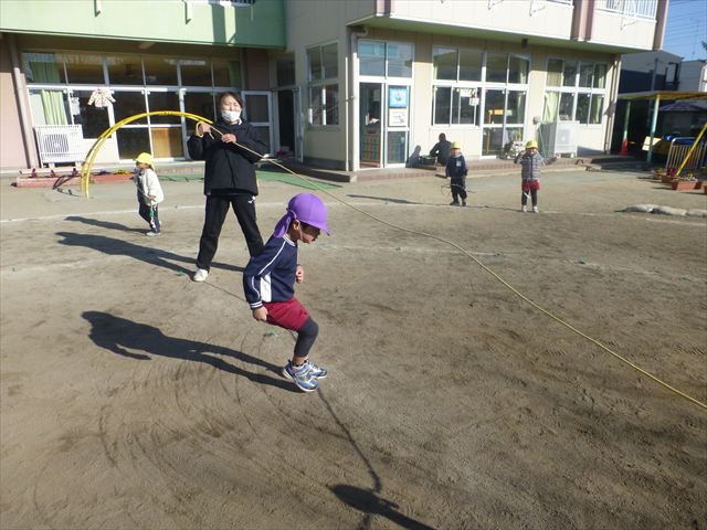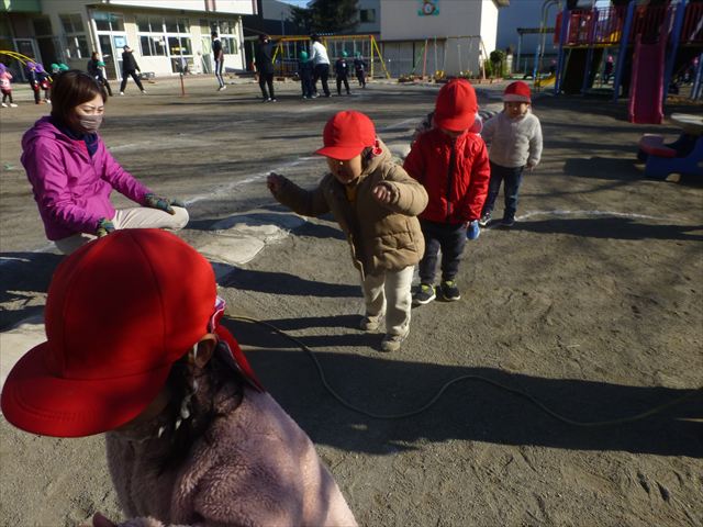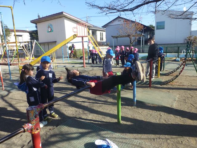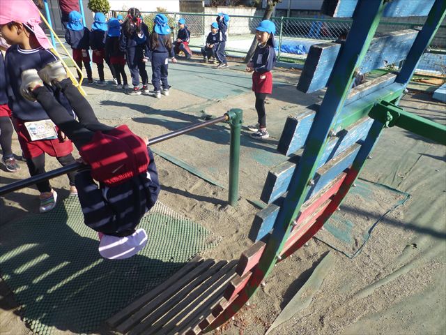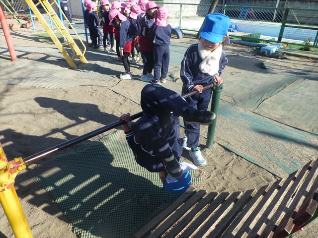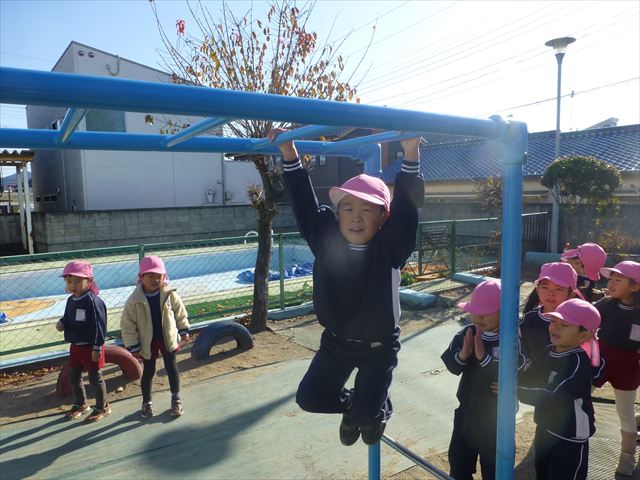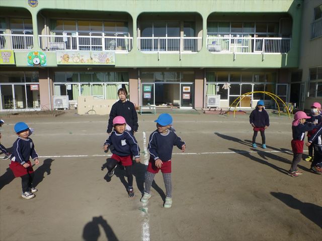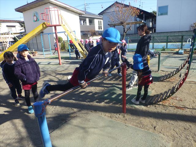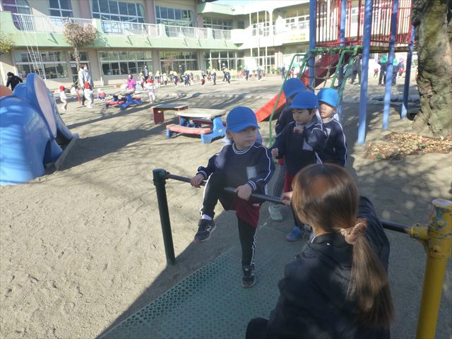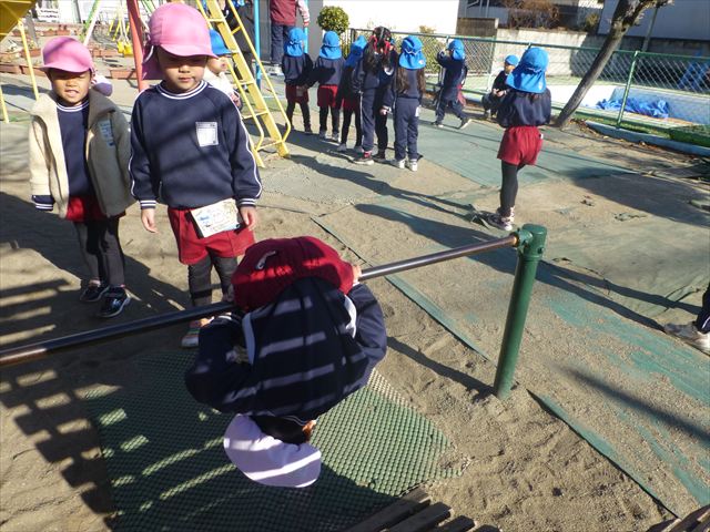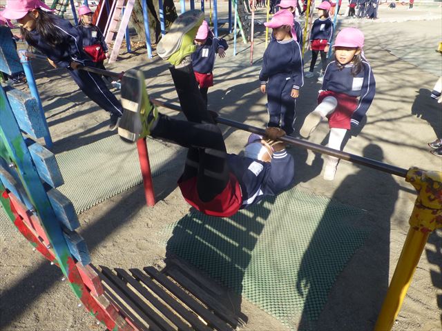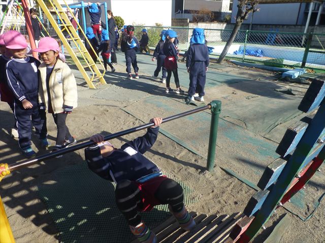 今日の朝の活動は、第2学期最後の「やんちゃ怪獣どかーん体操」と「サーキットトレーニング2」を行いました。朝からとても寒かったですが、みんな寒さなんかに負けず、全員が体操もサーキットも頑張りました。サーキットトレーニングでは、年長さんが「鉄棒」と「雲梯」を行い、年中さんが「長縄跳び」、年少さんが「なわとび」、 たんぽぽさんが、「ジャンプ遊び」を行い、みんな張り切って今年最後の運動を頑張り、「運動納め」をしました。(^_^;)えらい!えらい!(^_^)v ヘ(^o^)/