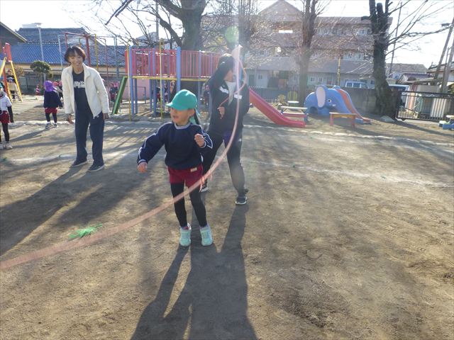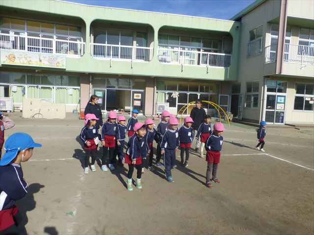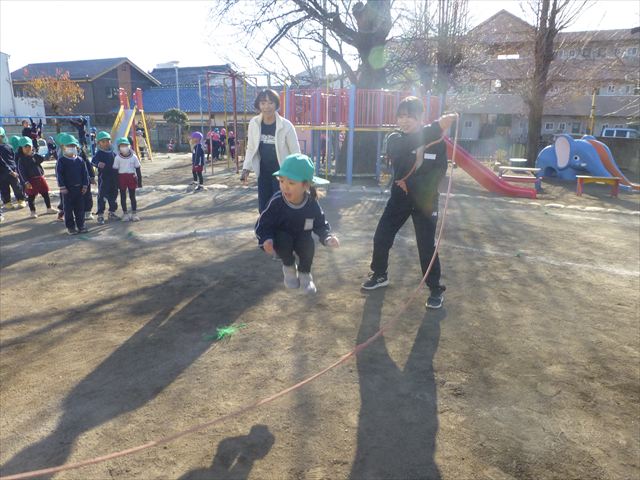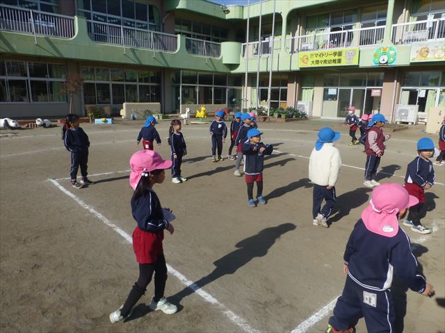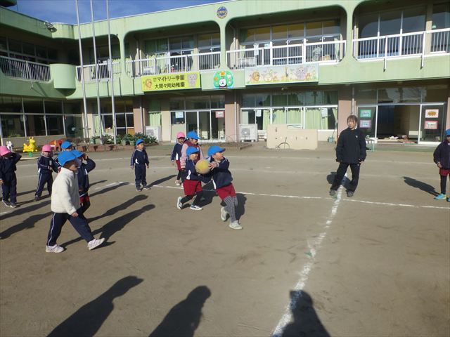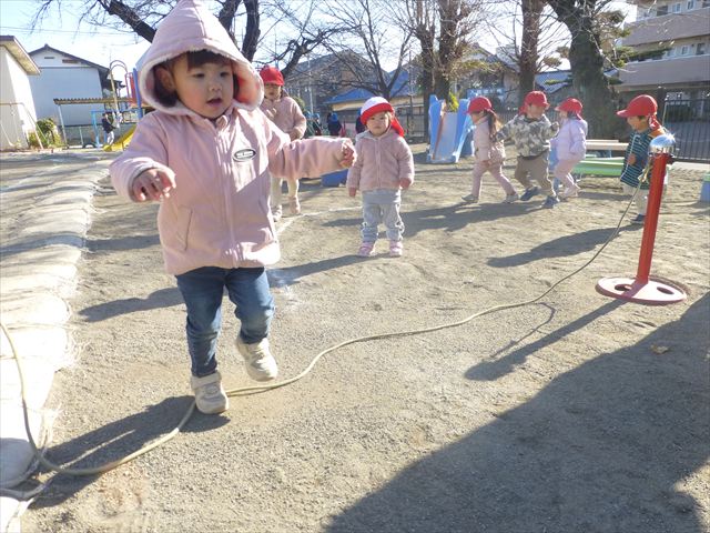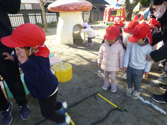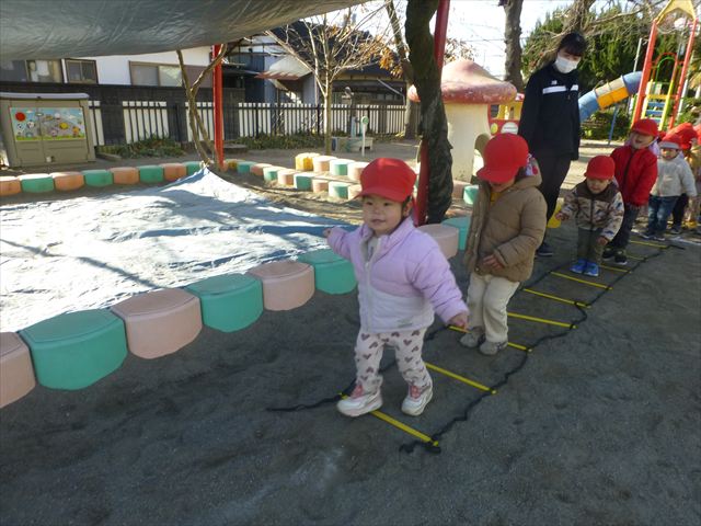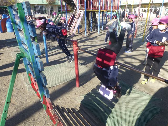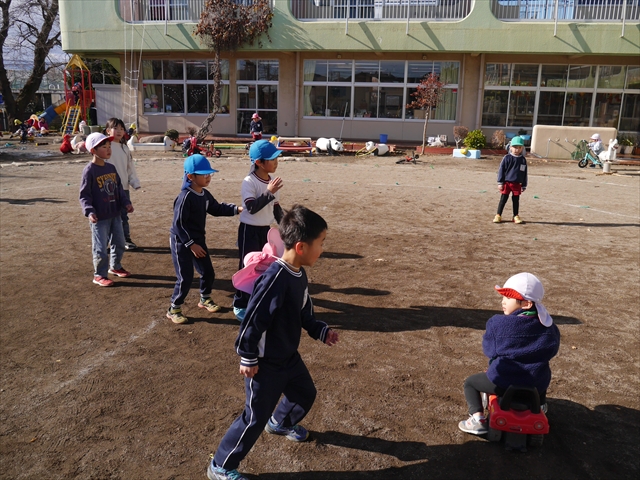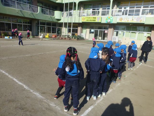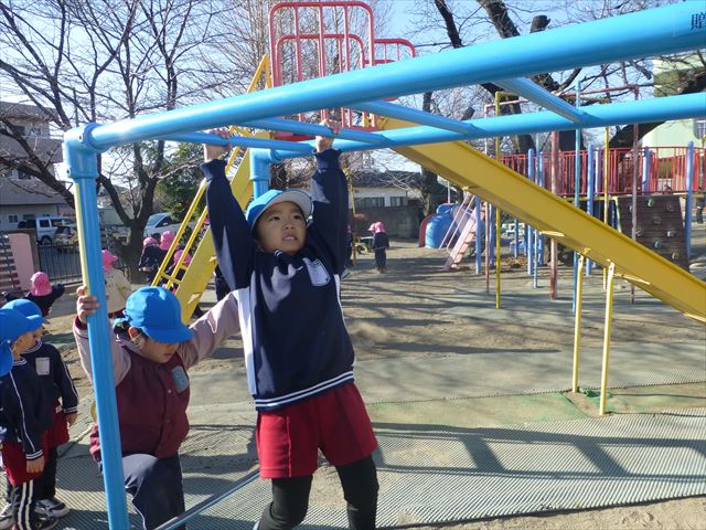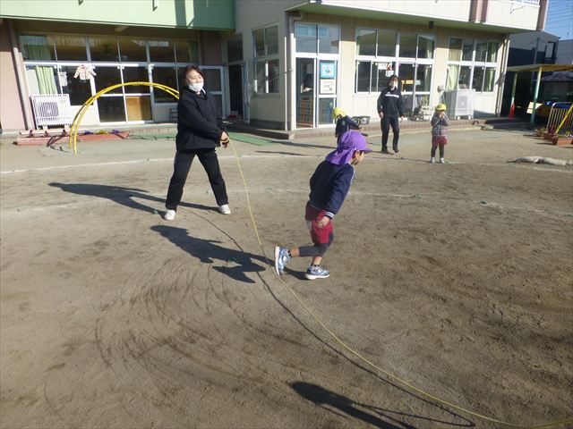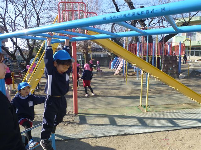 今日の朝の活動は、第2学期最後の「やんちゃ怪獣どかーん体操」と「サーキットトレーニング2」を行いました。朝からとても寒かったですが、みんな寒さなんかに負けず、全員が体操もサーキットも頑張りました。サーキットトレーニングでは、年長さんが「鉄棒」と「雲梯」を行い、年中さんが「長縄跳び」、年少さんが「なわとび」、 たんぽぽさんが、「ジャンプ遊び」を行い、みんな張り切って今年最後の運動を頑張り、「運動納め」をしました。(^_^;)えらい!えらい!(^_^)v ヘ(^o^)/