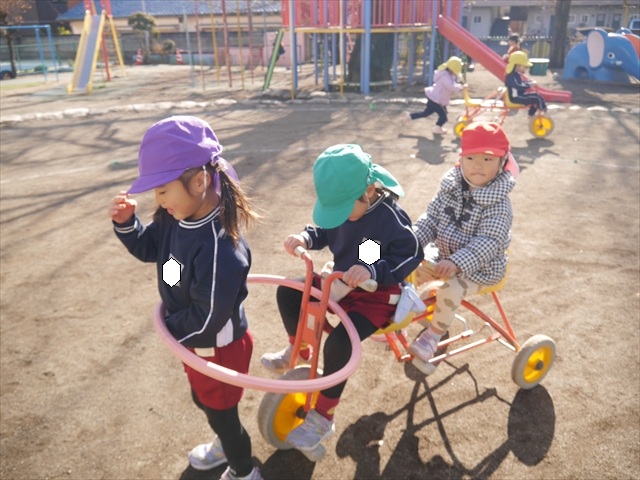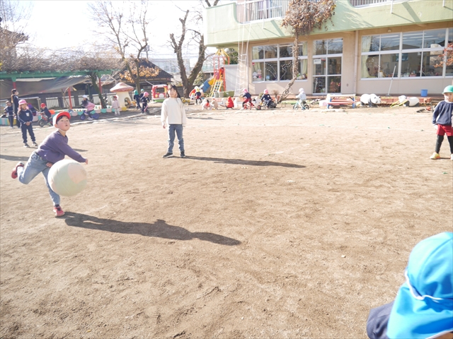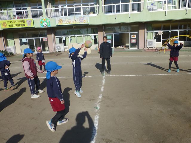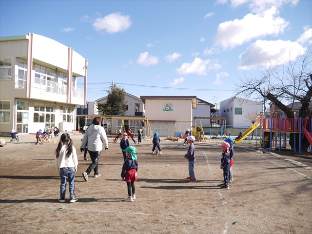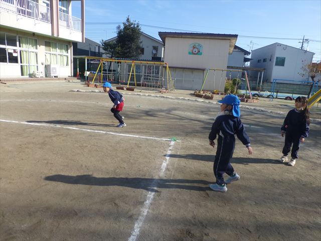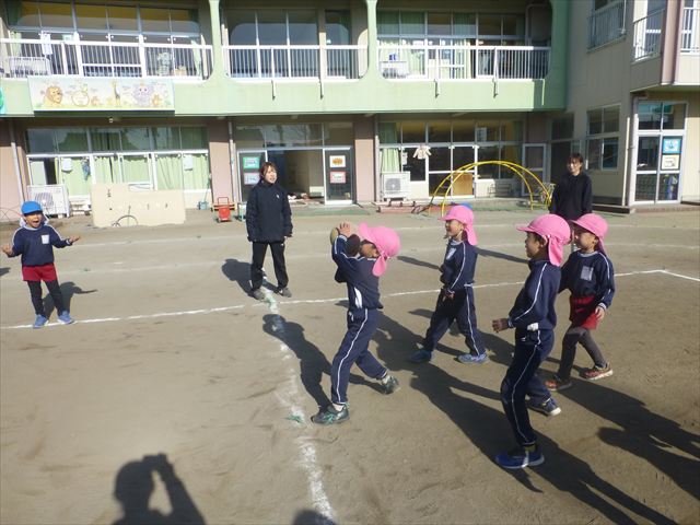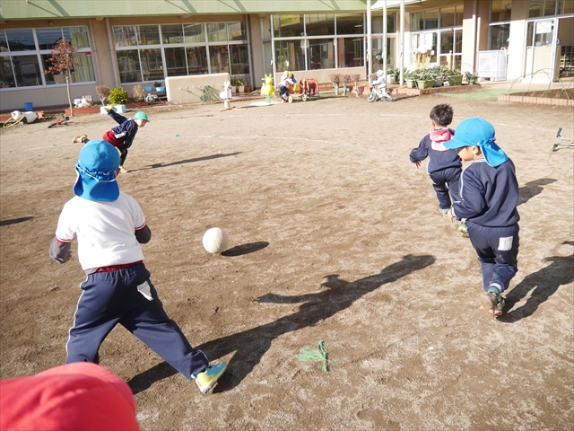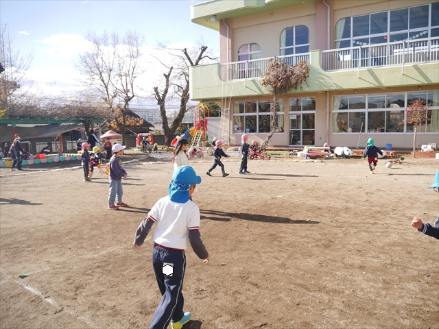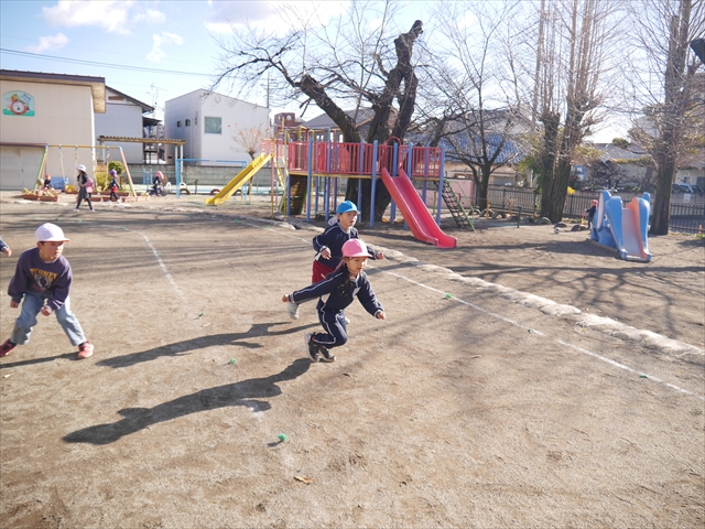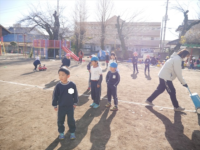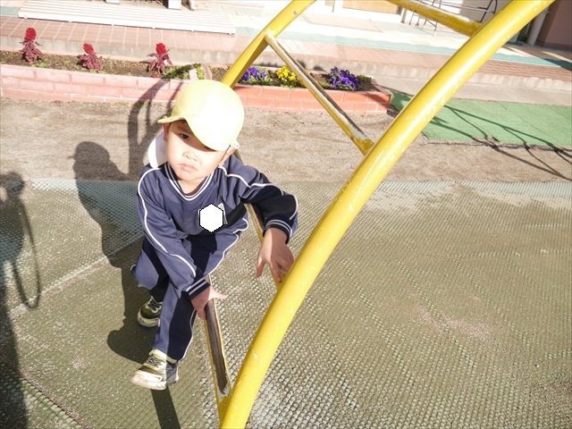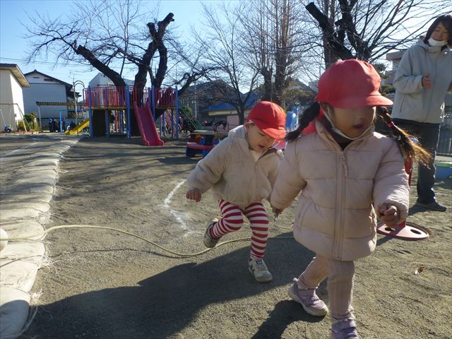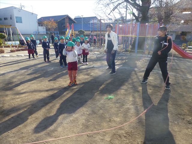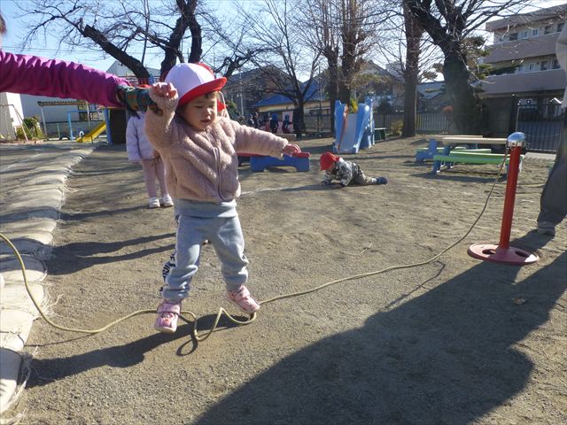 今日の朝の活動は、第2学期最後の「やんちゃ怪獣どかーん体操」と「サーキットトレーニング2」を行いました。朝からとても寒かったですが、みんな寒さなんかに負けず、全員が体操もサーキットも頑張りました。サーキットトレーニングでは、年長さんが「鉄棒」と「雲梯」を行い、年中さんが「長縄跳び」、年少さんが「なわとび」、 たんぽぽさんが、「ジャンプ遊び」を行い、みんな張り切って今年最後の運動を頑張り、「運動納め」をしました。(^_^;)えらい!えらい!(^_^)v ヘ(^o^)/