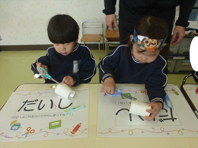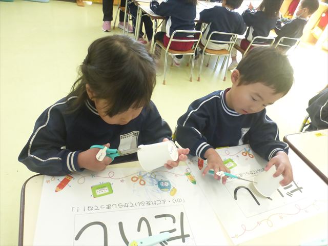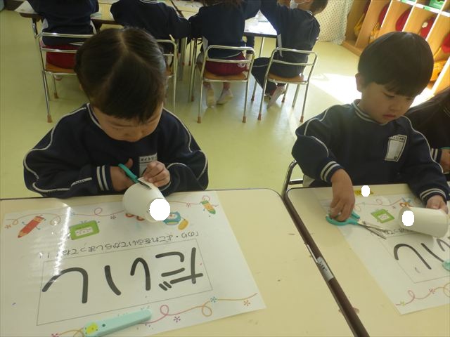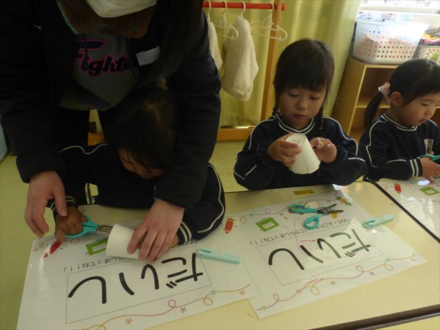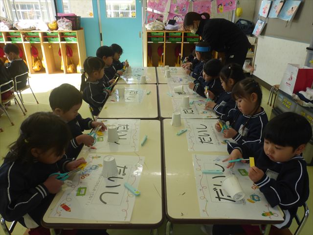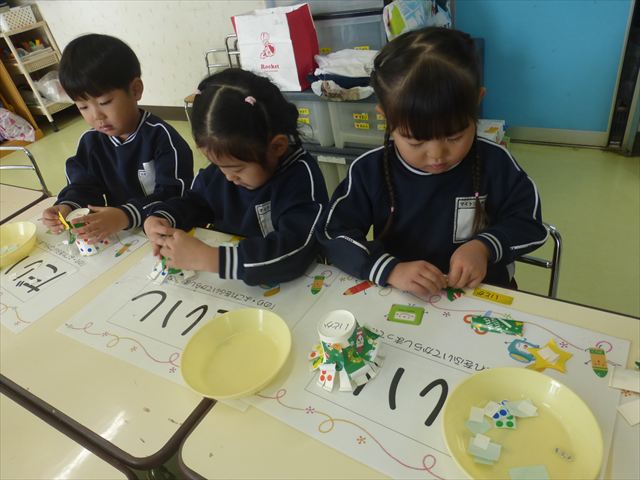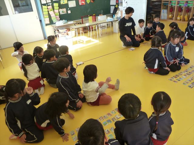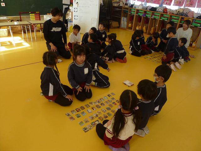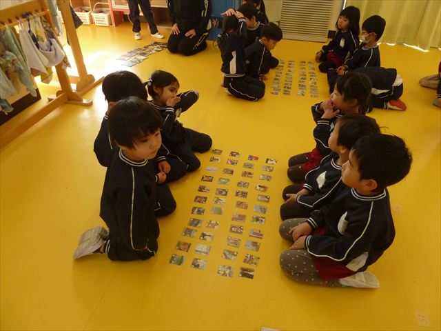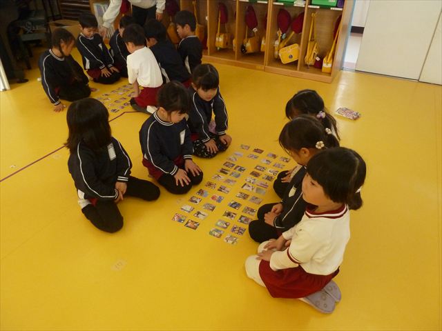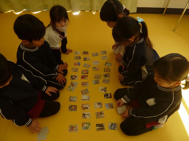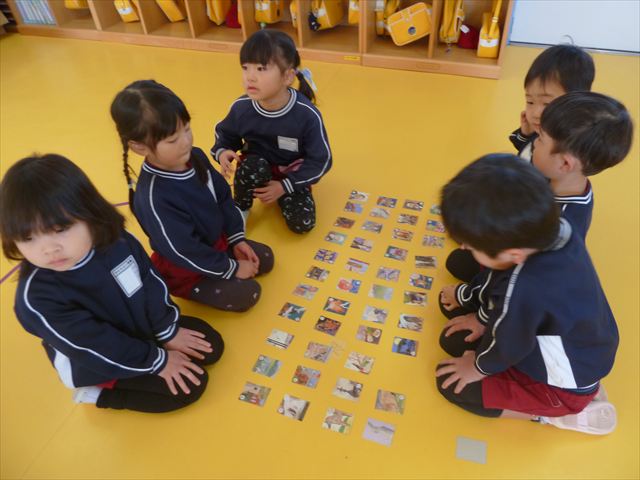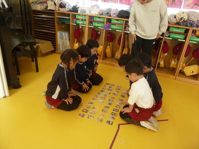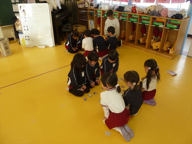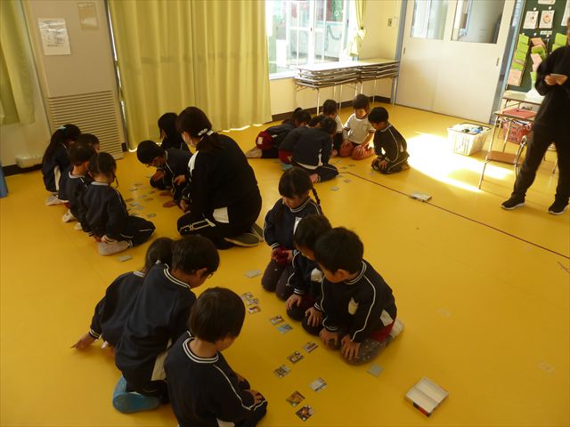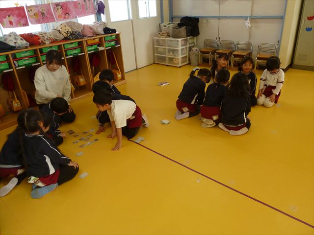 今日は2回目の「上毛かるた」をしました。前回に続き、ルールを確認しながら行い、新しく「お・か・め・き・け」や「す・も・の」の役札の説明もしました。まずは、上毛かるたに親しみ絵札を覚えることが勝利への道ですので、ご家庭でも楽しみながら上毛かるたをやってみて下さい。年中さんでも、ルールを守り自分が何枚取れたか数え、手ごたえを感じたり、悔しい気持ちになったりしながらも上毛かるたを楽しめているなと思います。
