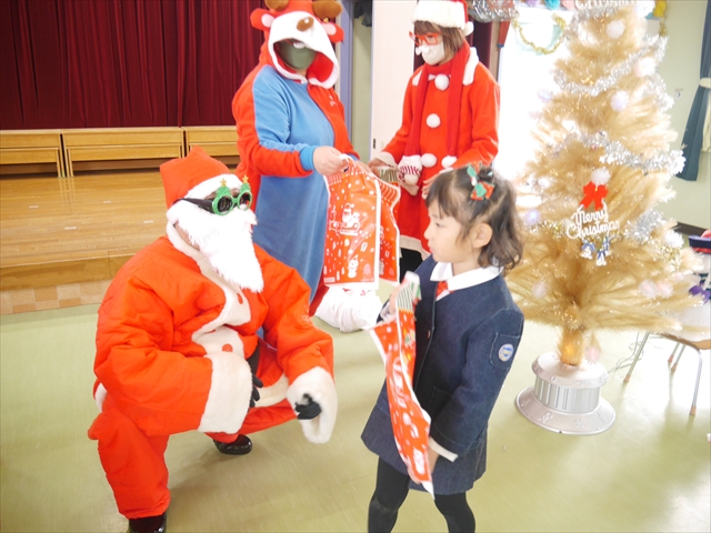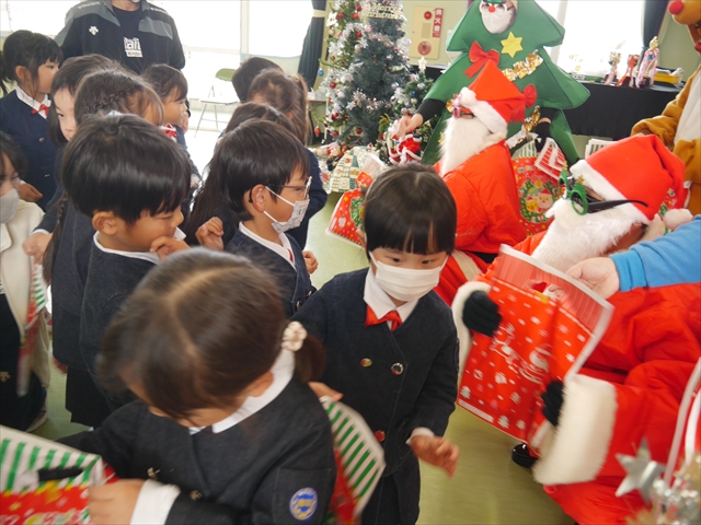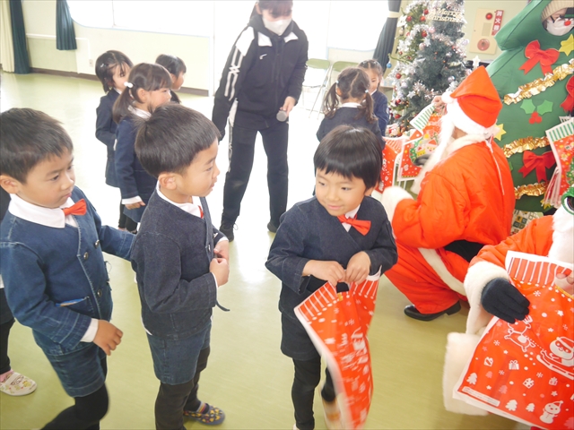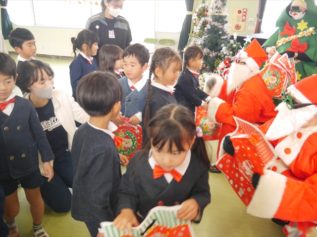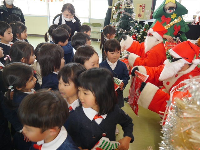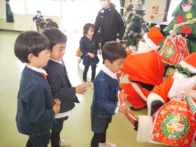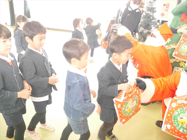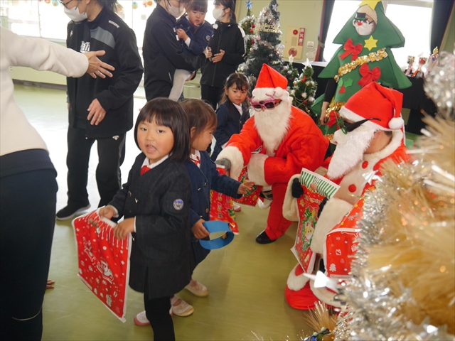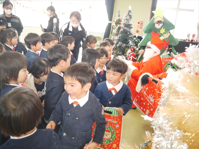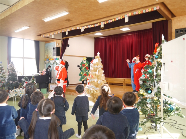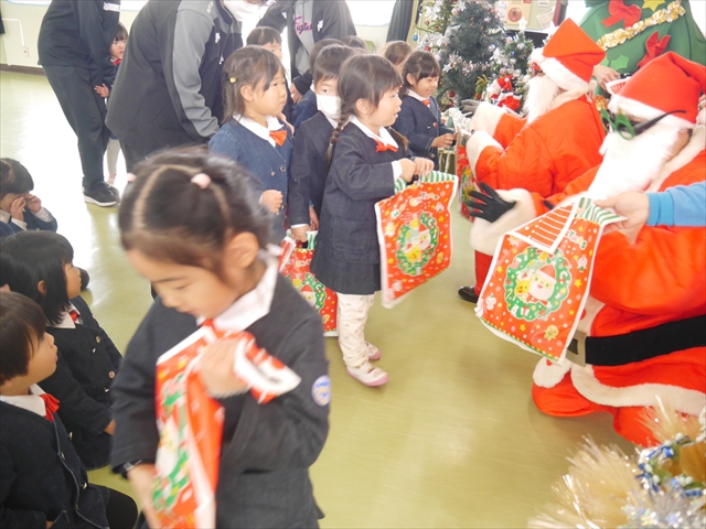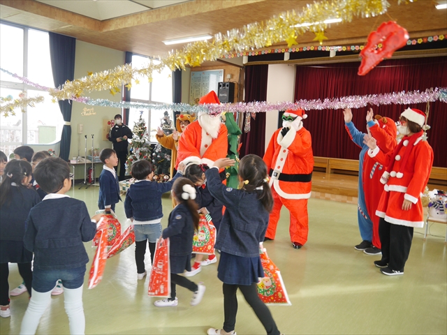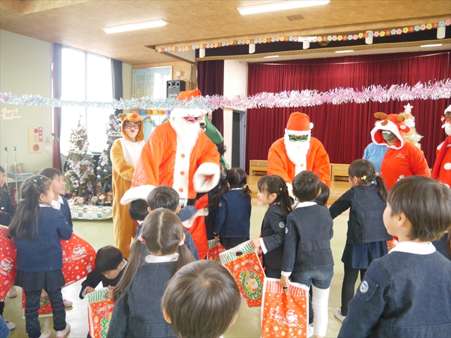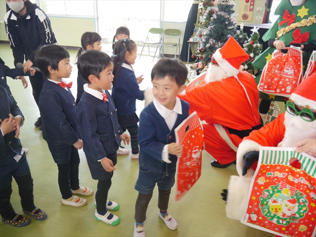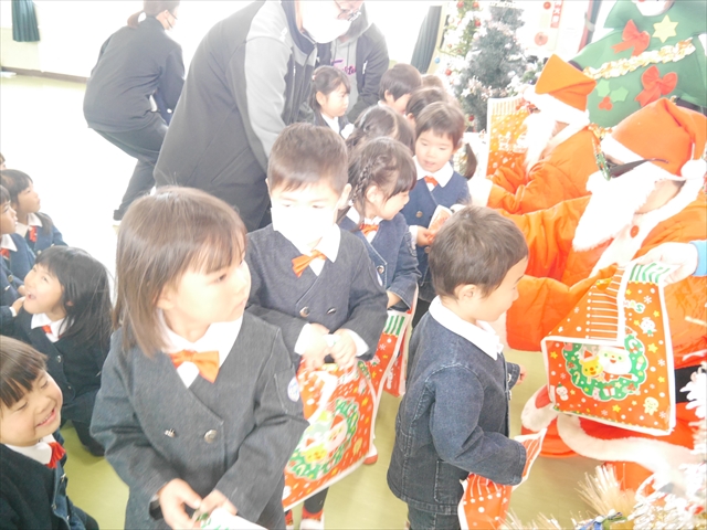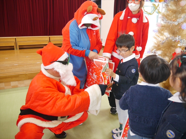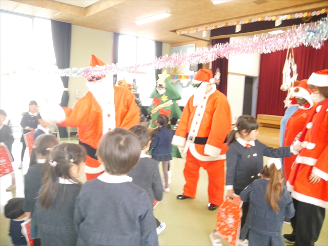 明日、24日はクリスマス・イブ!そこで「終業式」のあとに、何と1日早く「サンタクロース」がはるばるマイトリー幼稚園の子どもたちのところへやってきてくれました! そして、子どもたち一人一人に何と何と!!クリスマスプレゼントをくれたのです!!(プレゼントは、PTAからです!!本部役員さんがいろいろ考えてくれました。ありがとうございました!)