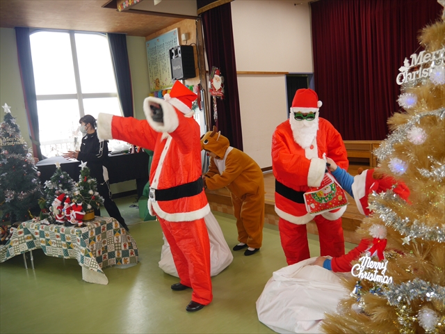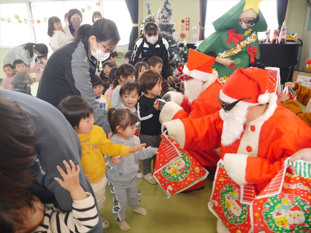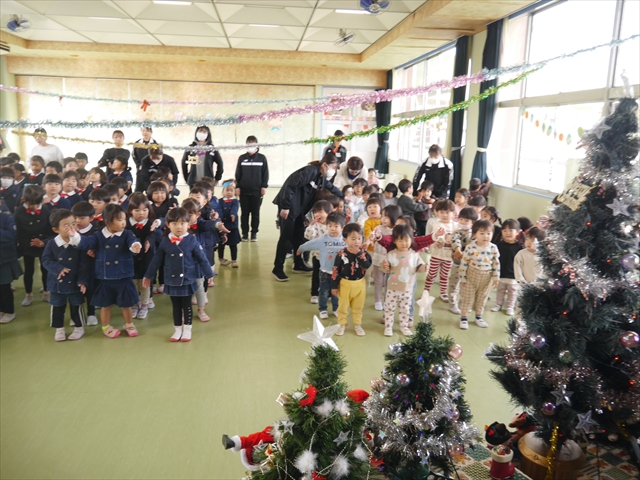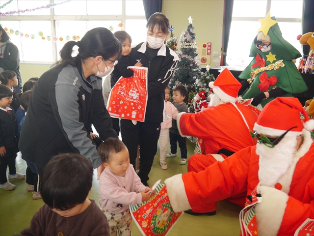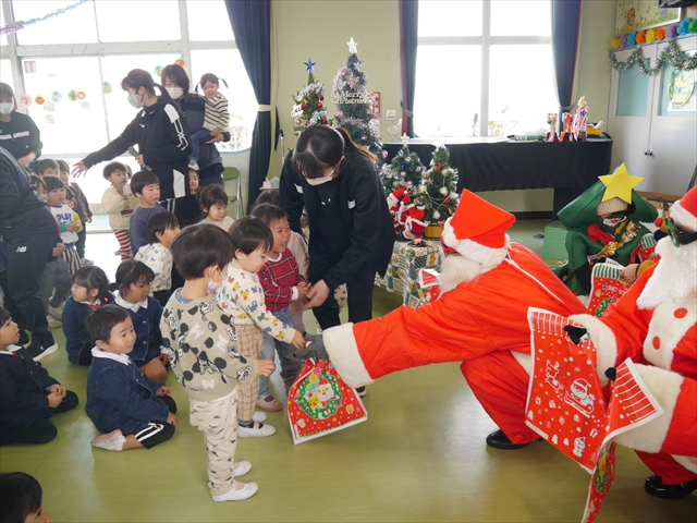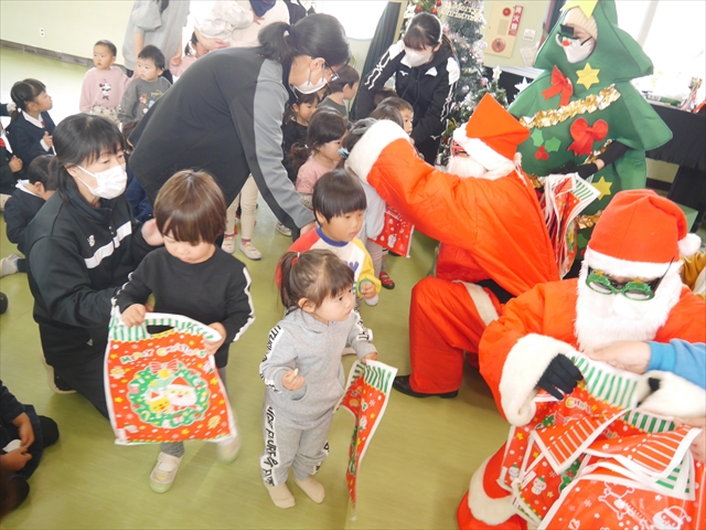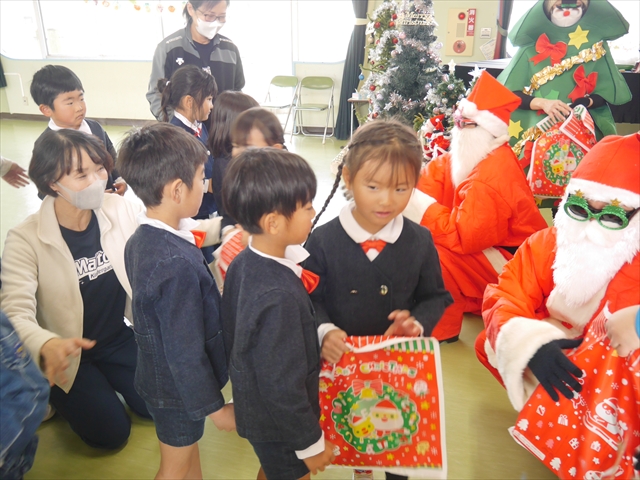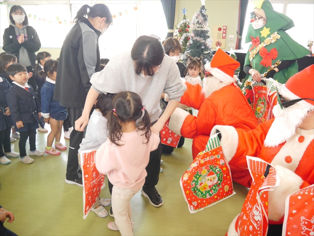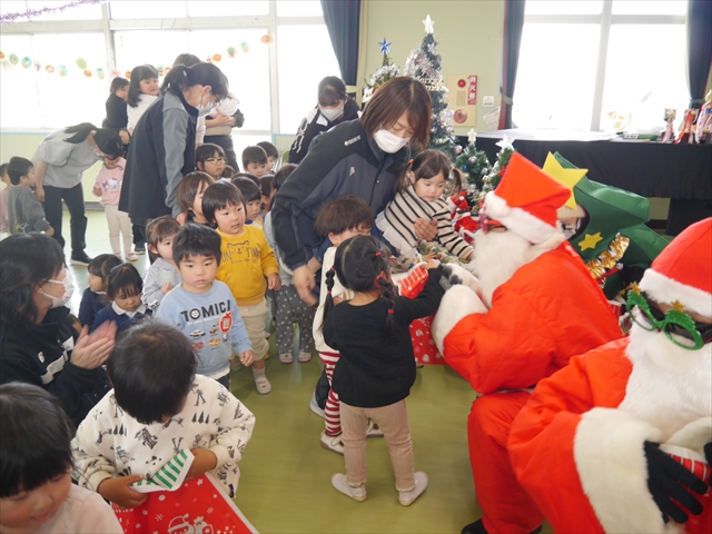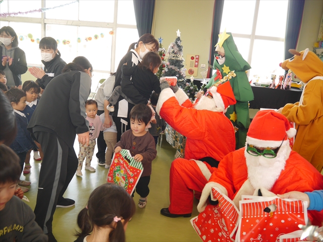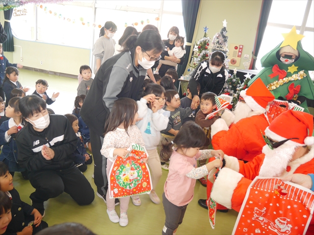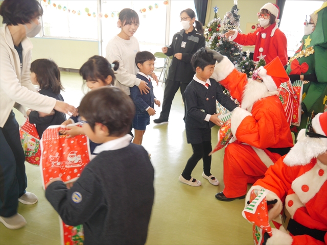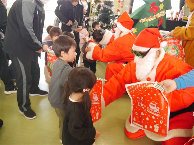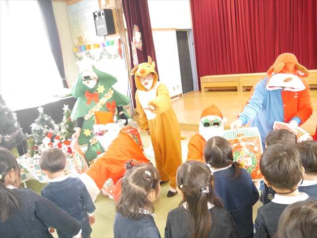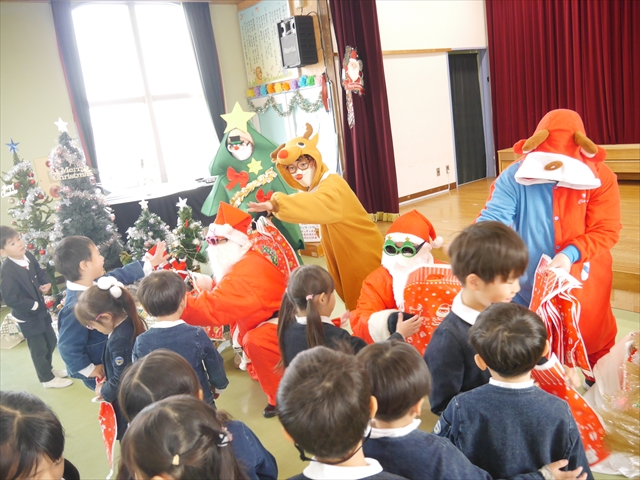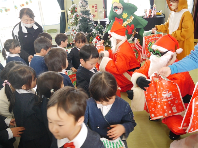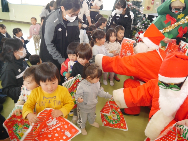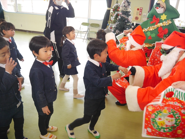 明日、24日はクリスマス・イブ!そこで「終業式」のあとに、何と1日早く「サンタクロース」がはるばるマイトリー幼稚園の子どもたちのところへやってきてくれました! そして、子どもたち一人一人に何と何と!!クリスマスプレゼントをくれたのです!!(プレゼントは、PTAからです!!本部役員さんがいろいろ考えてくれました。ありがとうございました!)