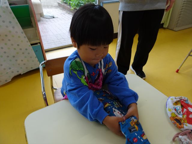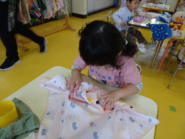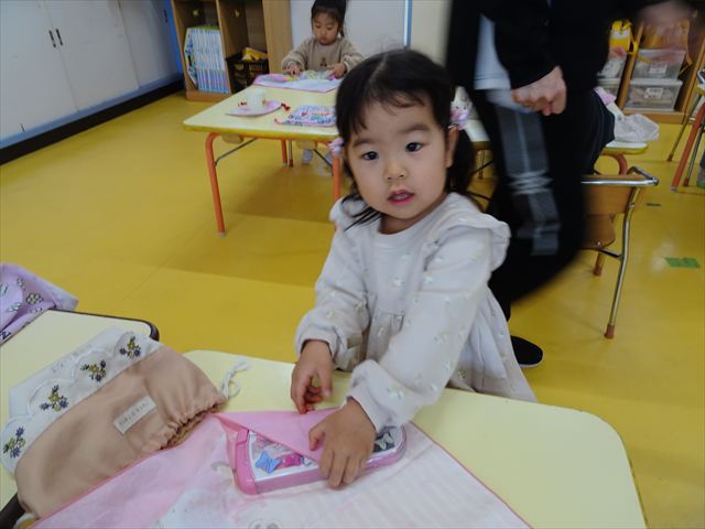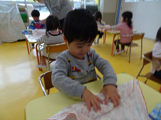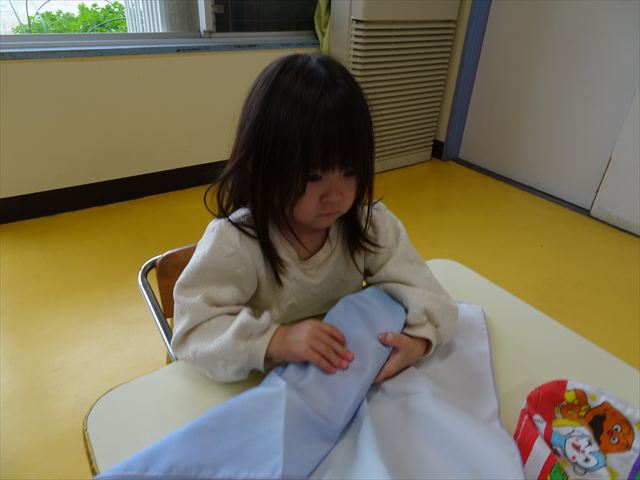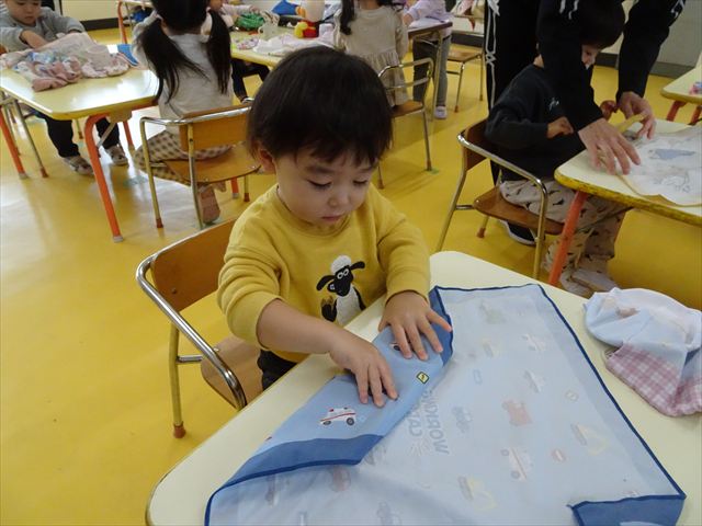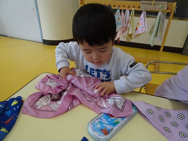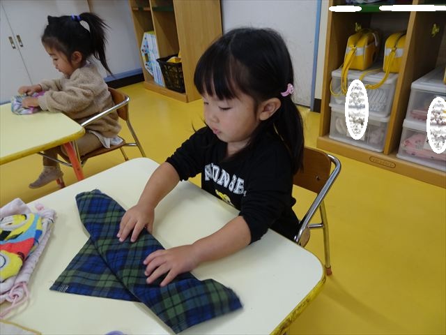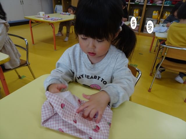 また、満2歳児さんも今日一緒に包む練習をしましたが、今後はその子の状況に応じて包む練習をしていこうと思います。そのため、満2歳児さんは縛って持ってくるのではなく、今まで通り畳んで巾着の中に入れて持ってきていただけたらと思います。よろしくお願いいたします<(_ _)>