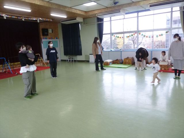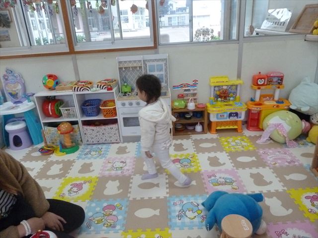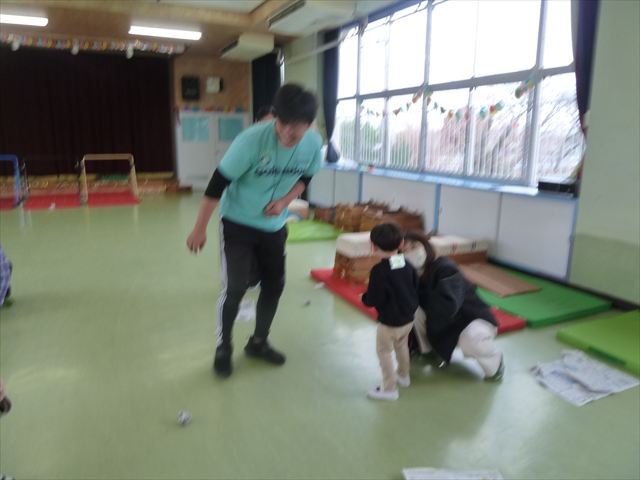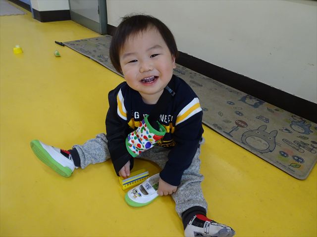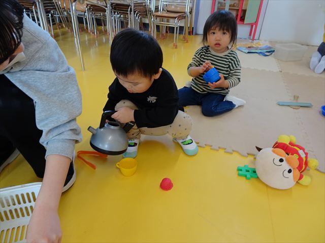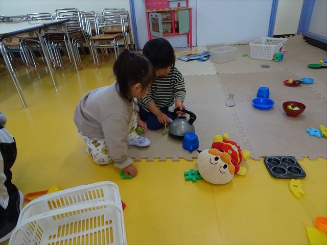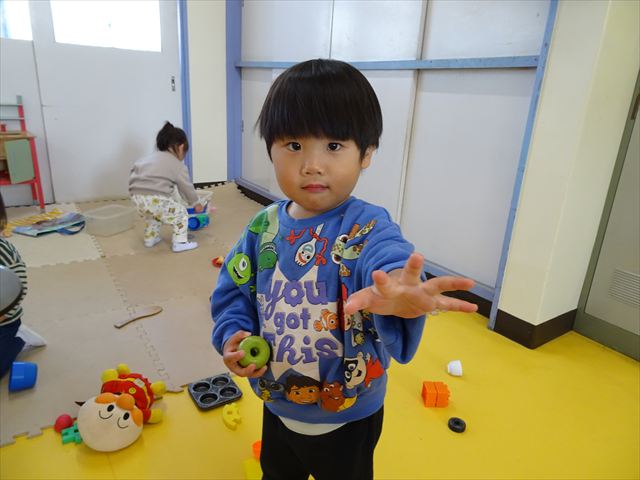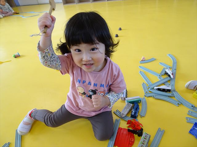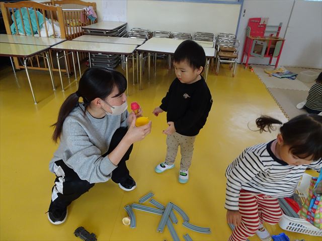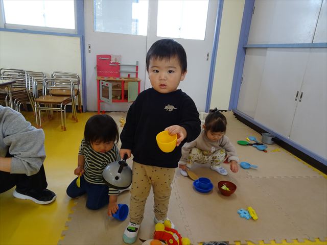 満2歳児さんは、自由遊びをしました!いつものA組B組とは違うお部屋で、普段遊べないおもちゃもたくさん♪お友だちや先生と一緒に楽しく遊んでいました(